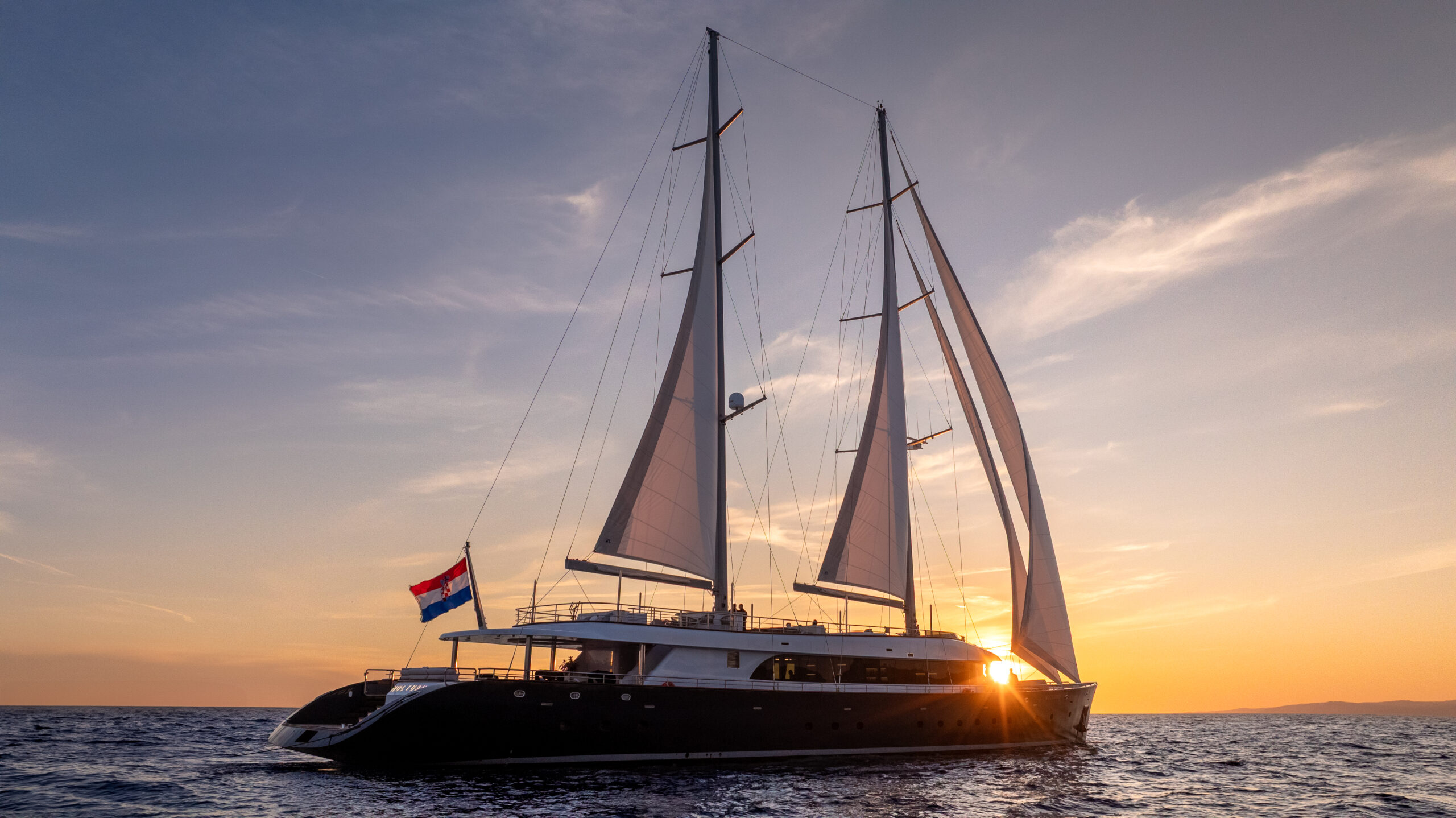 Nocturno ist ein 48,3 m (158’5”) großer Luxus-Motorsegler von 2023, der klare Moderne mit entspanntem Adriatic-Lifestyle verbindet. Weitläufige Außenbereiche bieten ein schattiges Achterdeck zum Essen sowie ein Panoramasonnendeck mit zweitem Essplatz, Bar, Freizeitbereich und Jacuzzi. Der helle, elegante Salon dient als komfortabler Rückzugsort zu jeder Tageszeit. Die Unterbringung umfasst 12 Gäste in 6 Kabinen—eine Master- und VIP-Suite (beide Kingsize) sowie flexible, konvertierbare Kabinen—betreut von einer neunköpfigen Crew.