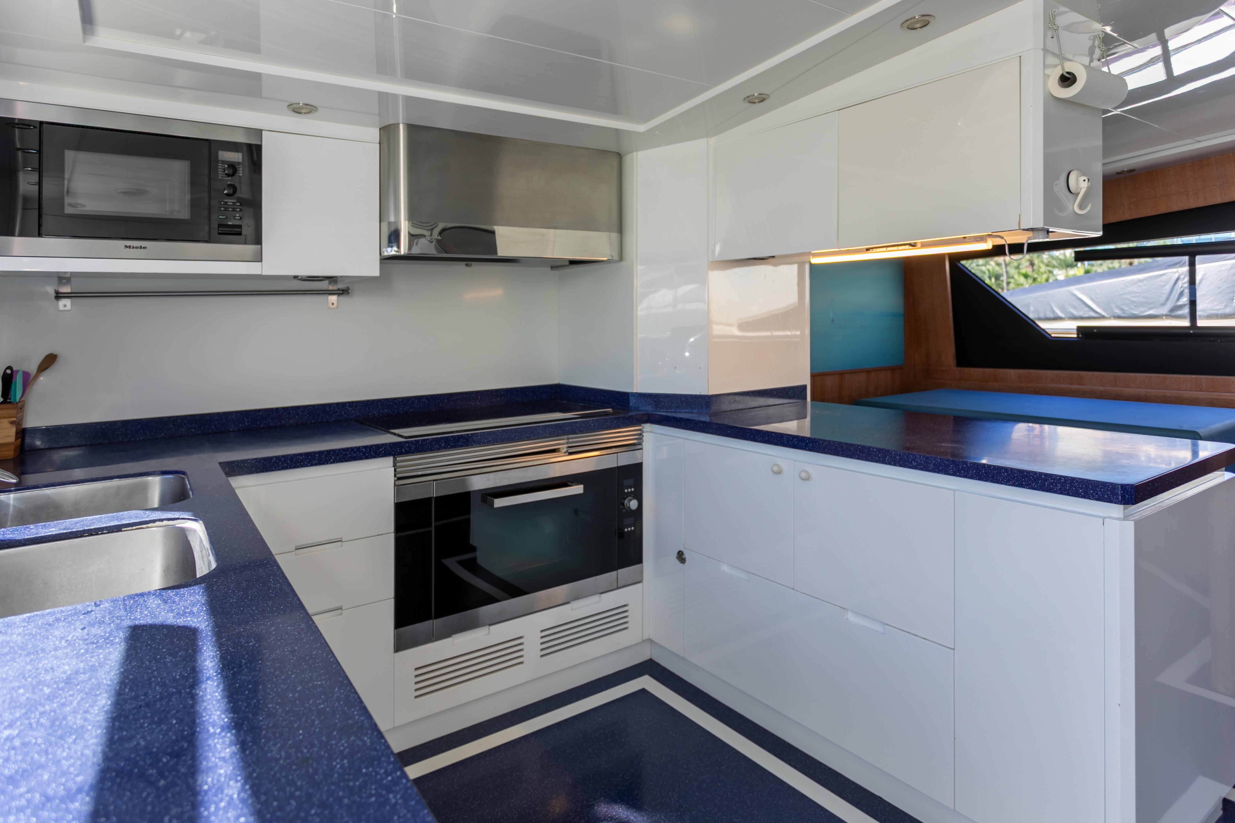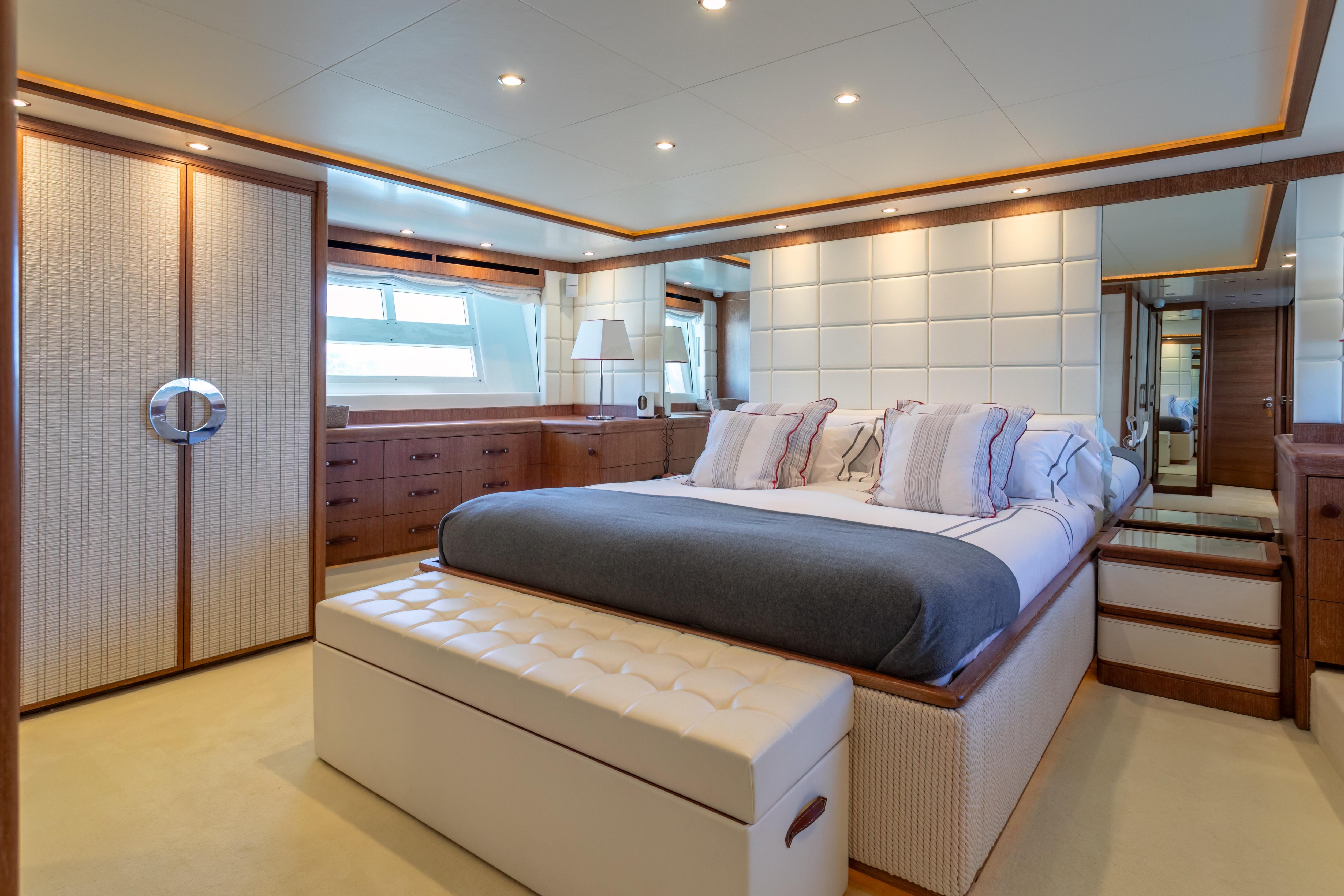 The main salon is a luxurious space with seating areas and a bar. The layout includes a separate dining galley and the primary helm station at the front. Below deck, the yacht features four stylish cabins, each with an en-suite bathroom, designed for utmost privacy and comfort. The configuration includes a full-beam master suite, two twin cabins, and a twin cabin with an additional Pullman bed on the starboard side.