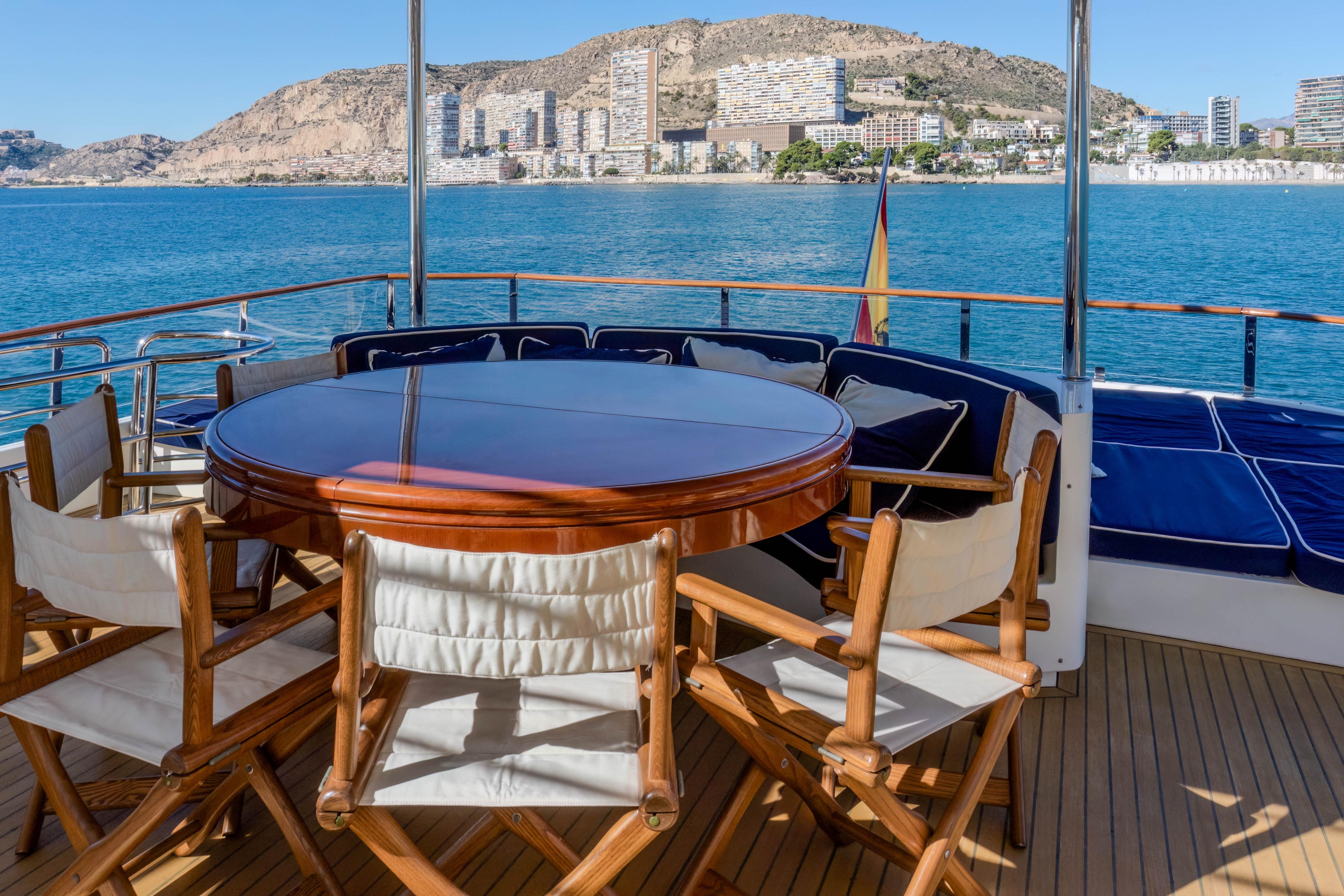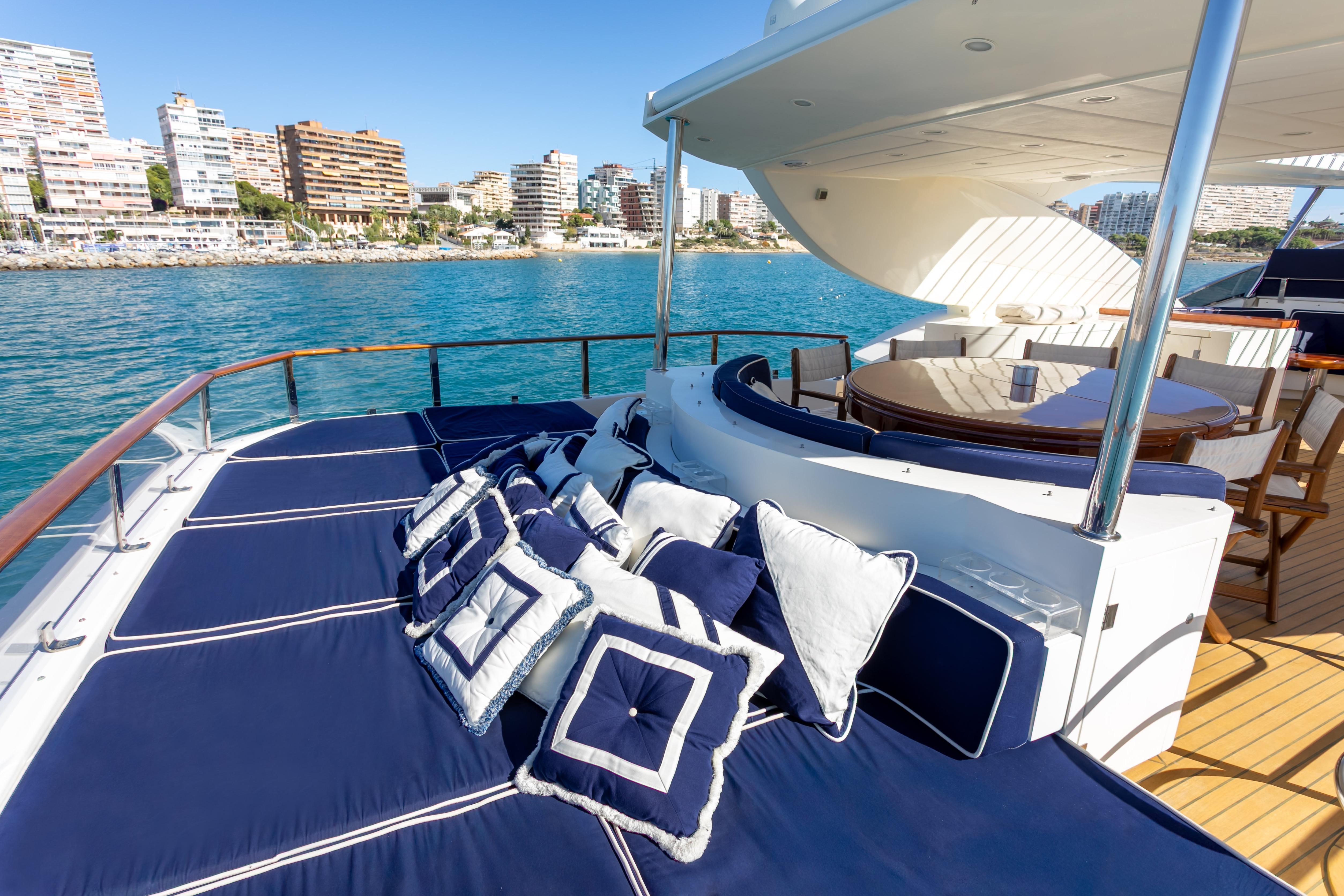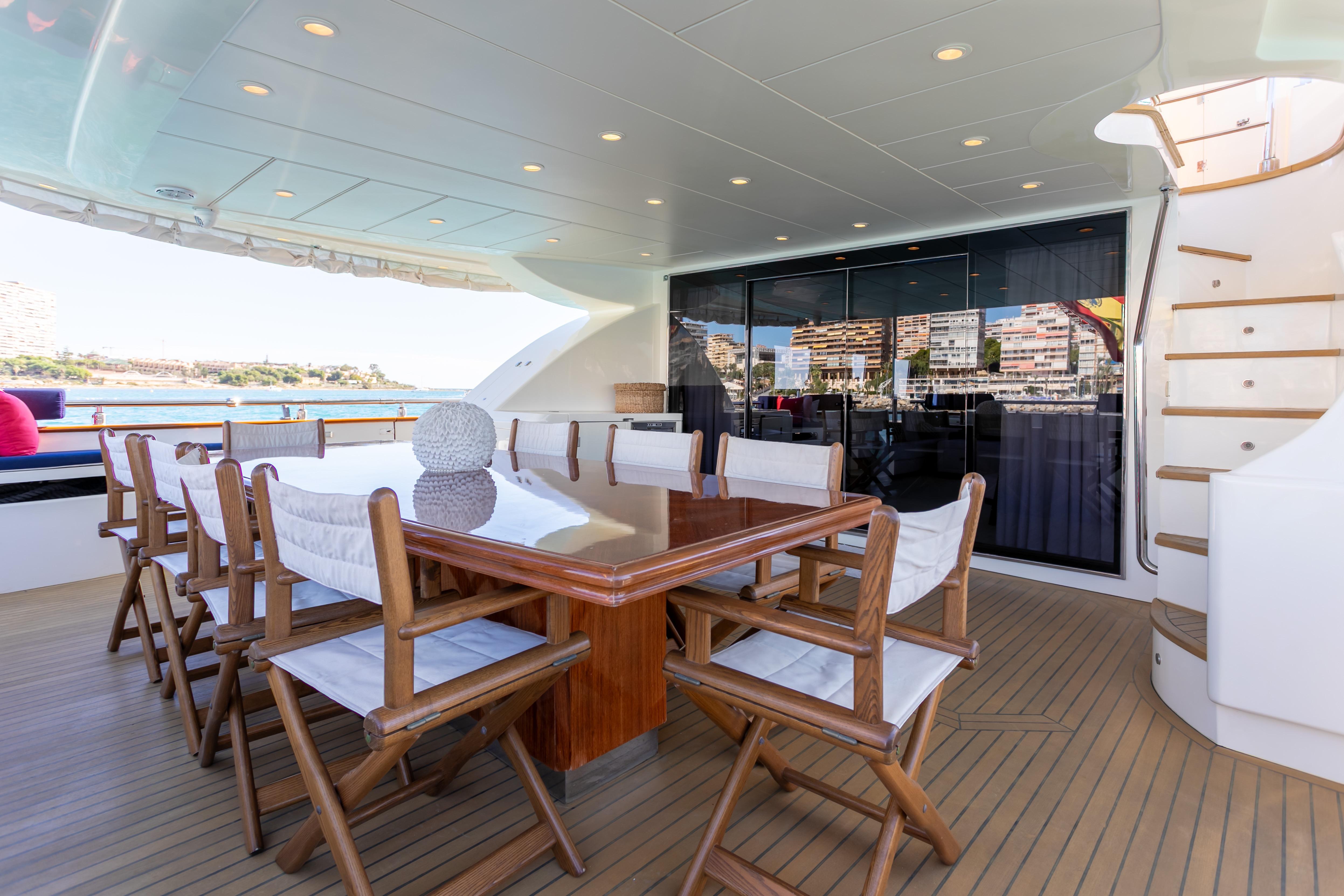 On the exterior, B TWO offers multiple areas for relaxation and entertainment. The sun deck features built-in sofas around coffee tables, a secondary helm station at the bow with additional seating, a semi-circular dining area under a hardtop, and aft sun loungers. The forward deck is ideal for sunbathing, complete with two tiers of sunbeds and a cozy seating area with tables. The aft cockpit serves as the main alfresco dining space, shaded by the flybridge overhang and perfect for meals prepared by the onboard chef.