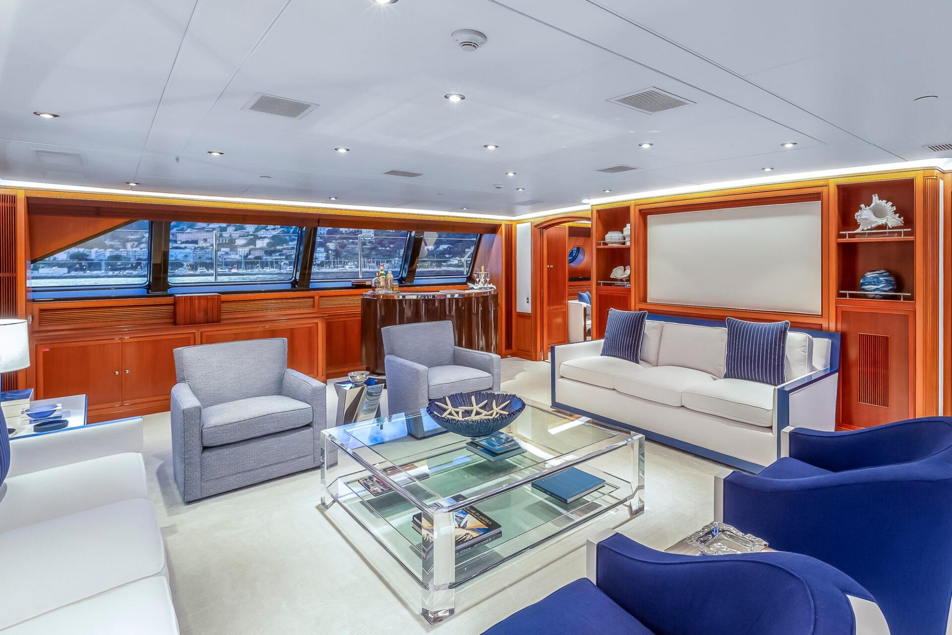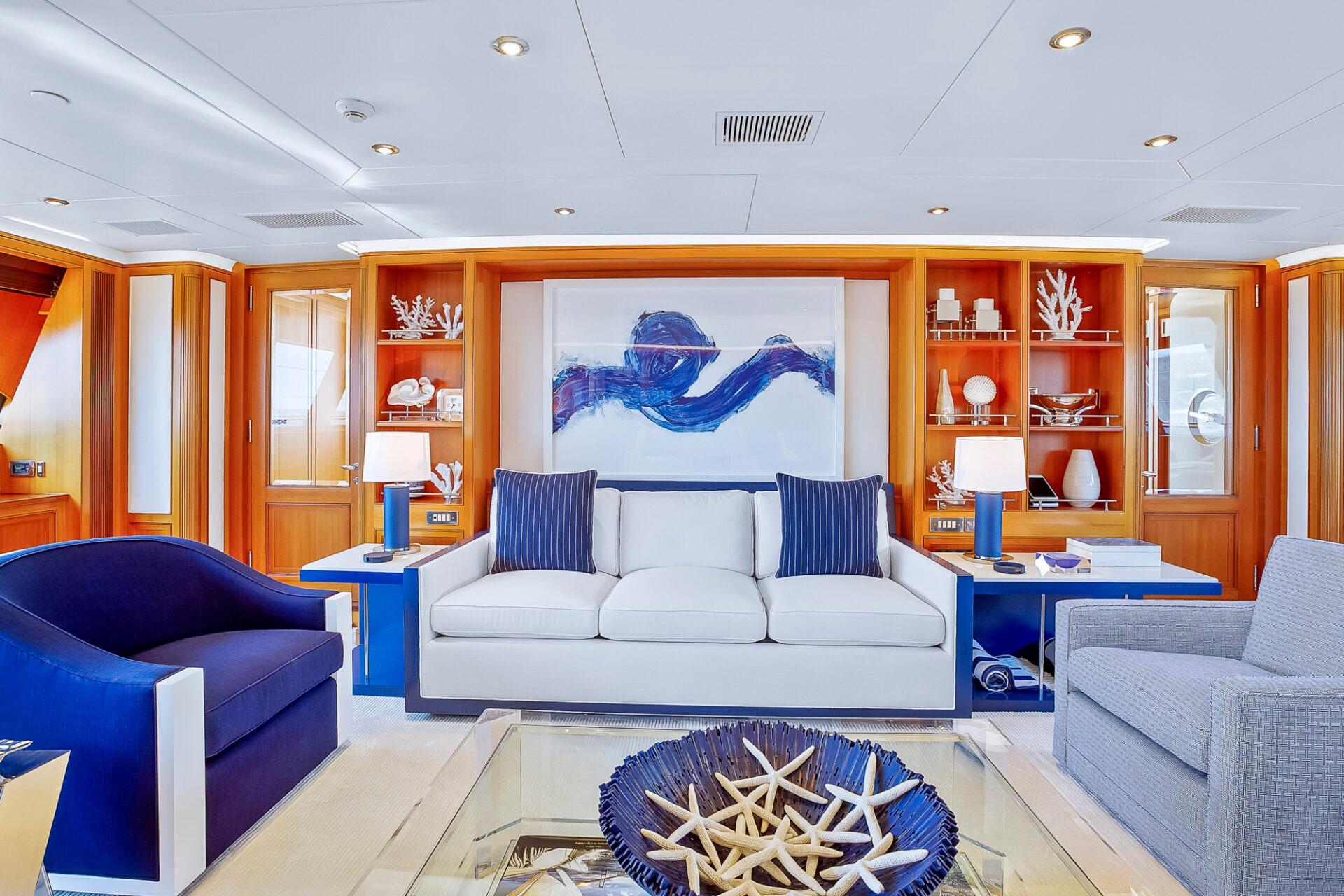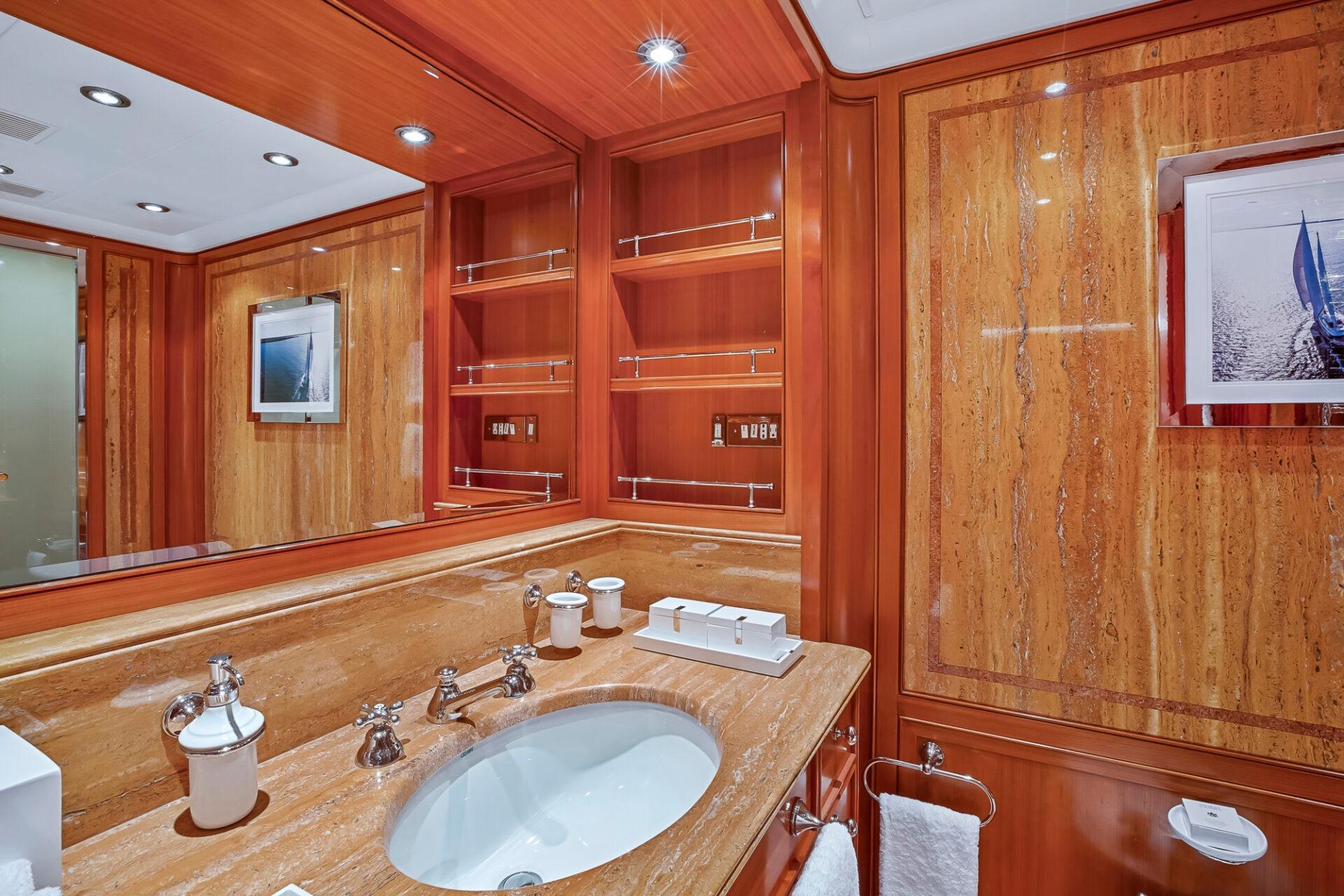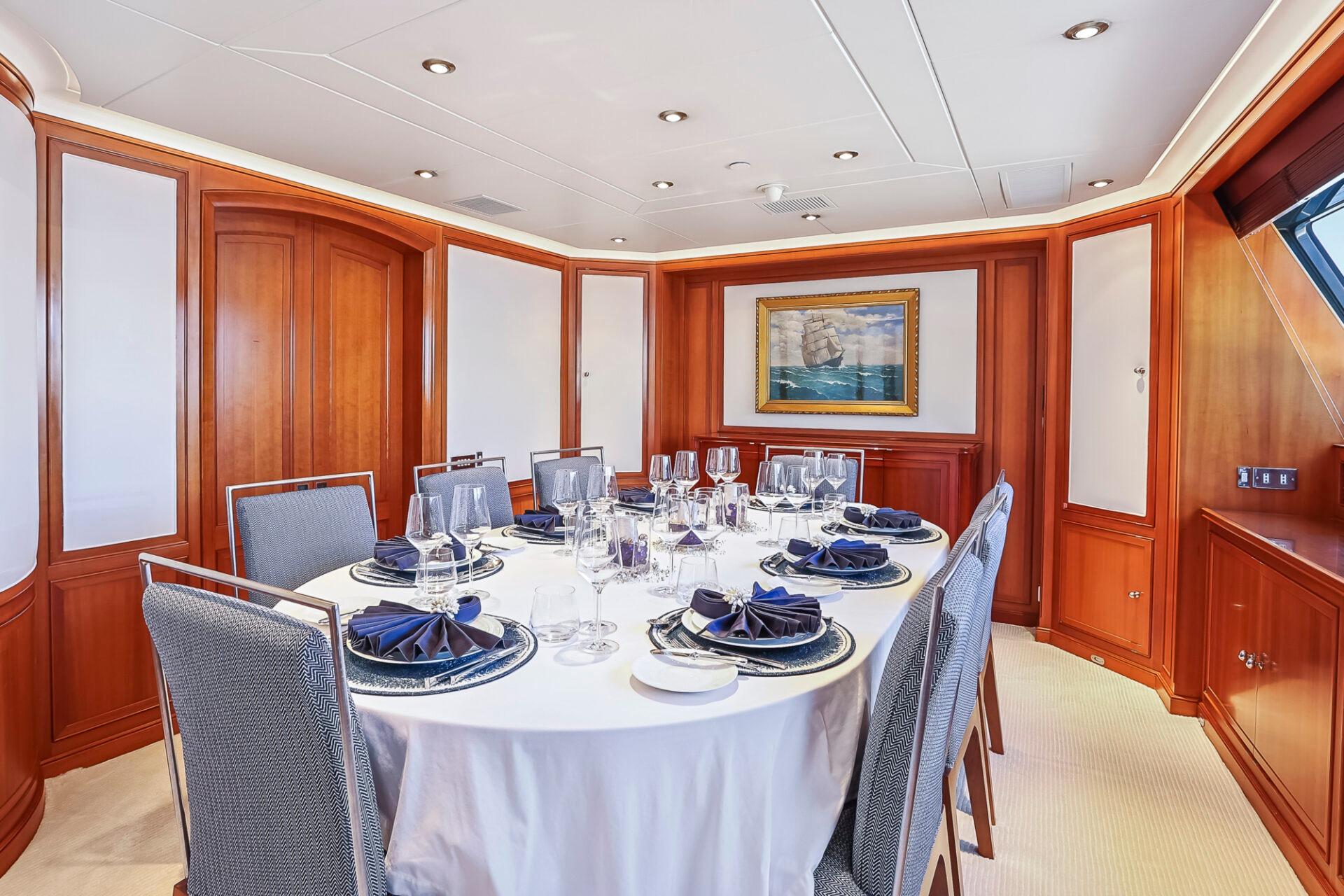 Her interior combines classic yachting elements with a refined palette of light wood varnishes, cream upholstery, and marine-inspired navy accents. Across her six cabins, the décor gracefully mirrors the colour scheme of the main salon and dining areas, creating a cohesive and elegant atmosphere throughout.