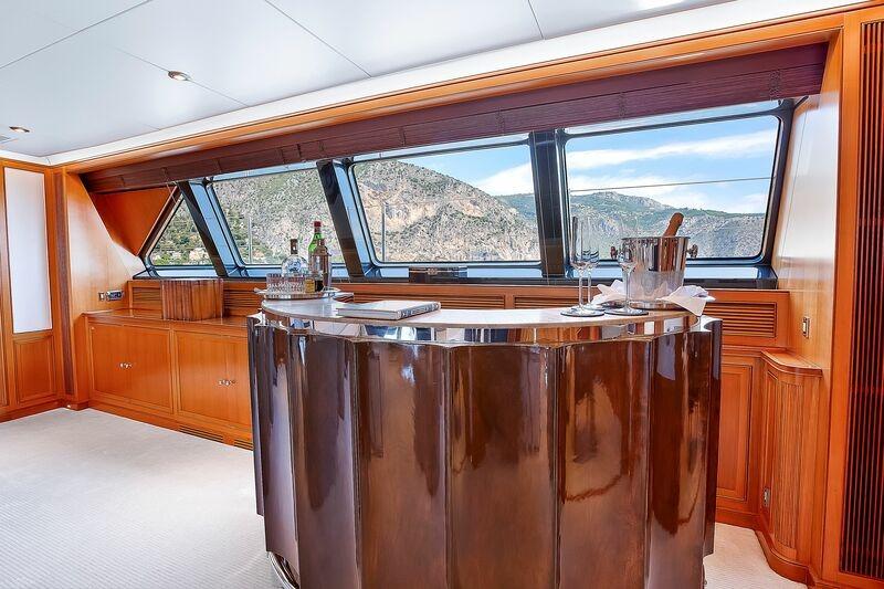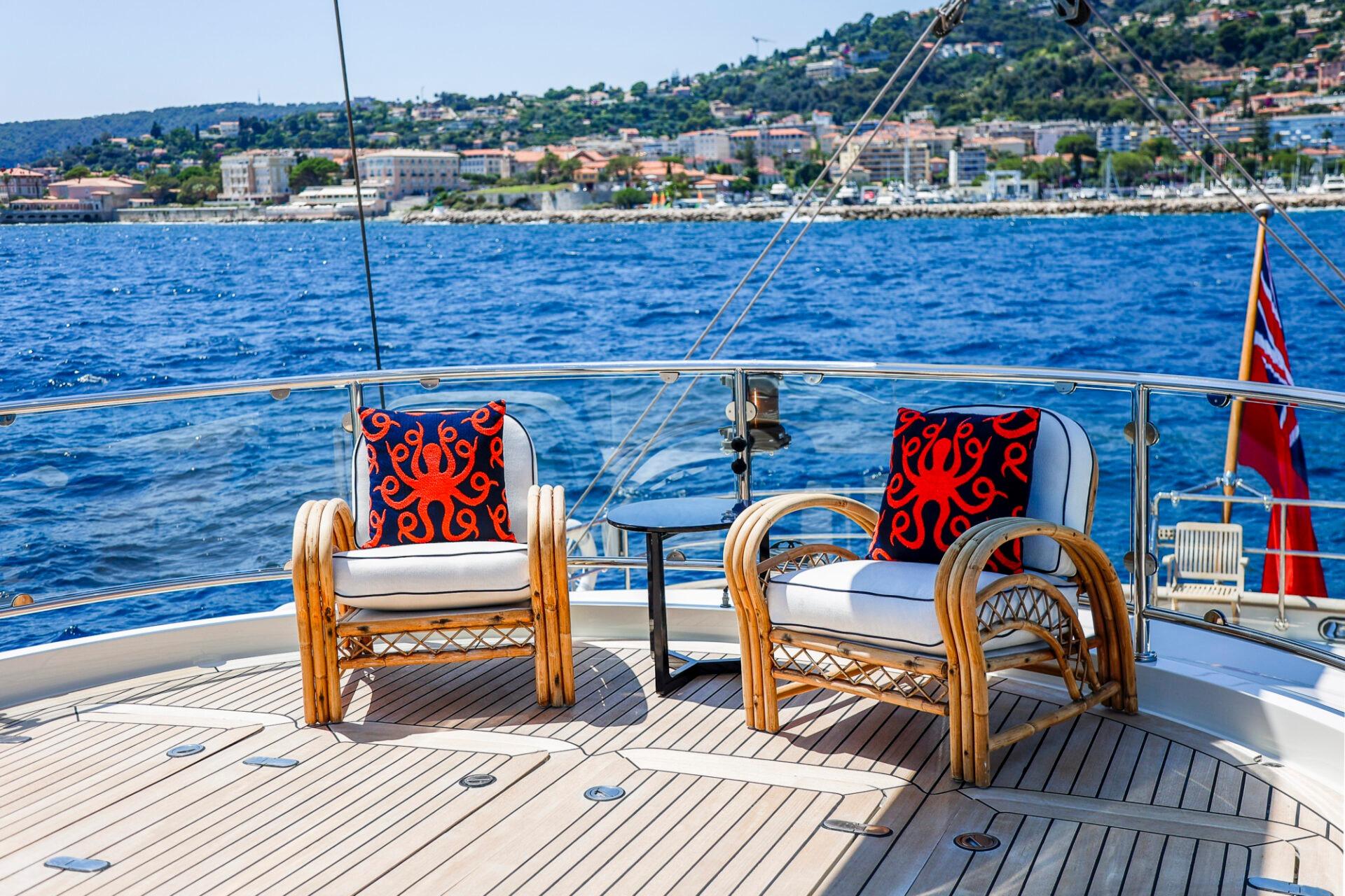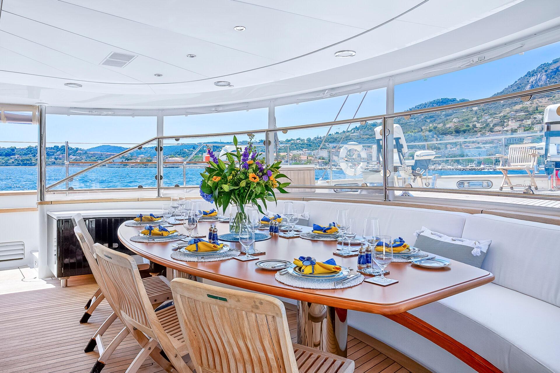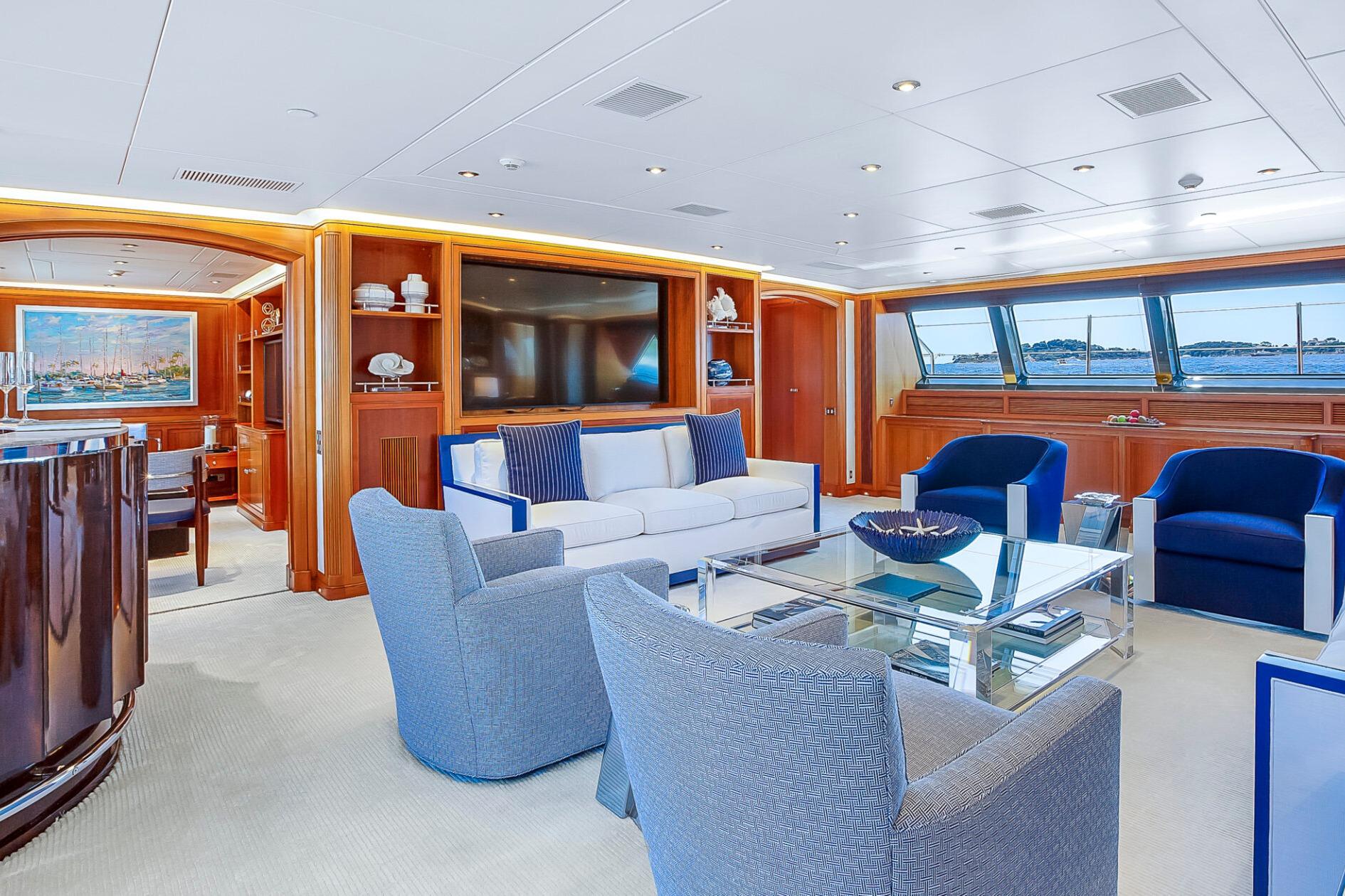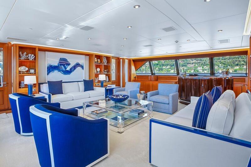 Her interior combines classic yachting elements with a refined palette of light wood varnishes, cream upholstery, and marine-inspired navy accents. Across her six cabins, the décor gracefully mirrors the colour scheme of the main salon and dining areas, creating a cohesive and elegant atmosphere throughout.