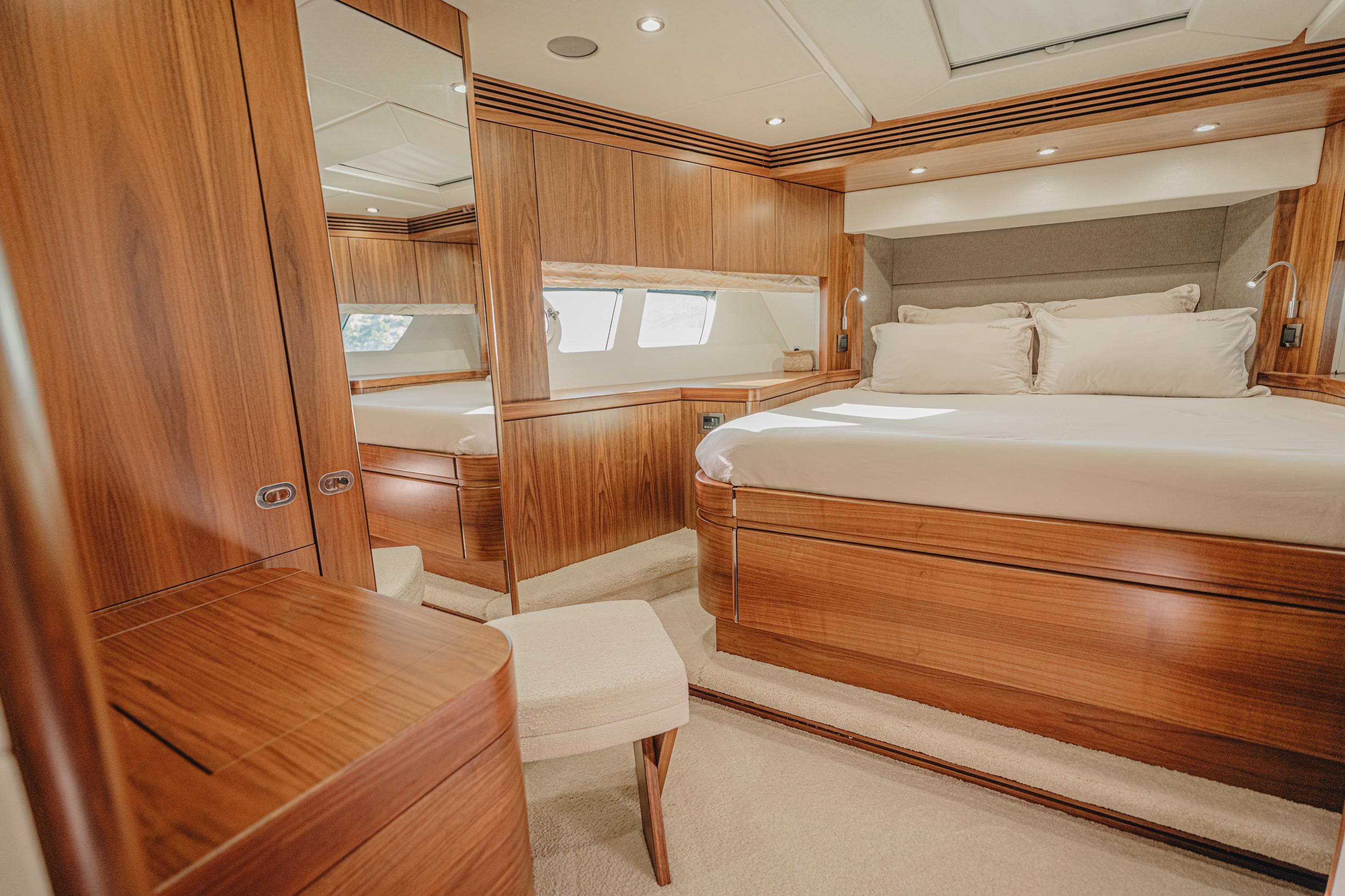 - Master Cabin: Full-beam amidships suite with king bed, ensuite bathroom, walk-in wardrobe, dressing area, and body-jet shower
