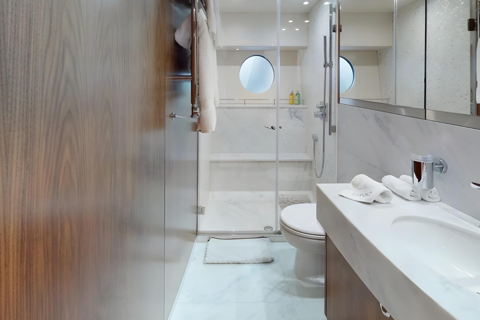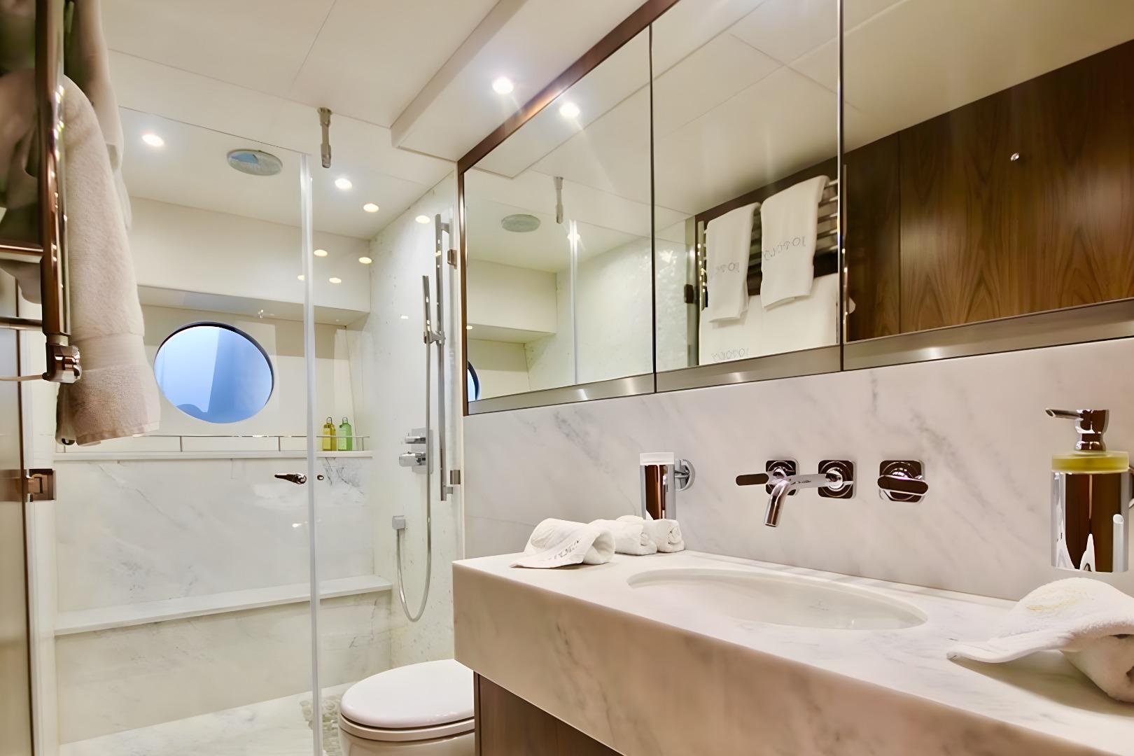- Master Cabin: Full-beam amidships suite with king bed, ensuite bathroom, walk-in wardrobe, dressing area, and body-jet shower