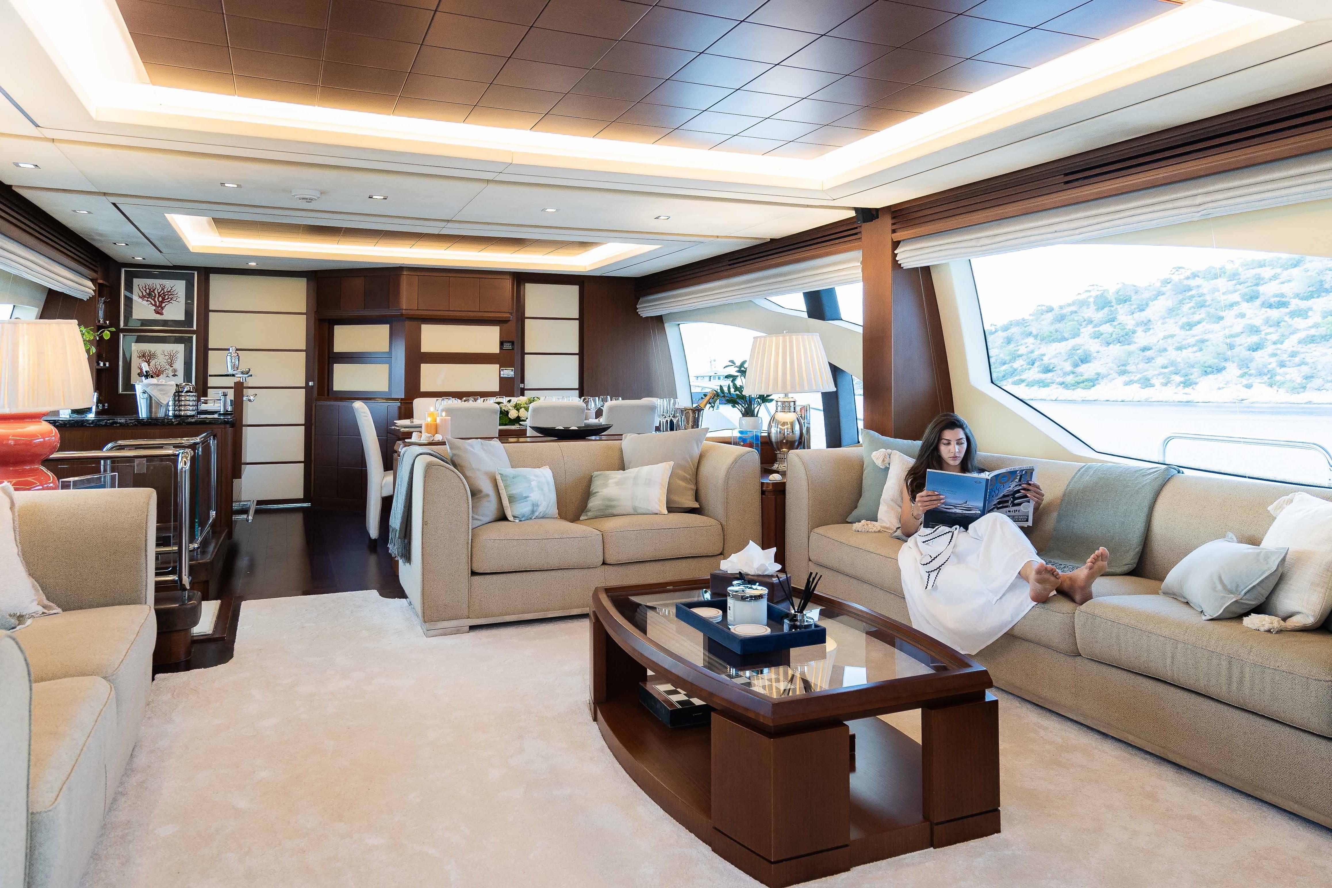 Designed by Carlo Galeazzi, the interior showcases a timeless interplay of dark woods and light, modern textiles. The main salon exudes understated glamour, with a full bar and a 50-inch TV for relaxed evenings on board.
