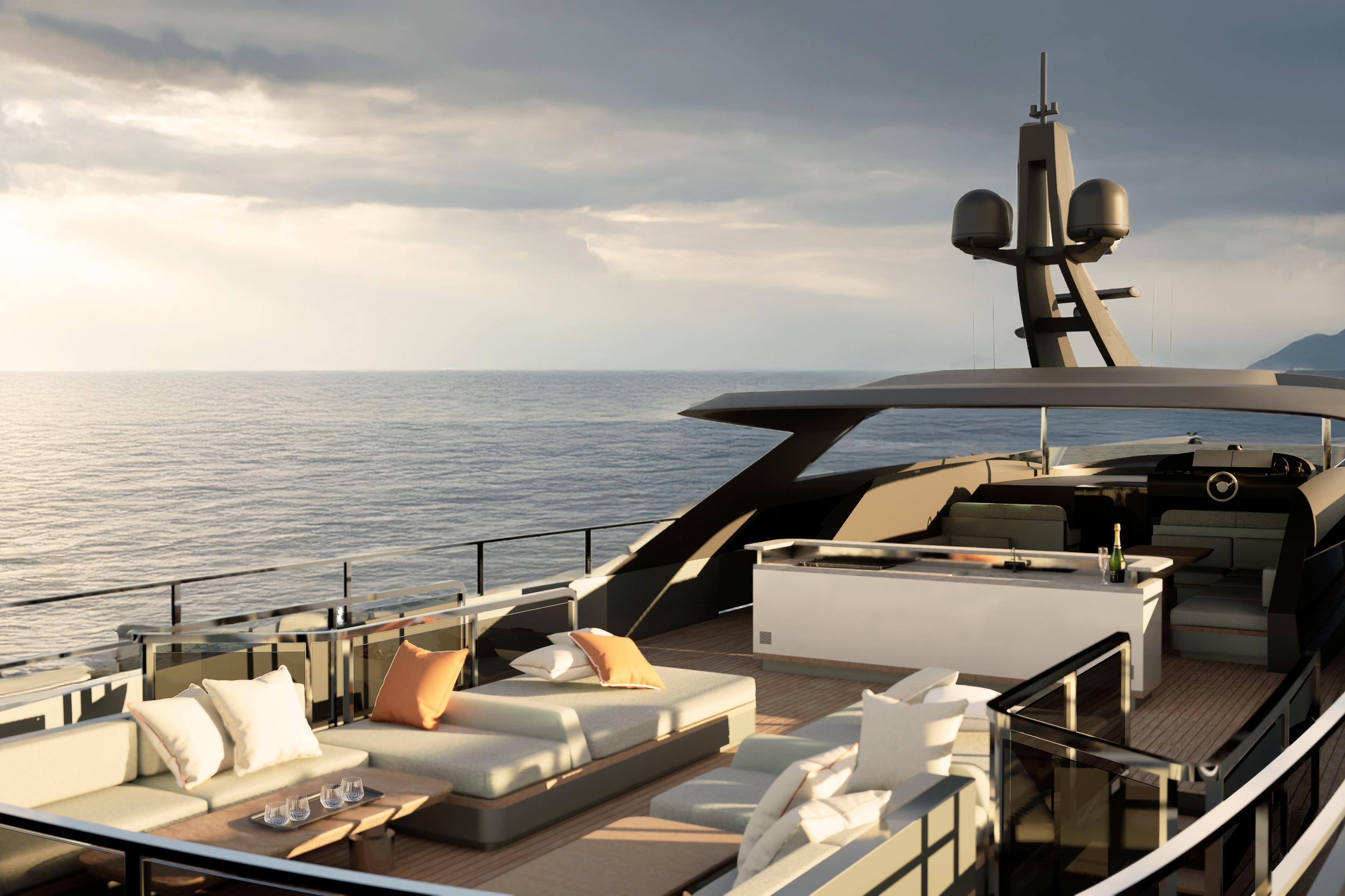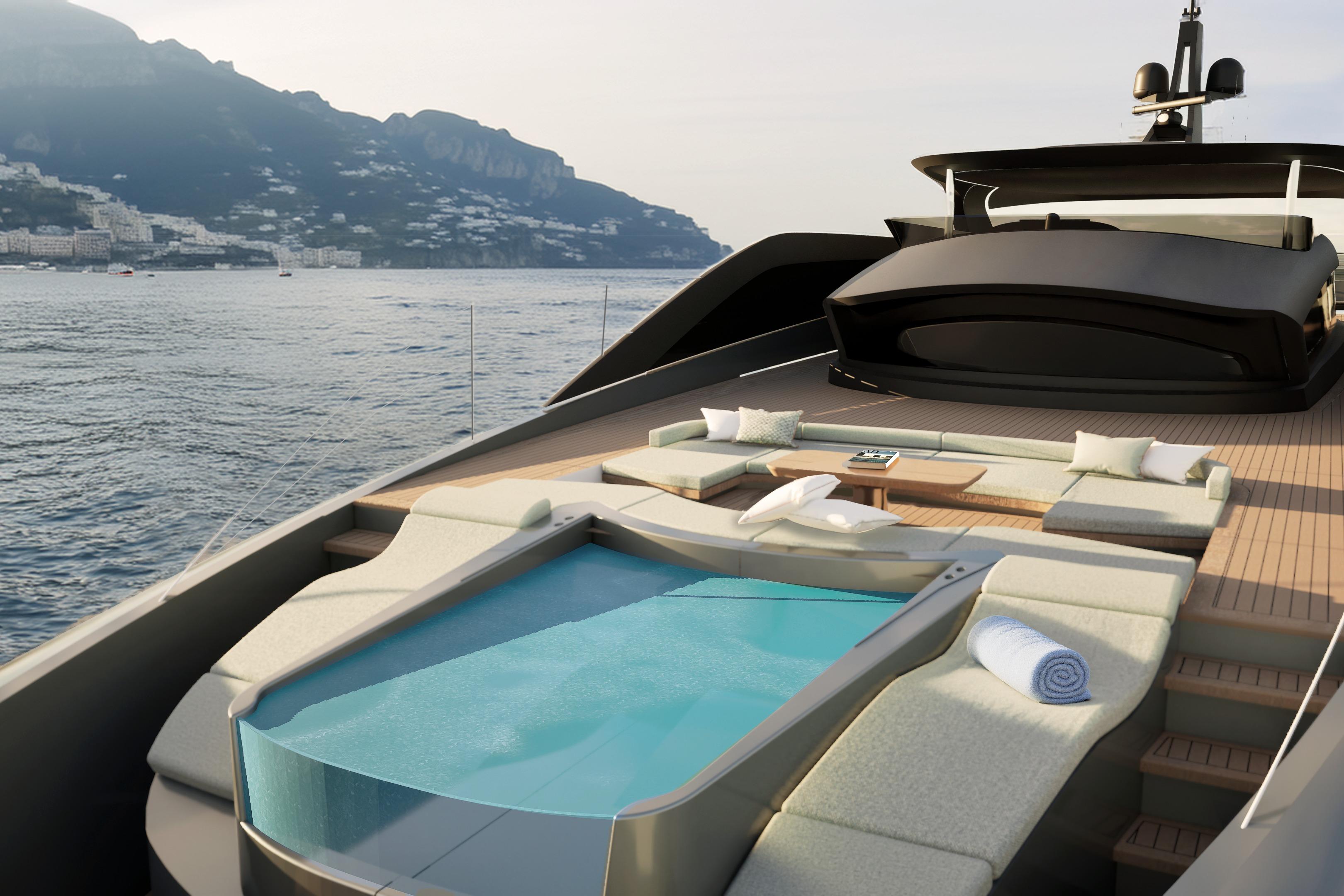 At the stern, fold-down bulwarks open onto the horizon, transforming the aft deck into a spacious terrace over the water. At the bow, a refined jacuzzi offers a place of relaxation, suspended between sky and sea.