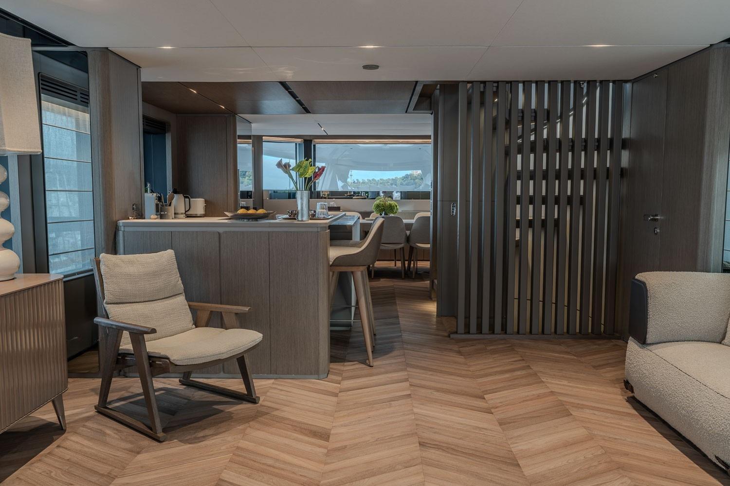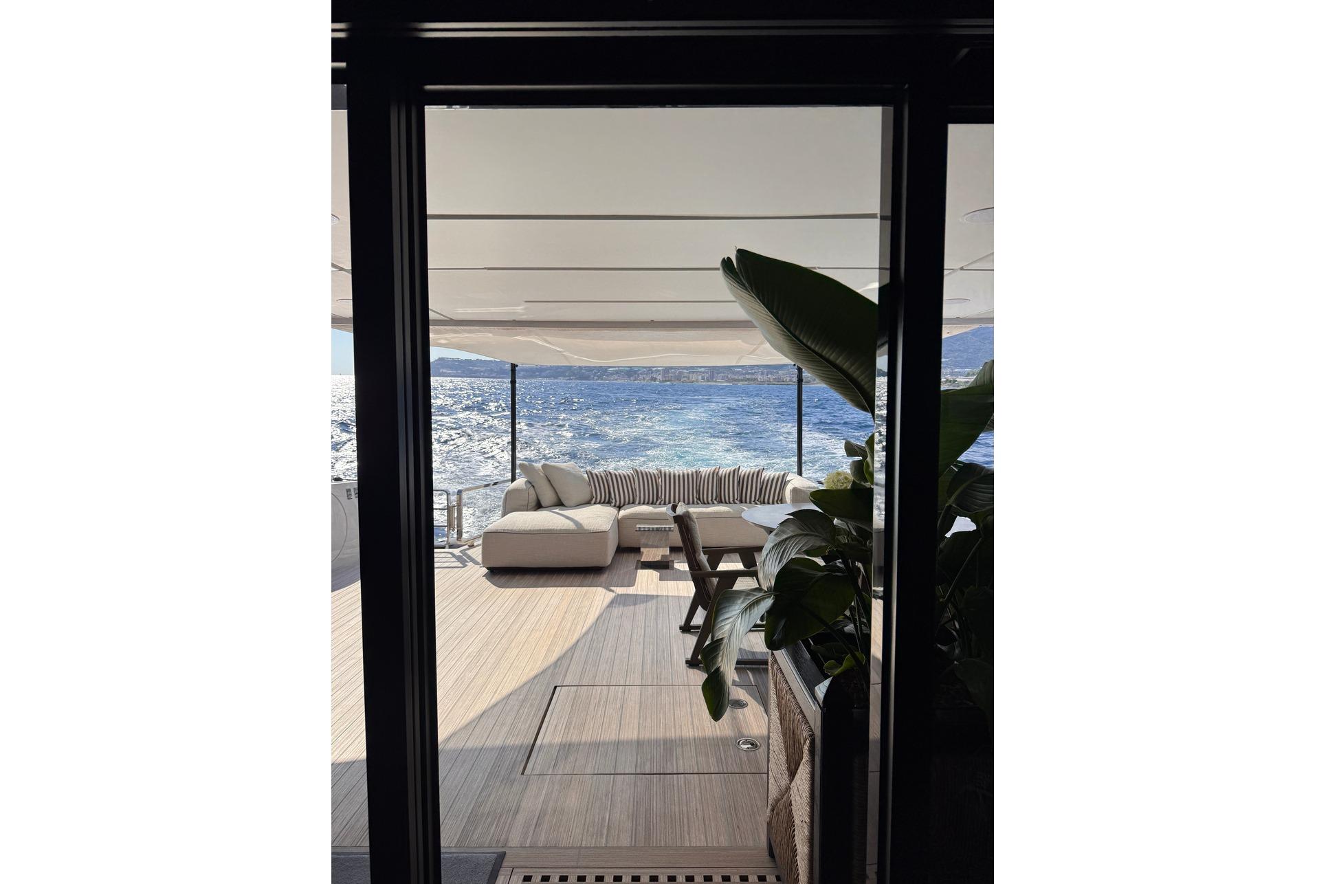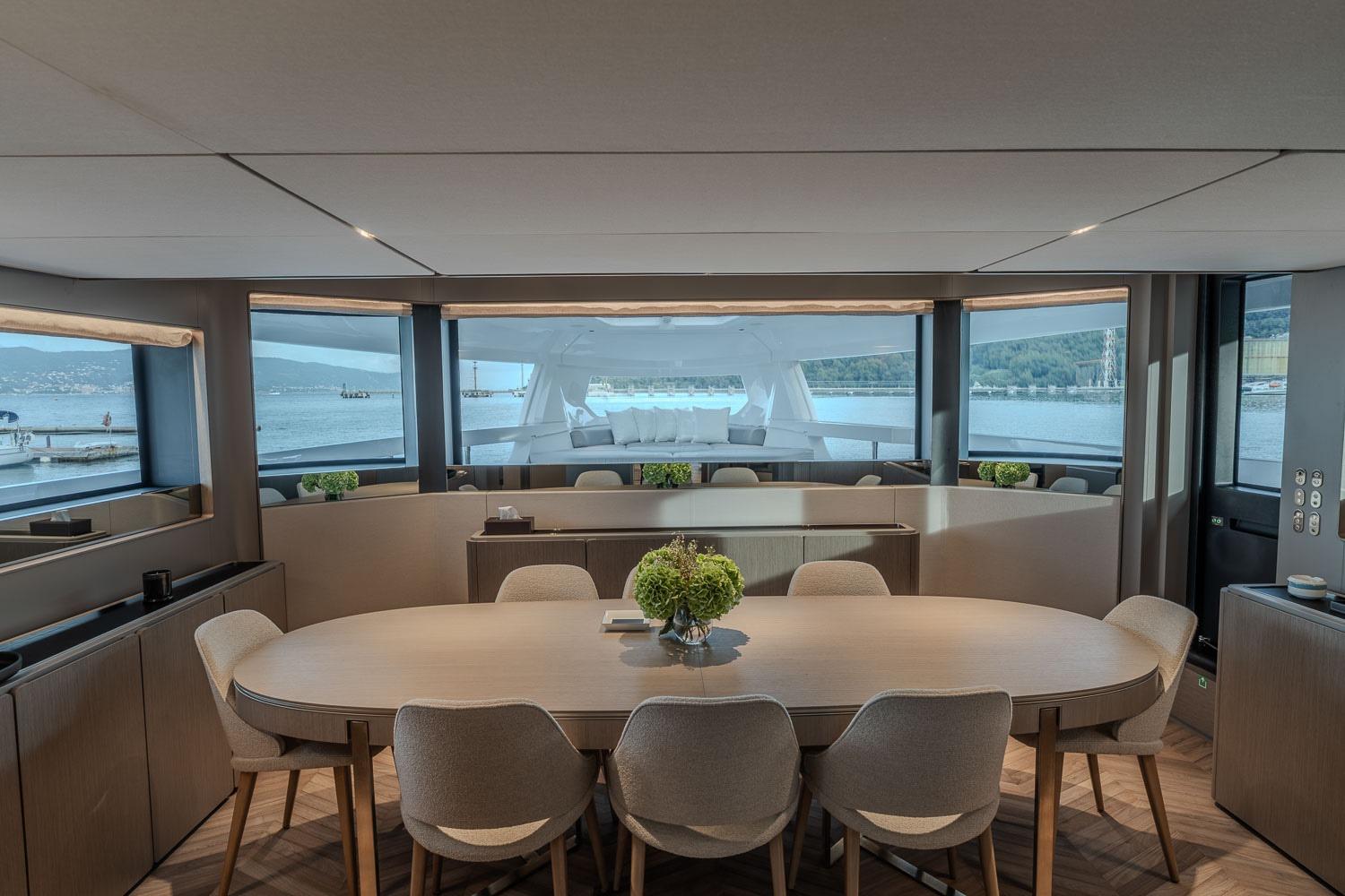 The galley is arranged in an open-plan format with the dining area, with direct access to the All-Season Terrace, a sheltered outdoor area usable in varying weather conditions. This unique terrace is equipped with a lounge area featuring a wide cushioned sunbed with backrest pillows, protected by overhead glazing and framed by side openings for natural airflow. The window can be lowered to seamlessly connect the terrace with the dining area.