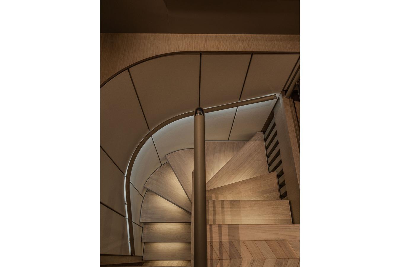 The main deck includes a salon with full-height side windows, providing unobstructed views and natural light. The day head on the main deck adds convenience for guests. All furniture on board is by Fendi, adding a cohesive and luxurious aesthetic throughout the interior.