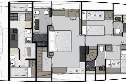 Below deck, the Ferretti Infynito 90 has four cabins, including a full-beam master cabin, VIP forward cabin and two twins. Each cabin has its own bathroom. A dedicated crew area with separate access ensures operational independence and privacy for owners and guests.