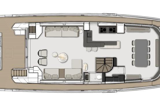 On the upper deck, Ferretti Infynito 90 offers both open-air and enclosed areas: the aft section provides sunbathing space, while the enclosed lounge functions as a secondary salon. This area is equipped with a sofa, a television, and a second helm station.