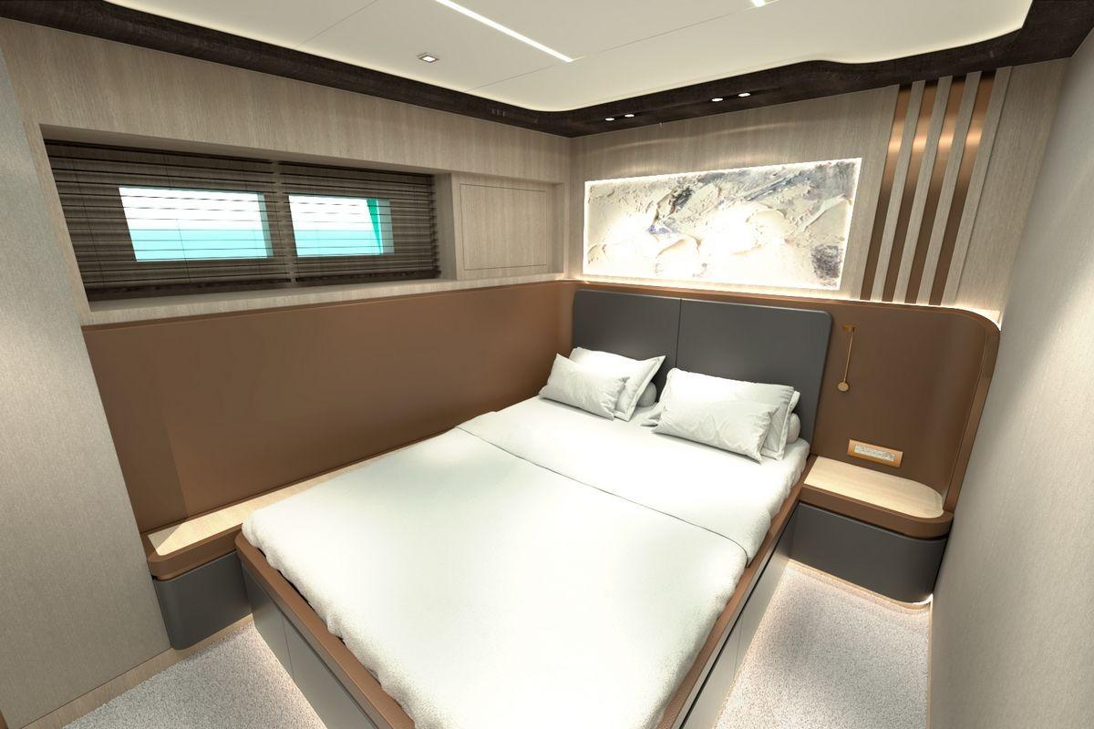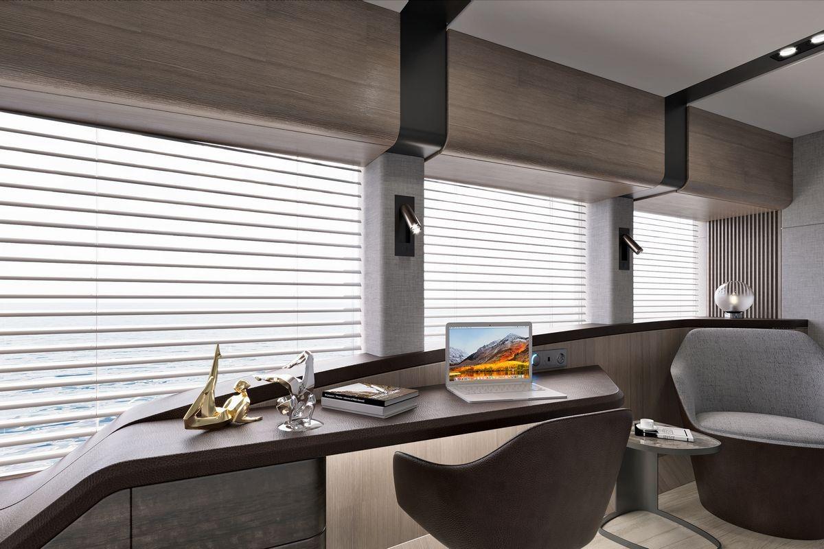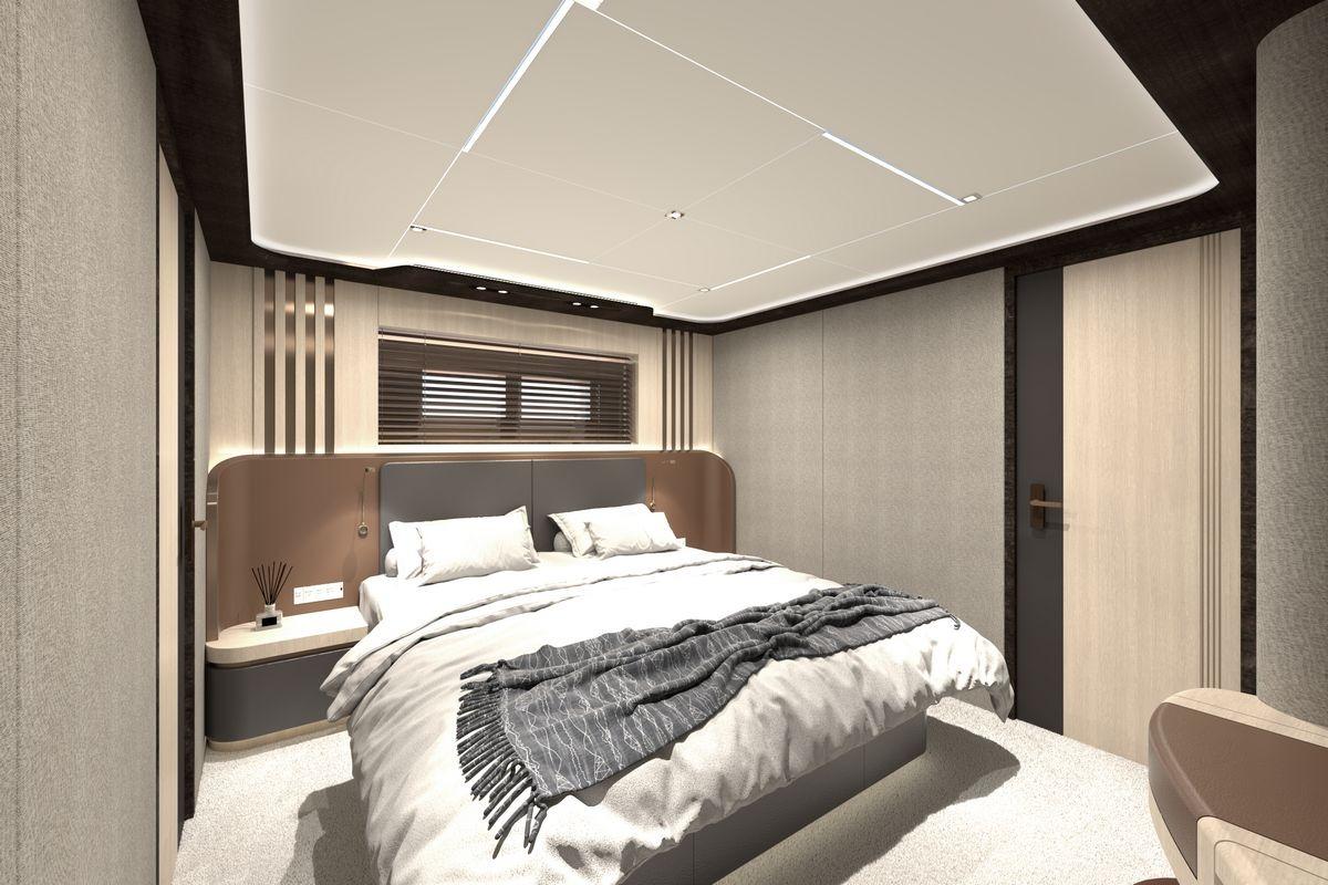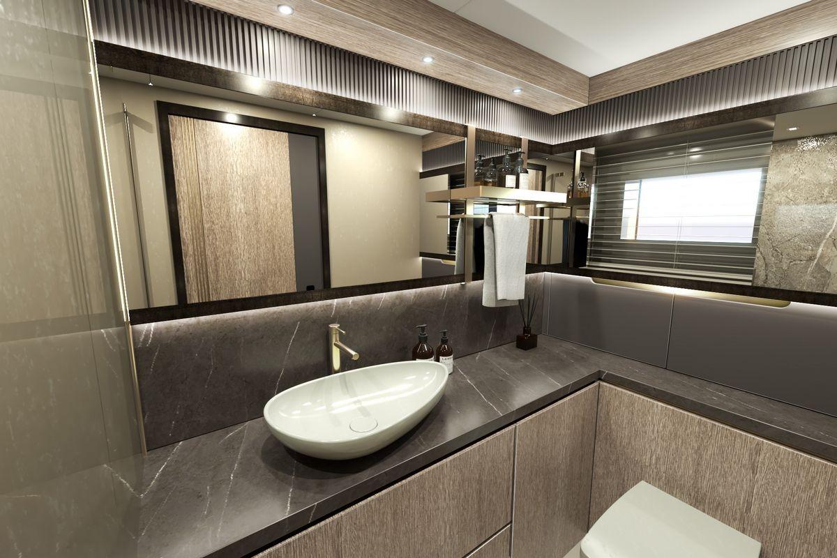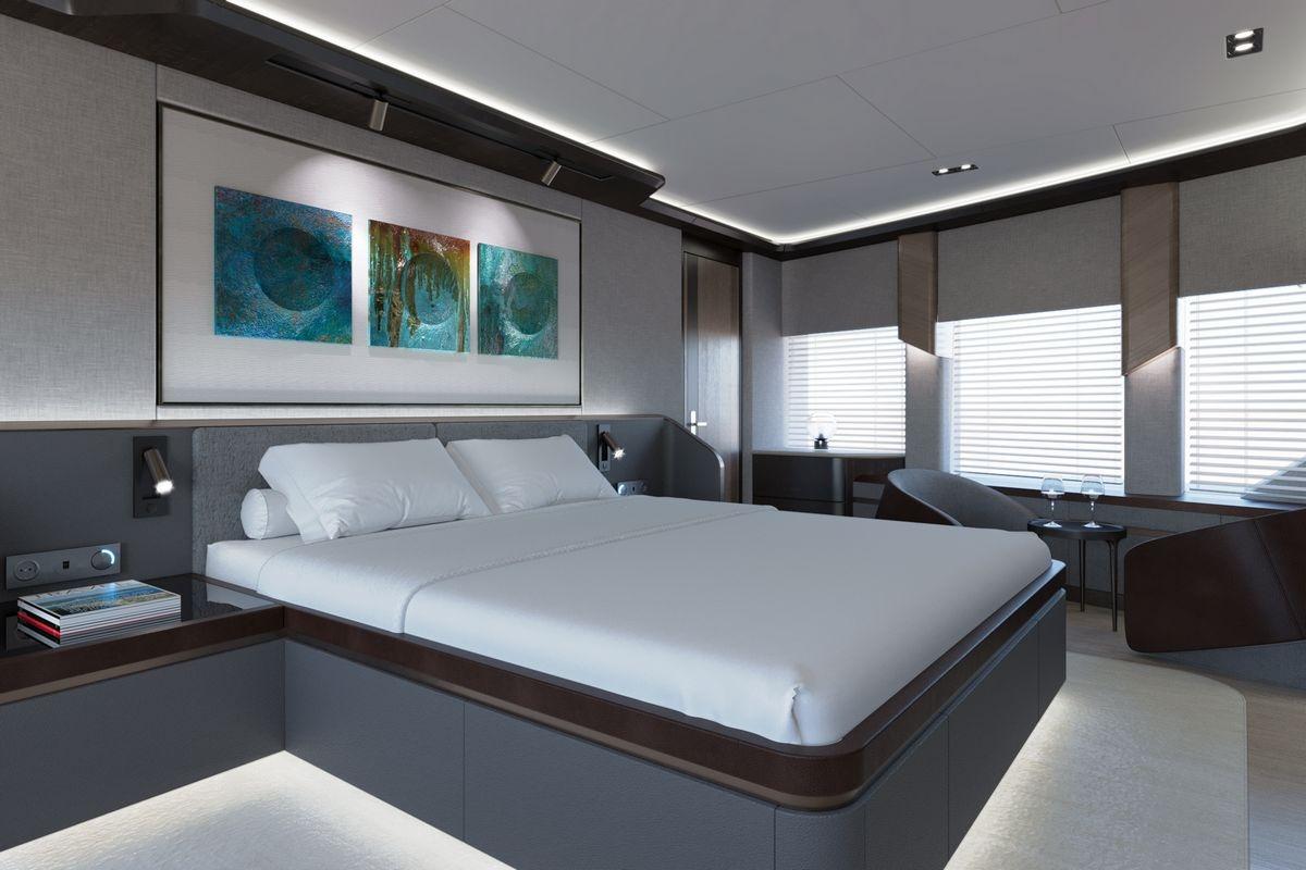 Her 299 GT allows for a six-stateroom configuration, including a full-beam master suite on the main deck forward. The suite features panoramic windows, an owner’s office, a dressing area, and a spacious bathroom.