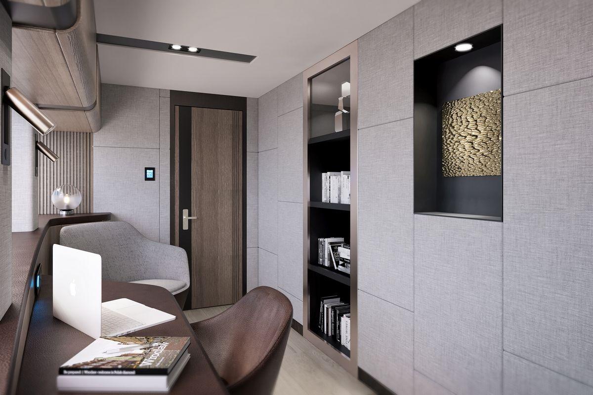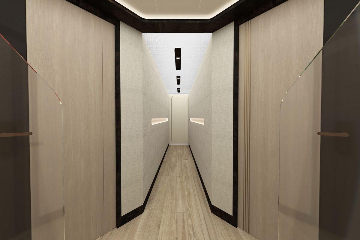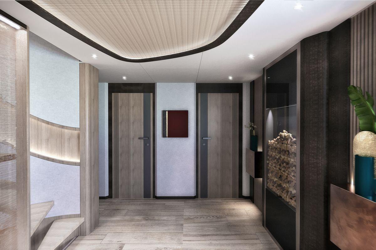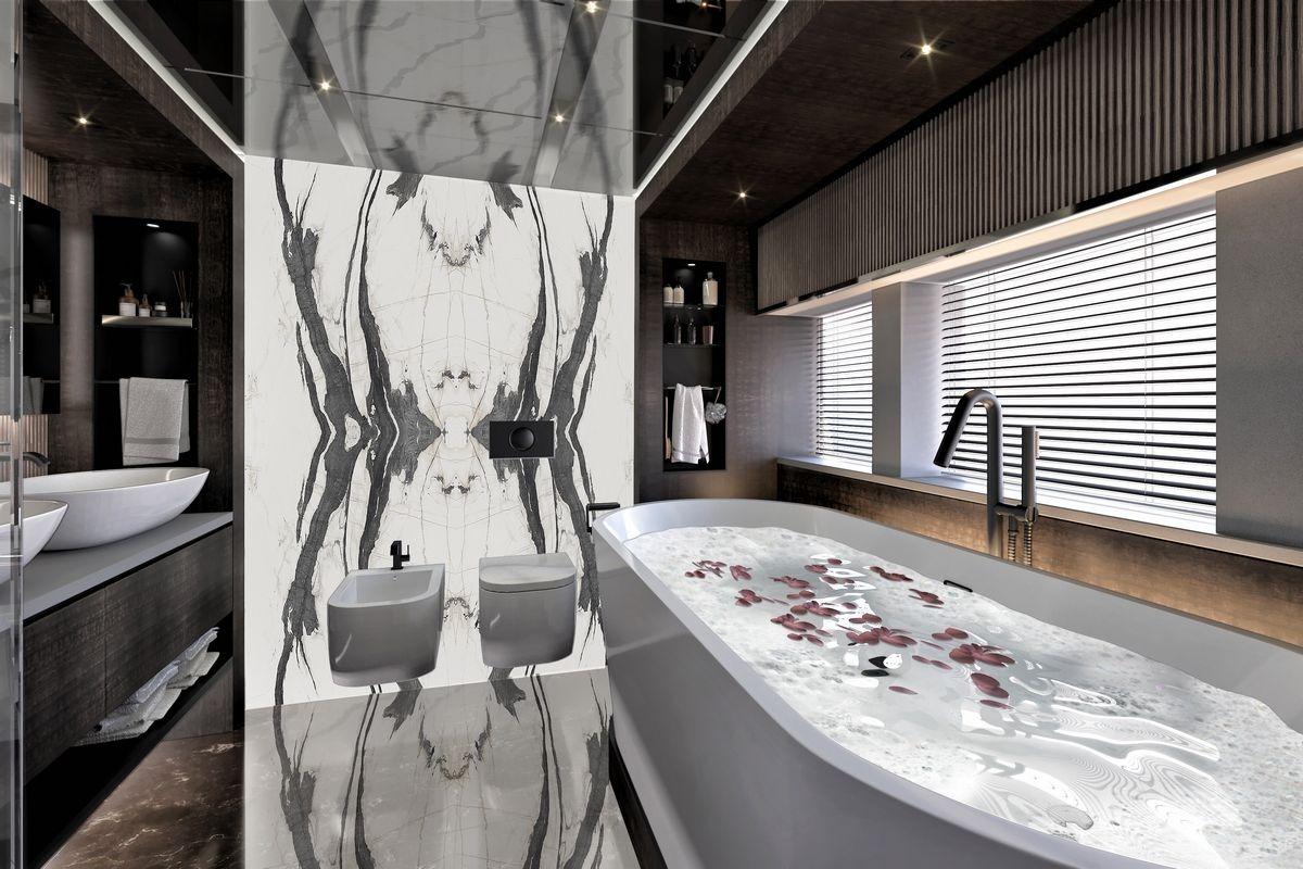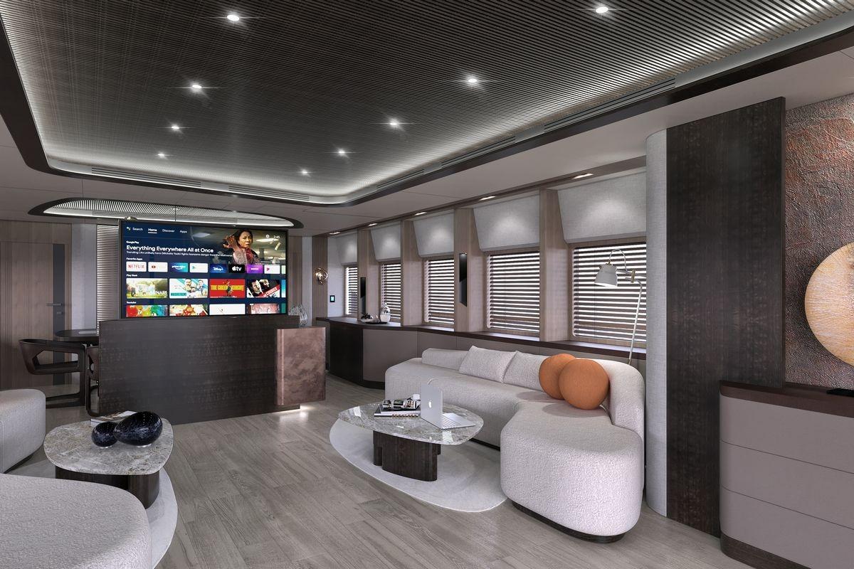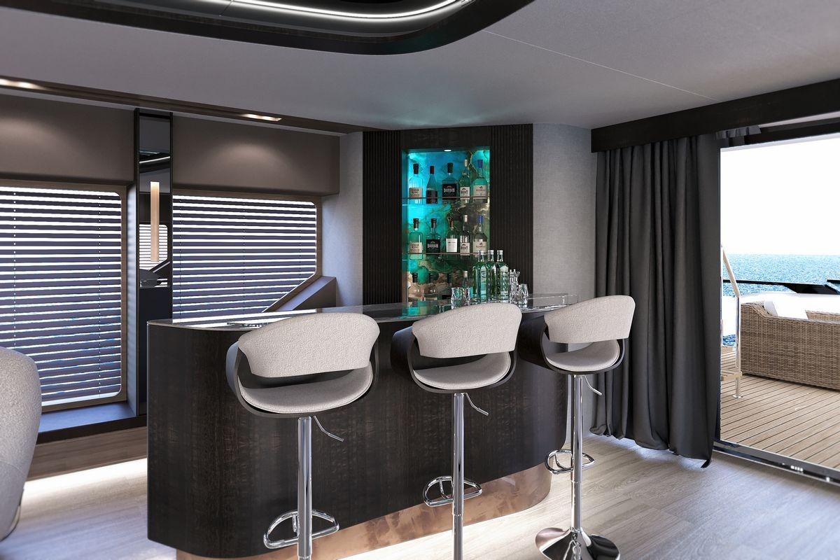 Her 299 GT allows for a six-stateroom configuration, including a full-beam master suite on the main deck forward. The suite features panoramic windows, an owner’s office, a dressing area, and a spacious bathroom.