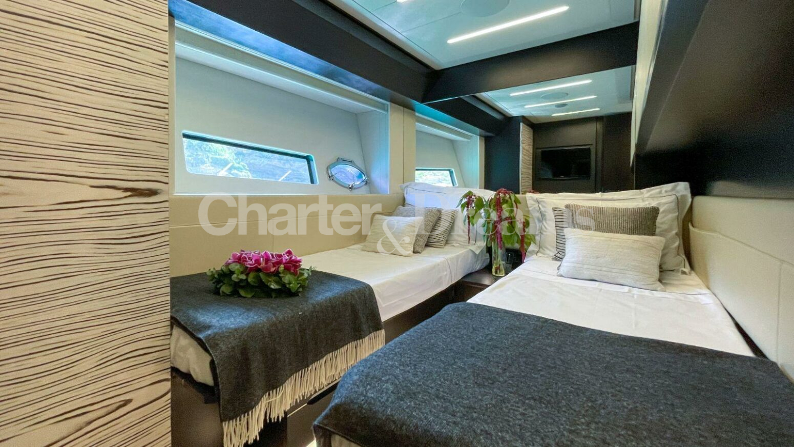 - Unterkunft für bis zu 9 Gäste in 4 eleganten Kabinen, darunter eine Eignerkabine über die gesamte Schiffsbreite und eine Twin-Kabine mit zusätzlichem Etagenbett.