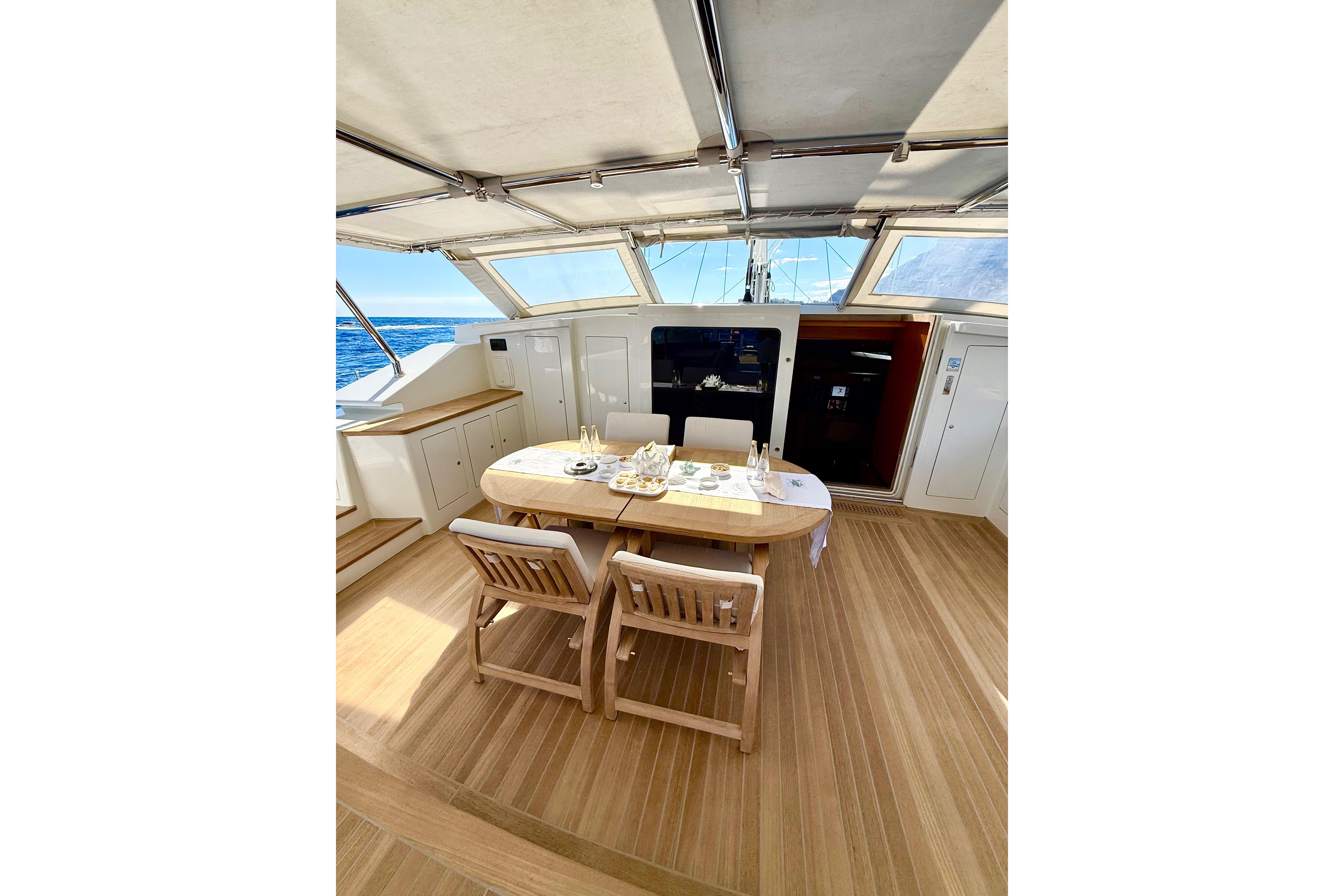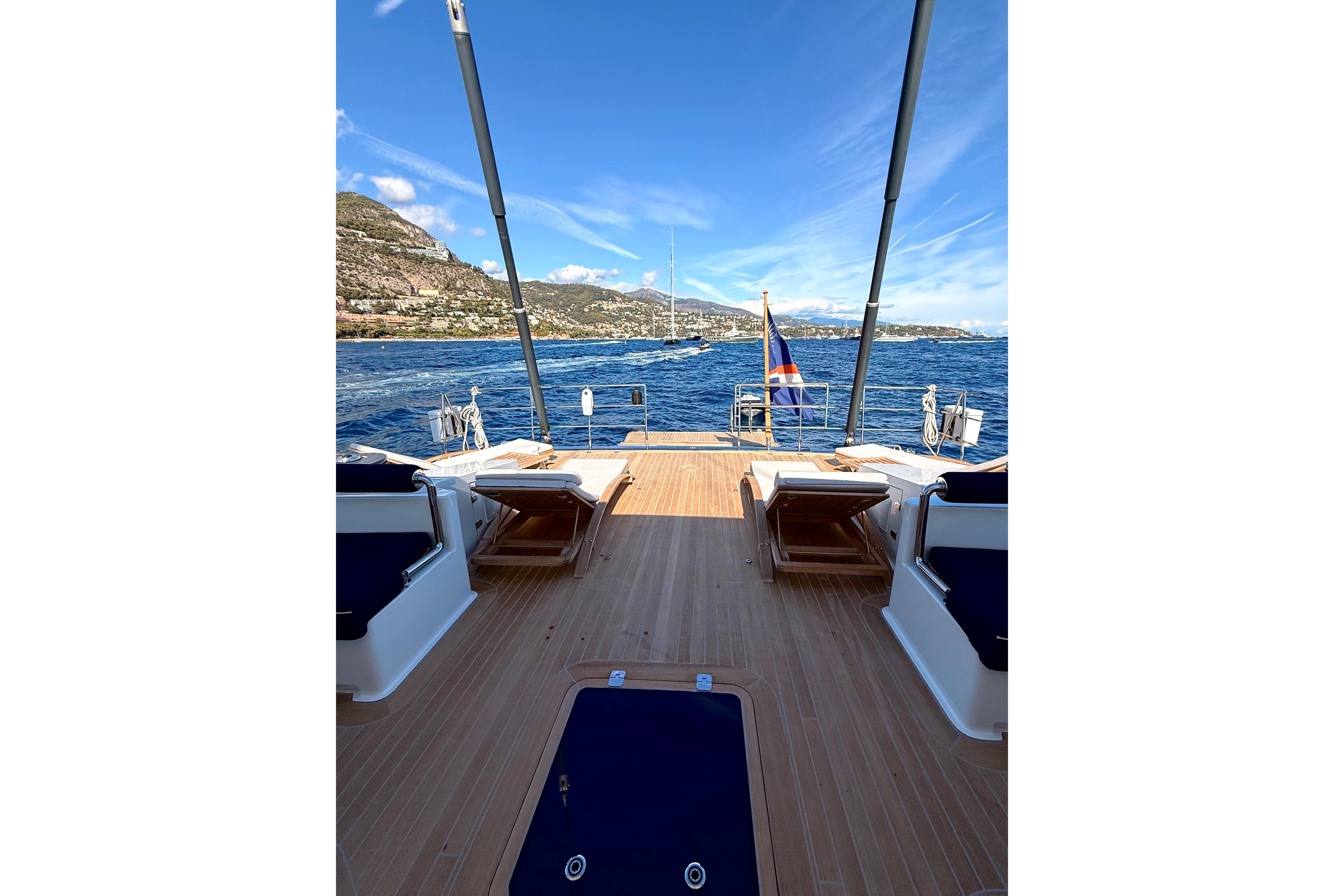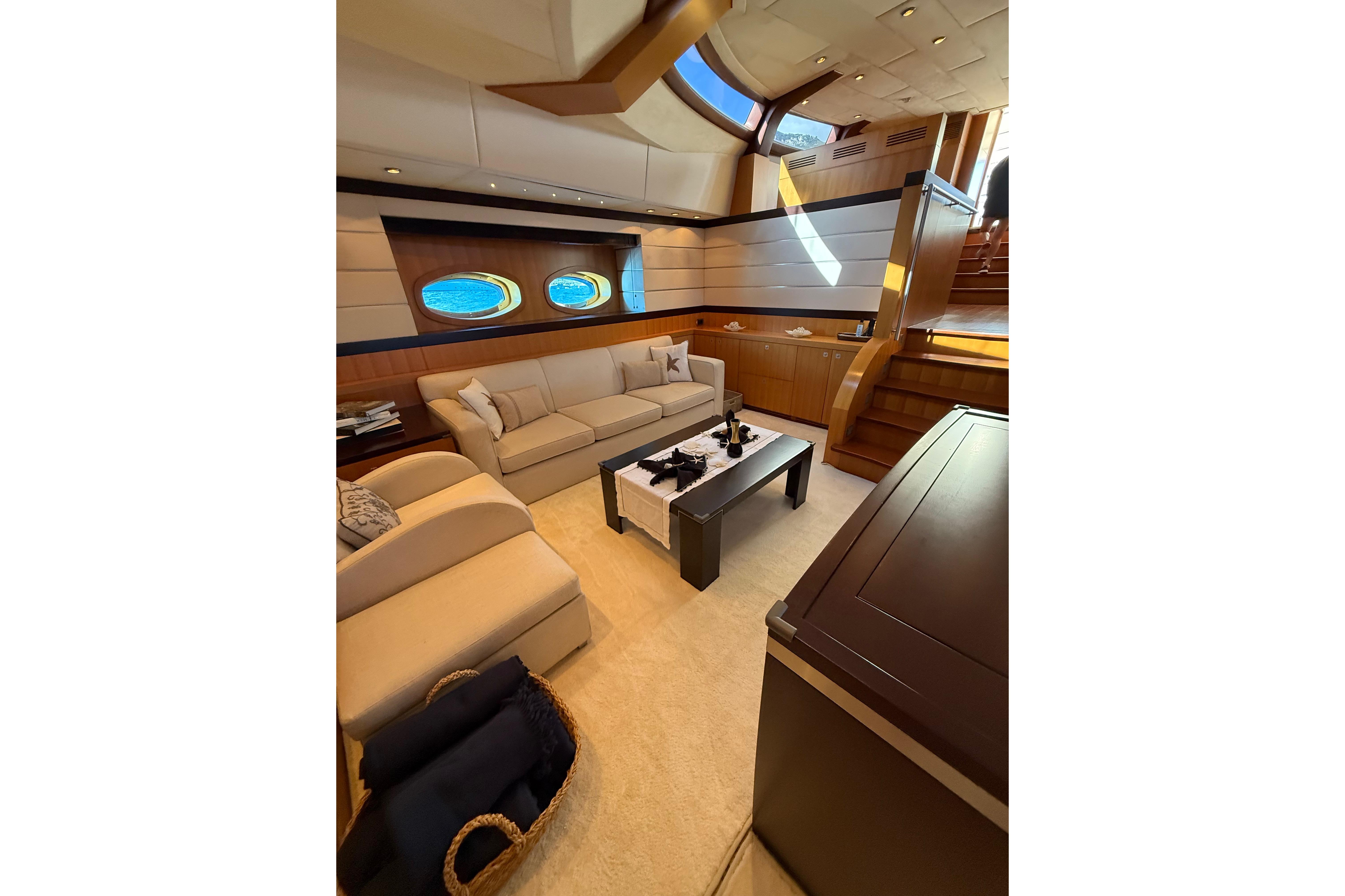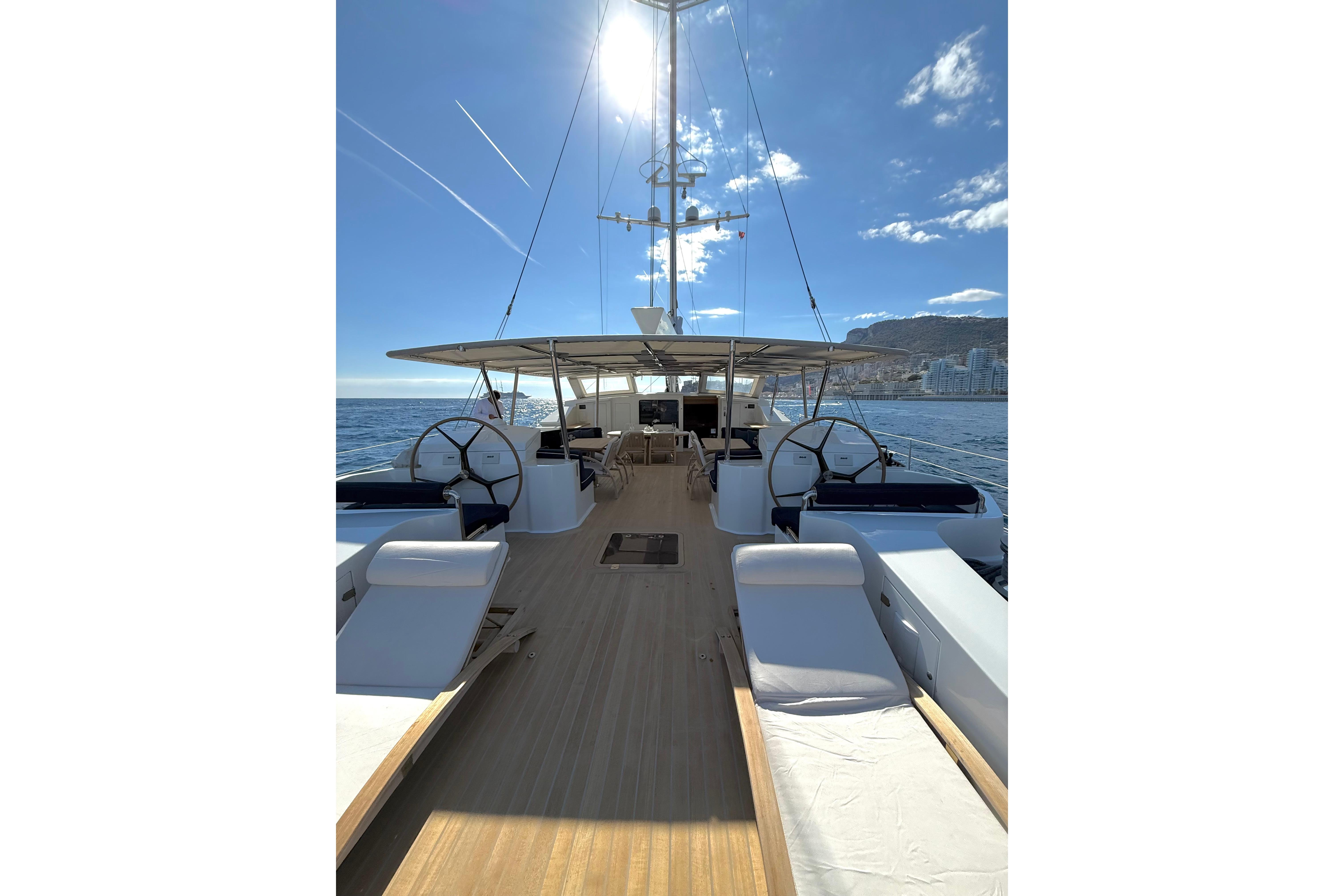 Il accueille 8 à 10 invités dans 4 cabines luxueuses (suite armateur, VIP, twin, cabine supplémentaire) avec salles d’eau privatives, et dispose d’un équipage de 5 à 6 personnes. L’intérieur signé Eva Cadio & Co combine élégance et raffinement.