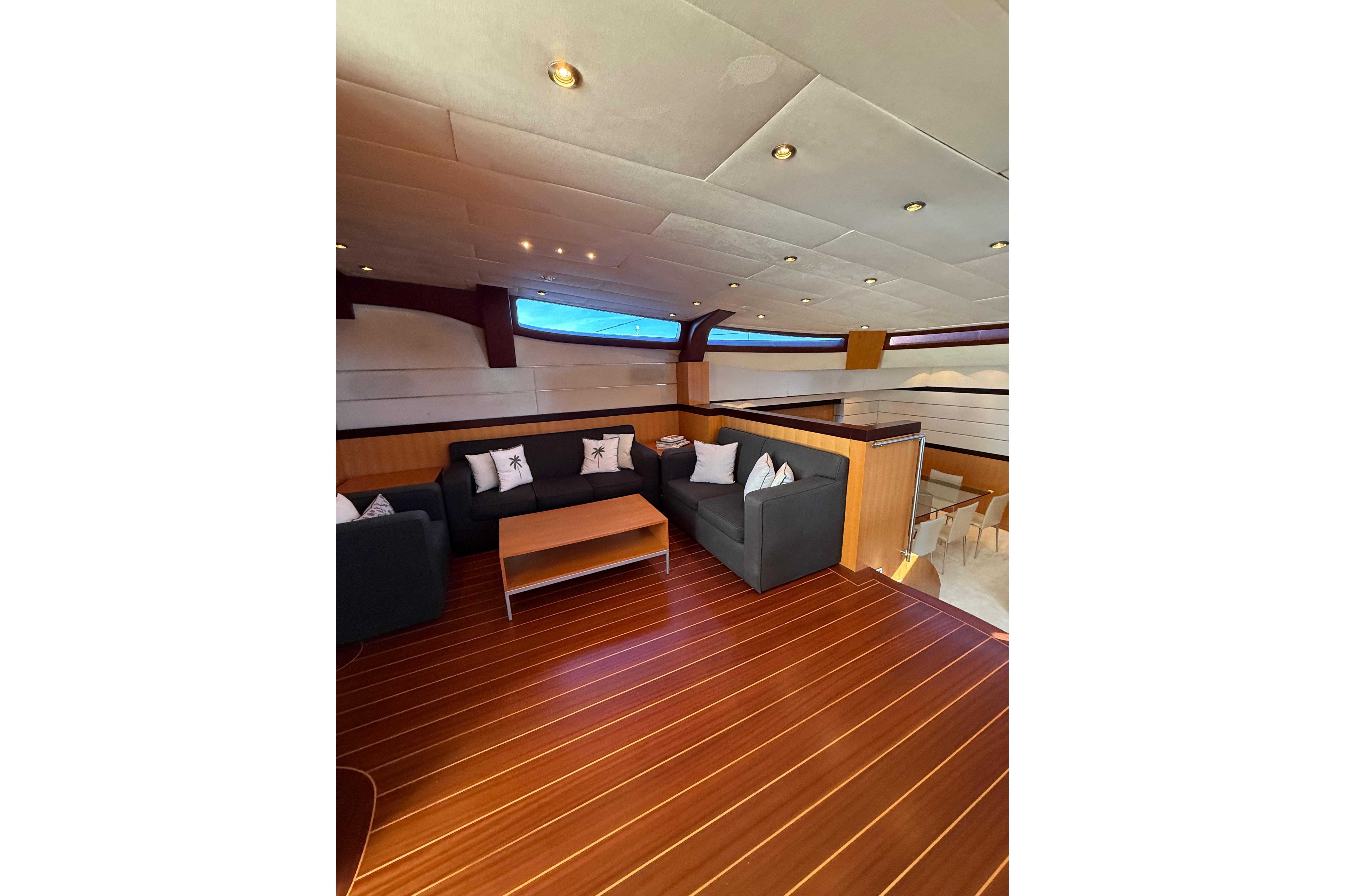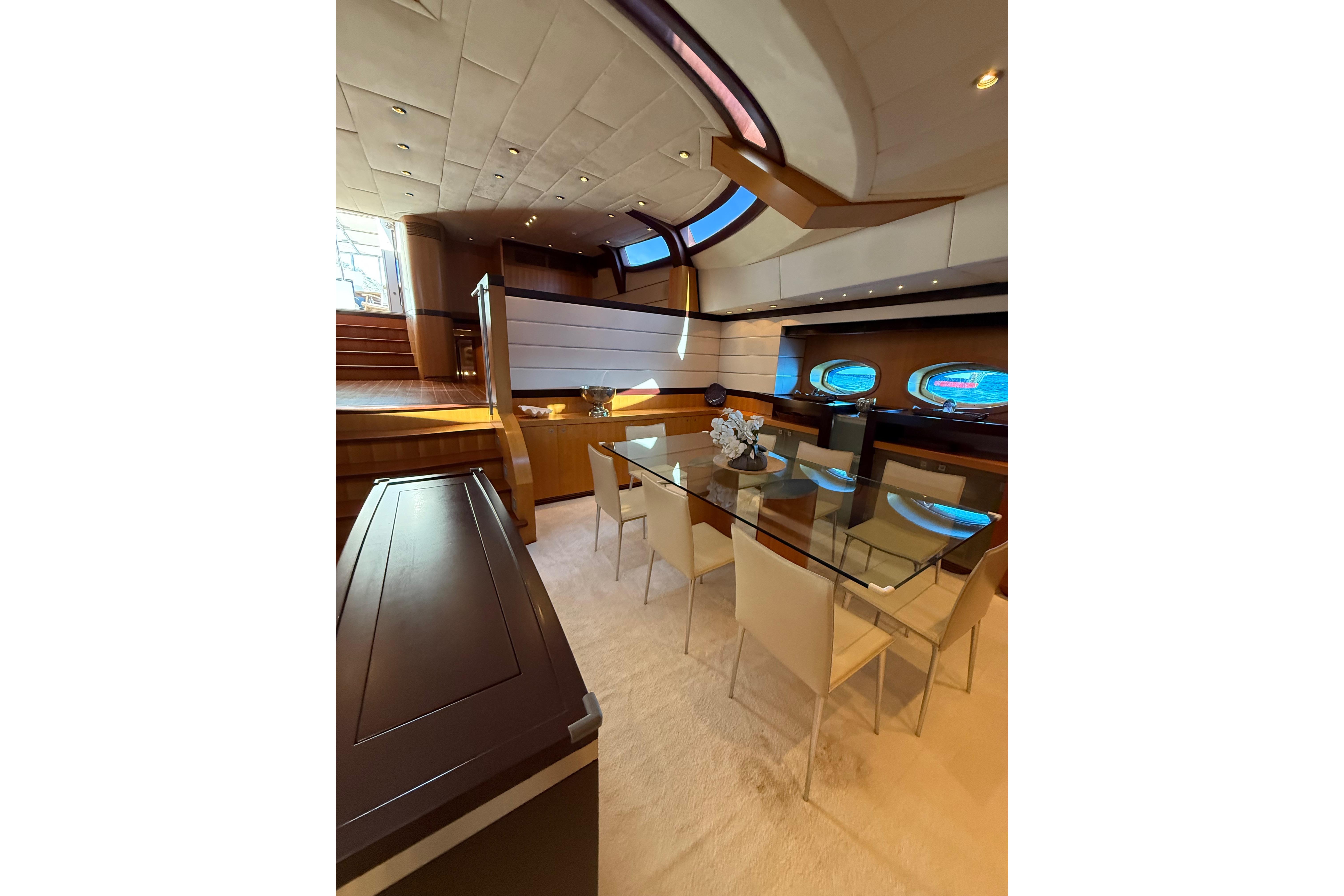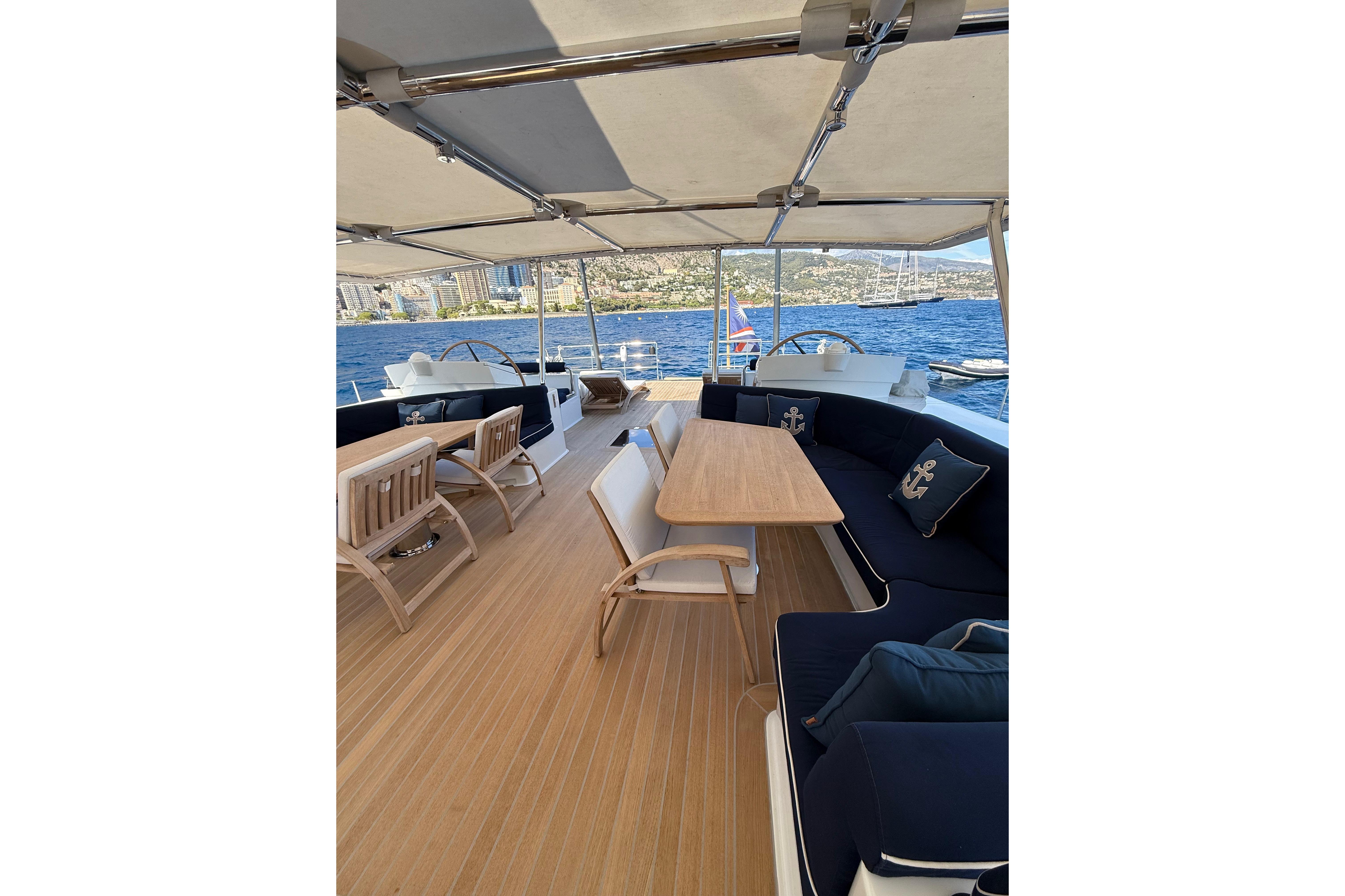 Il accueille 8 à 10 invités dans 4 cabines luxueuses (suite armateur, VIP, twin, cabine supplémentaire) avec salles d’eau privatives, et dispose d’un équipage de 5 à 6 personnes. L’intérieur signé Eva Cadio & Co combine élégance et raffinement.
