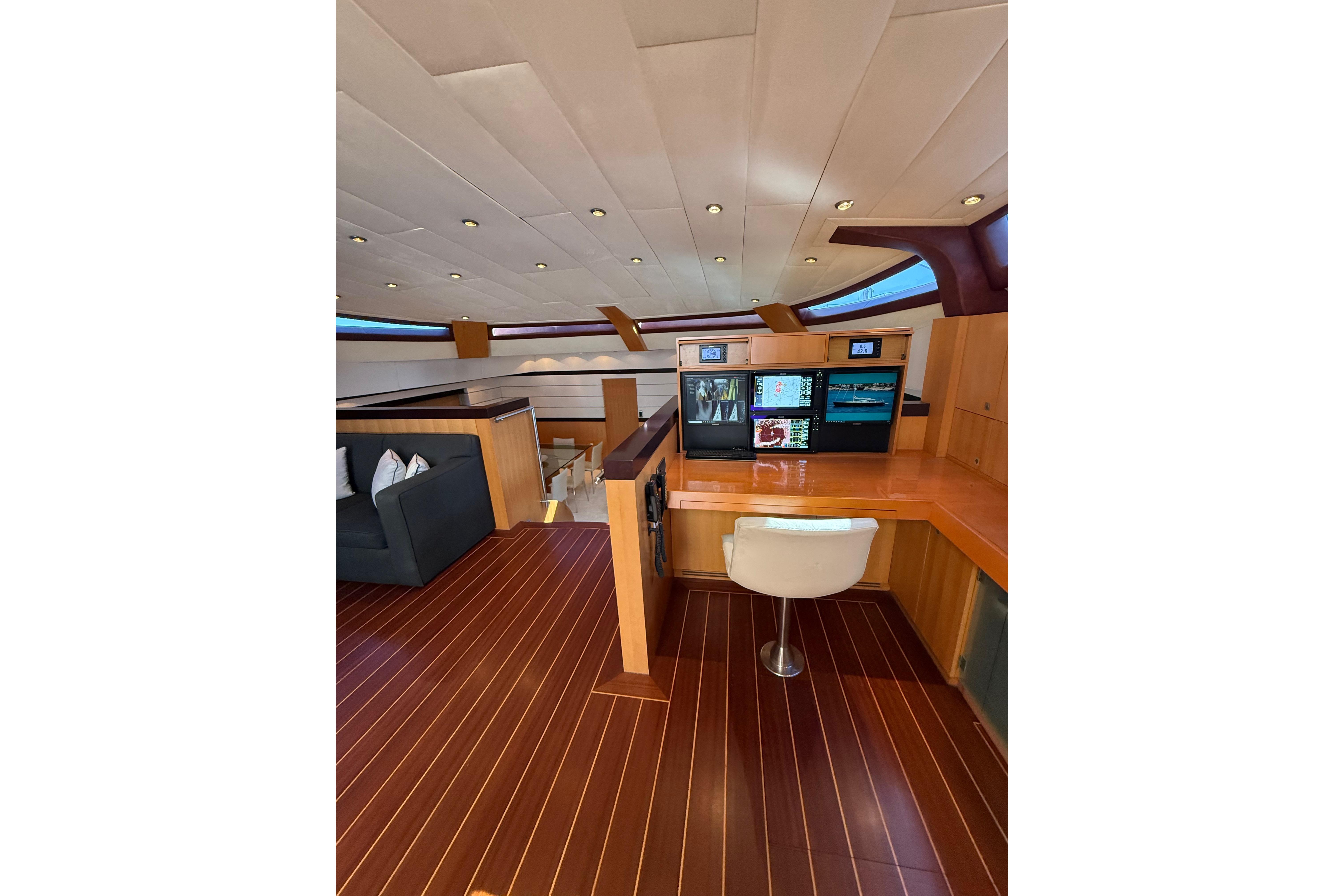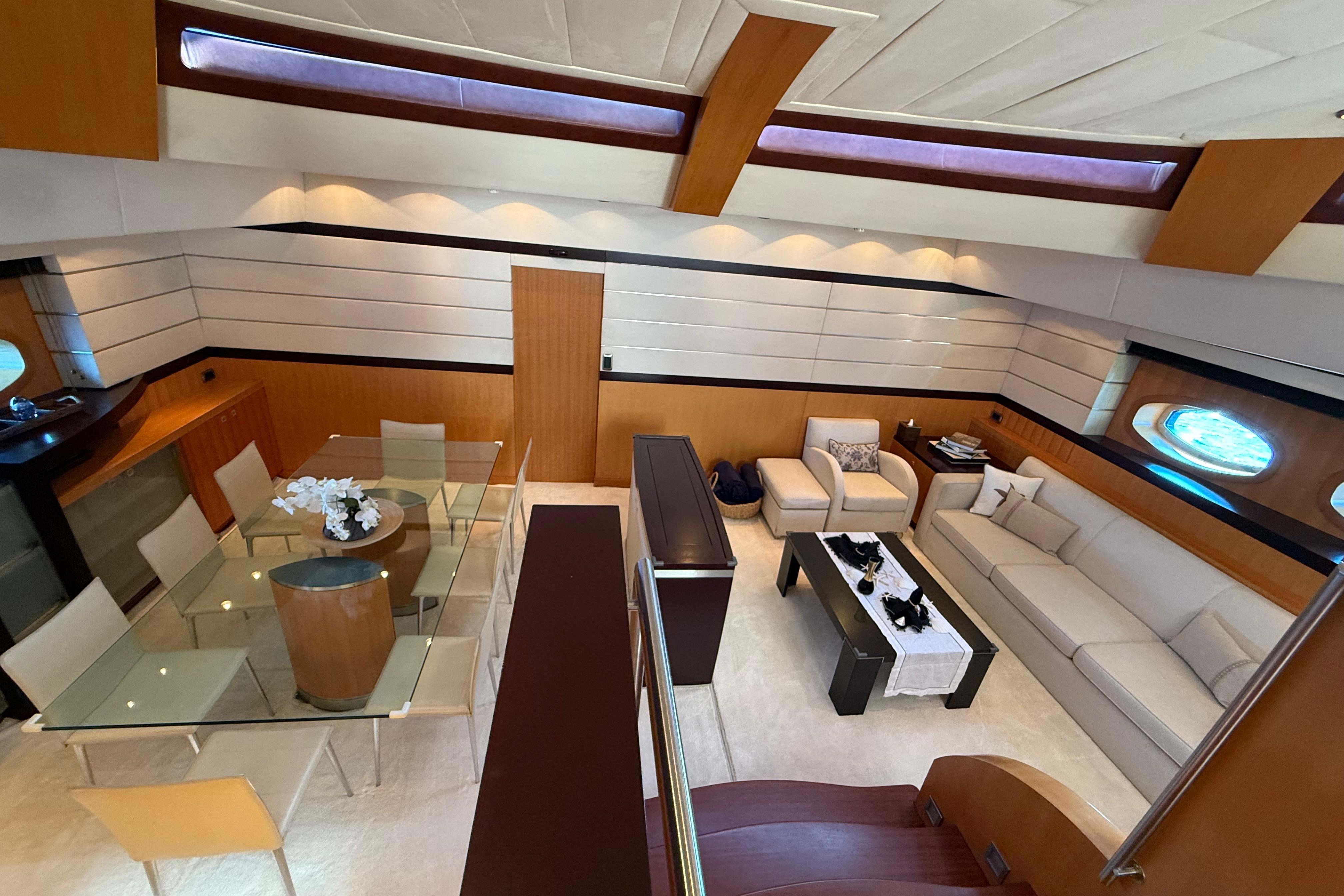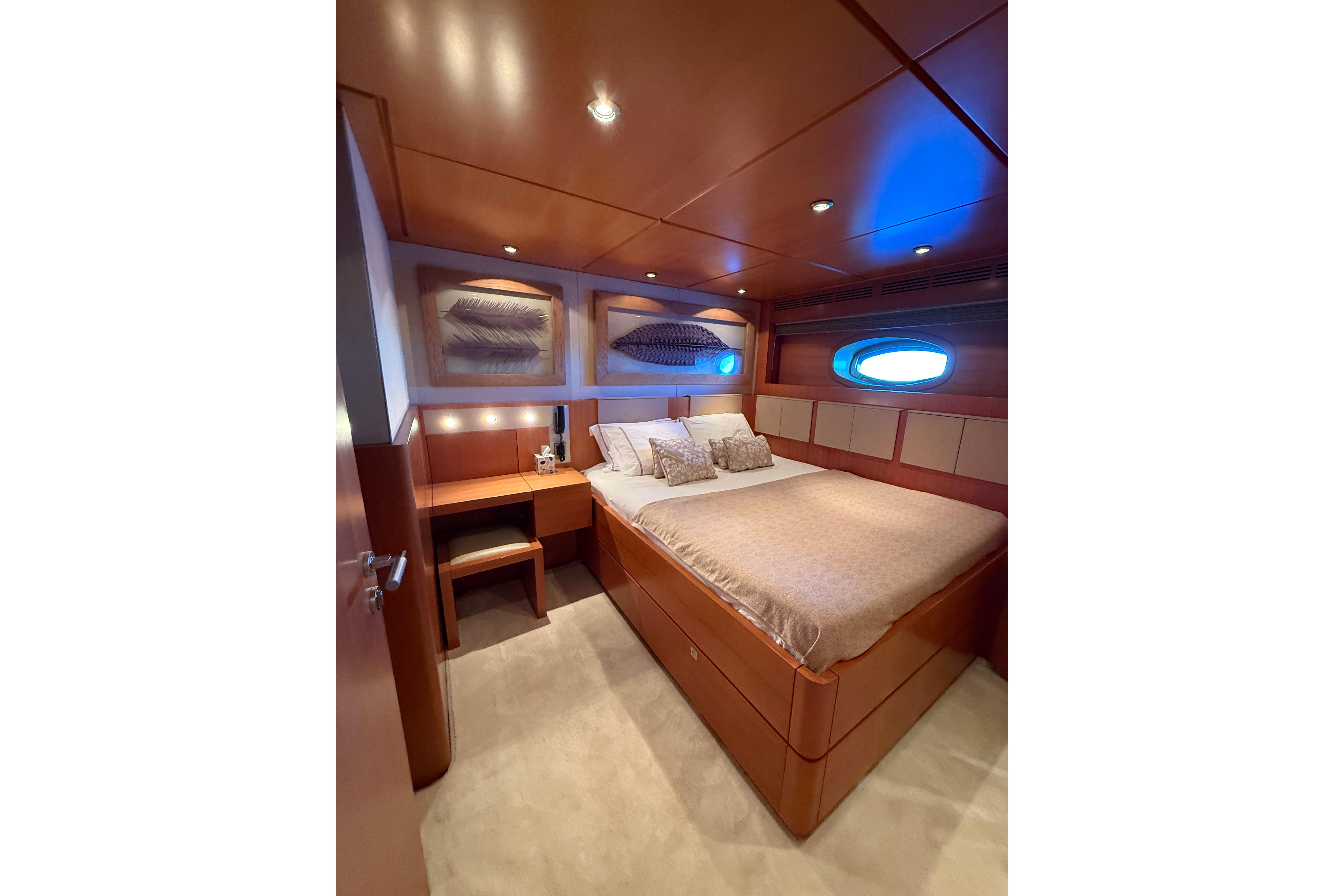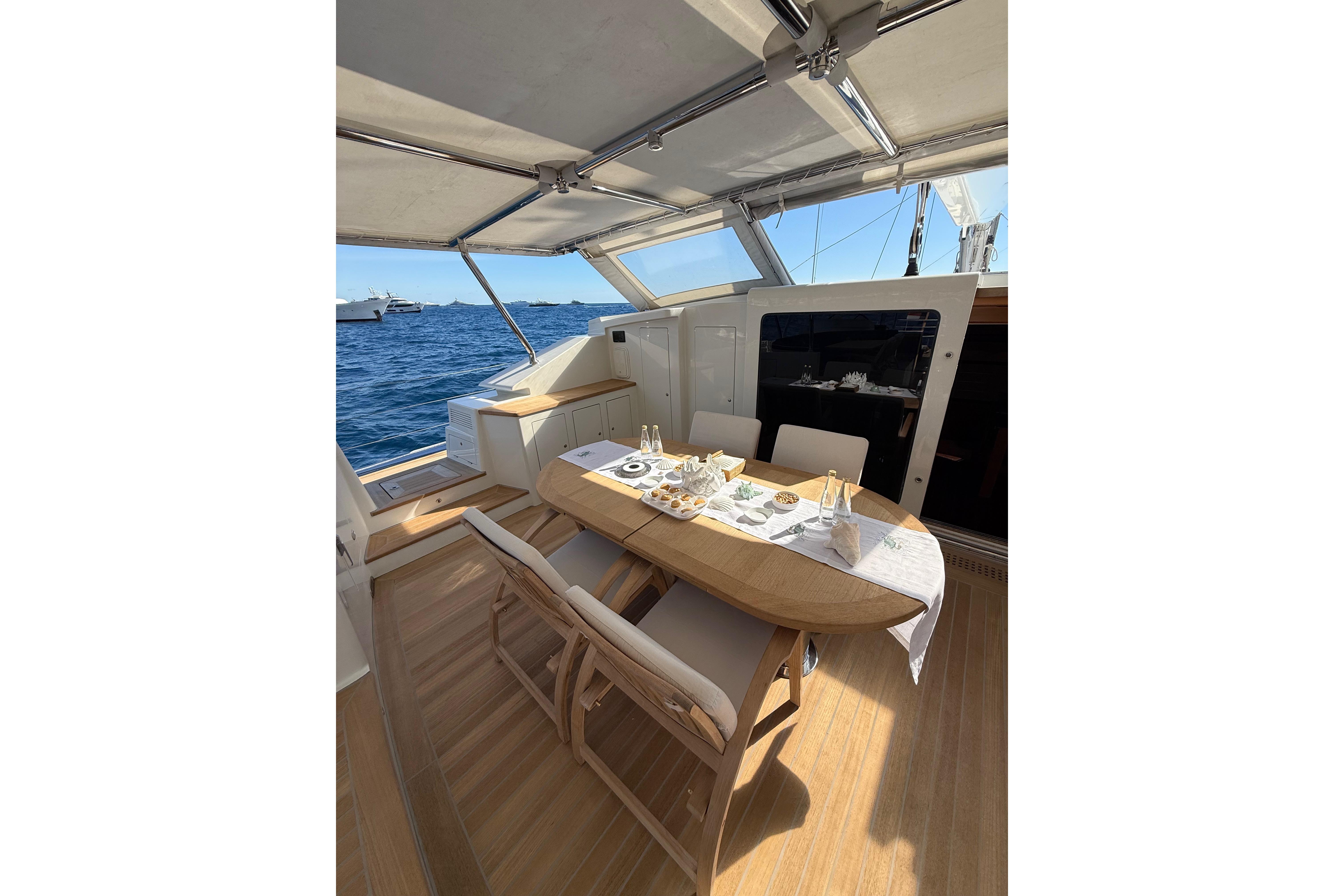 Il accueille 8 à 10 invités dans 4 cabines luxueuses (suite armateur, VIP, twin, cabine supplémentaire) avec salles d’eau privatives, et dispose d’un équipage de 5 à 6 personnes. L’intérieur signé Eva Cadio & Co combine élégance et raffinement.