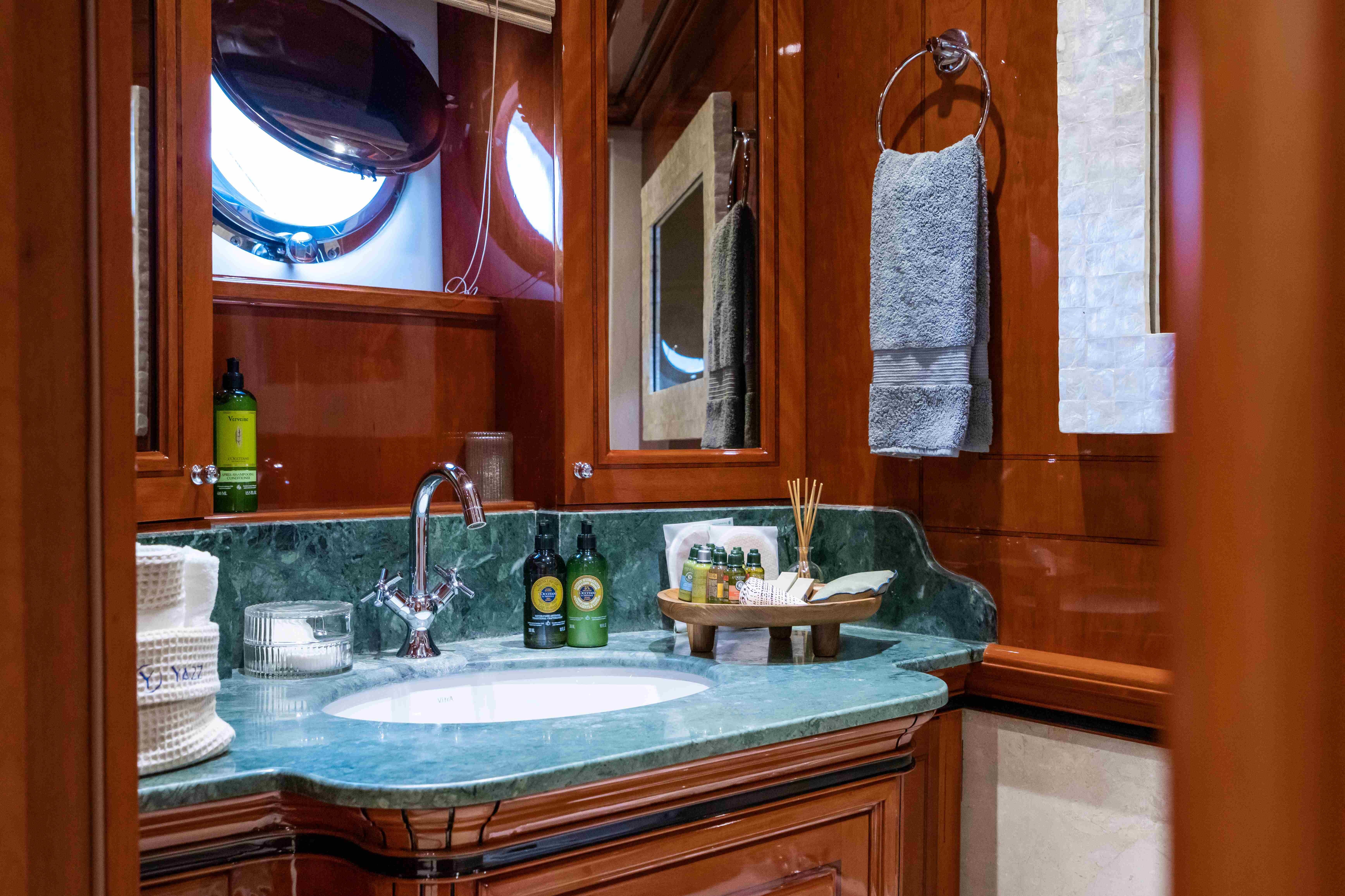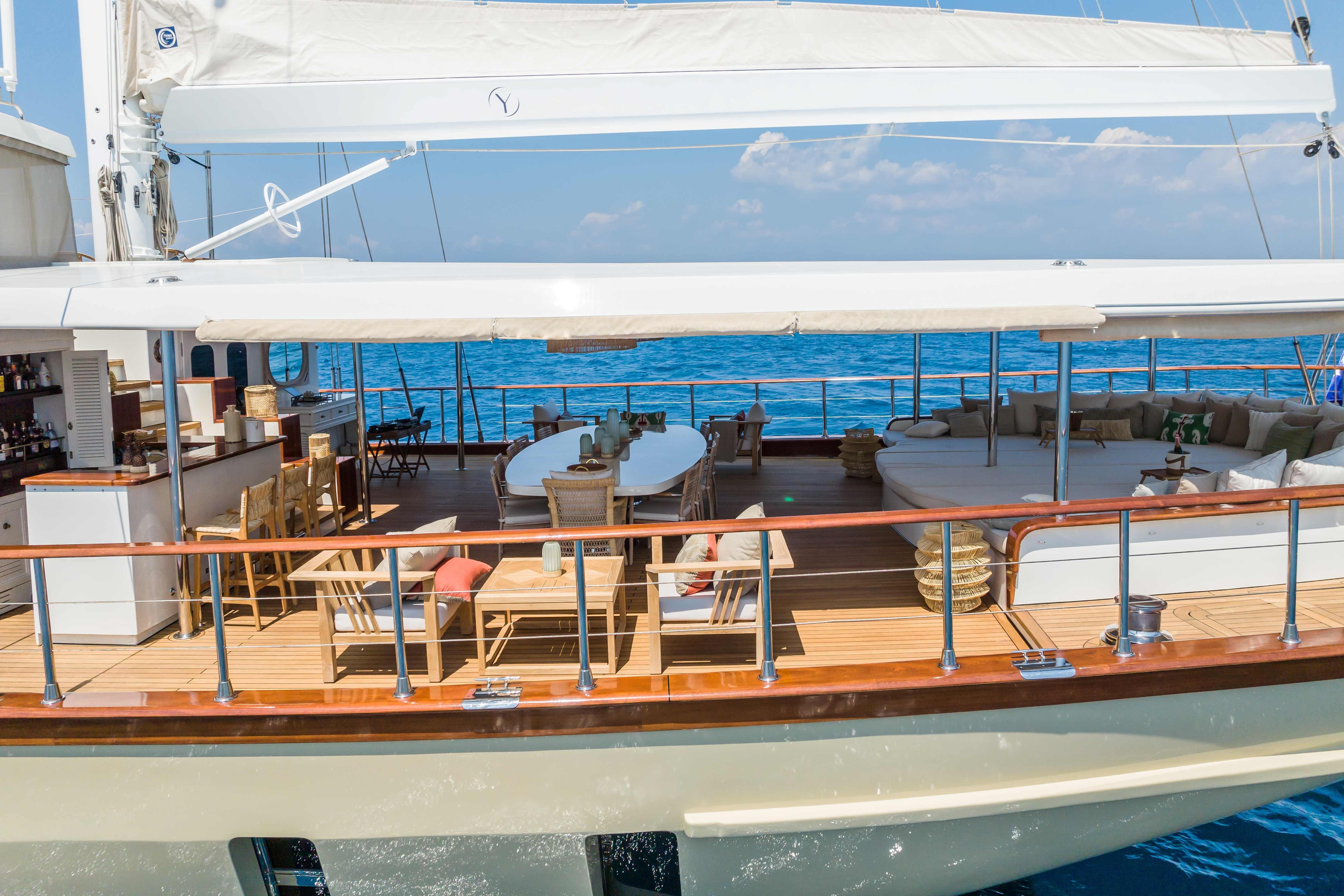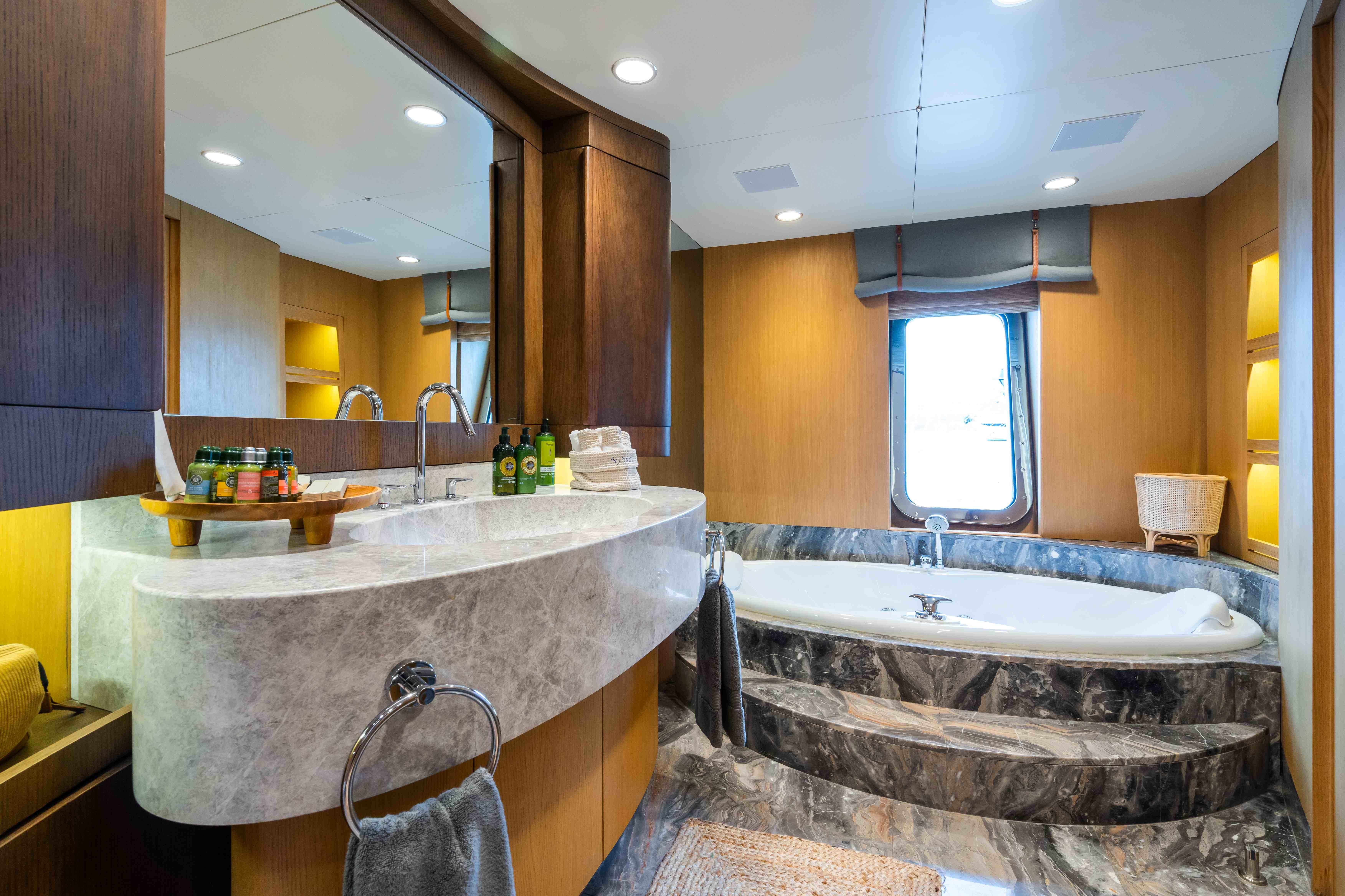 The yacht features five well-appointed guest cabins for 11 guests, including a full-beam master suite, along with expansive deck areas for dining, sunbathing, and entertainment. Her wide beam and solid structure provide exceptional stability, making her a reliable platform for extended cruising.