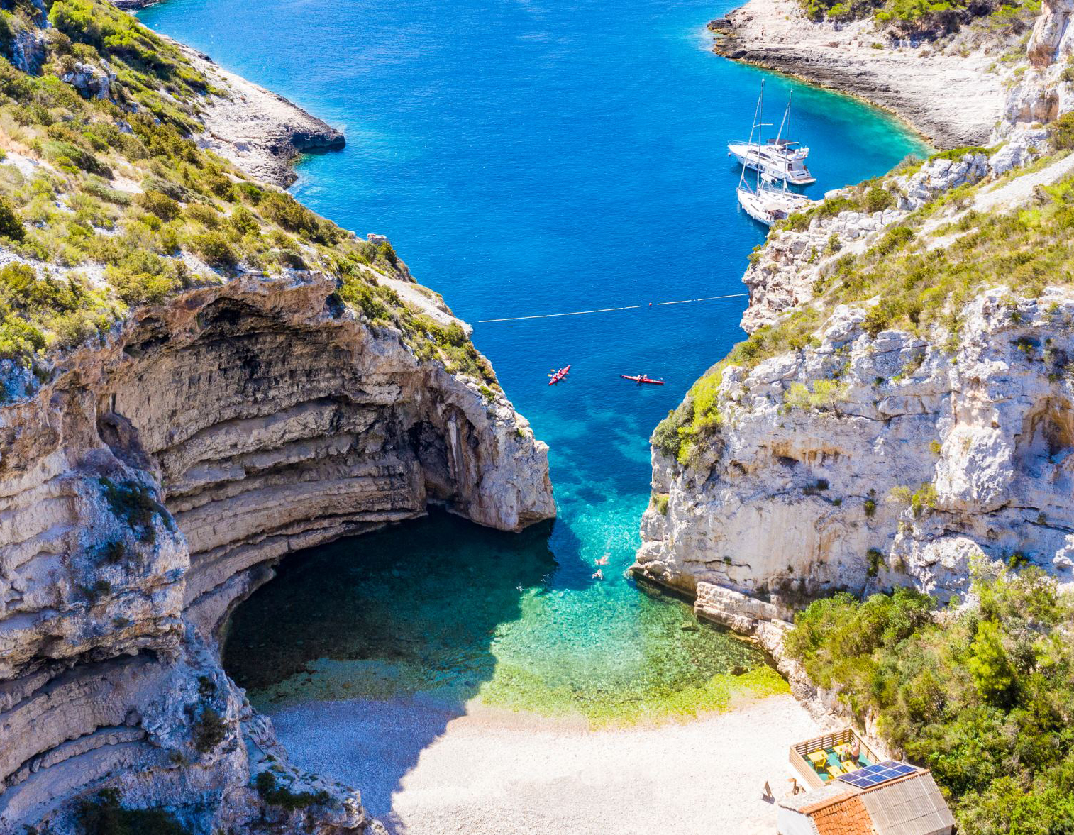 Cruise to the famous Blue Grotto, a natural sea cave known for its mesmerizing blue hues. Spend time exploring this unique geological formation before heading to Stiniva Cove, a stunning bay surrounded by cliffs. Anchor here for the night and enjoy dinner on board, savoring the island’s fresh seafood and Mediterranean cuisine.