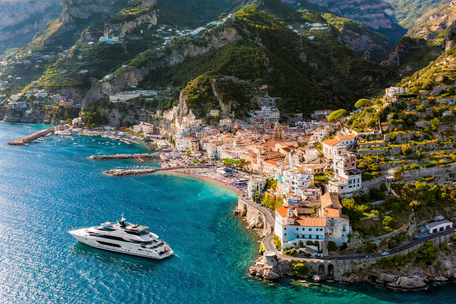 A short cruise brings you to the historic town of Amalfi, once a powerful maritime republic. Visit the stunning Cathedral of Saint Andrew, wander through the maze of narrow streets, and discover the townโs famous handmade paper workshops. The surrounding coastline is dotted with hidden coves and small fishing villages perfect for swimming stops.