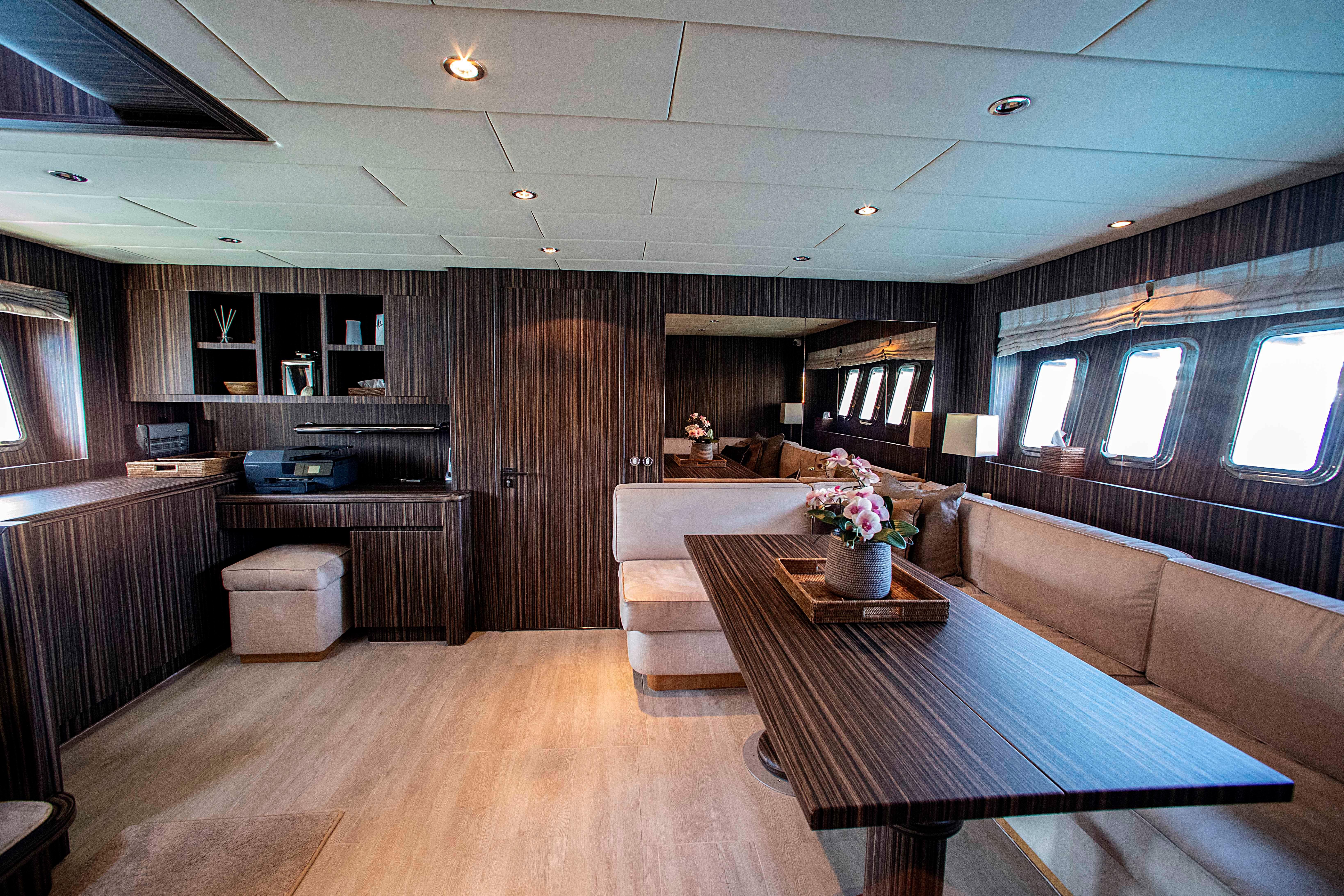 - Main saloon: panoramic windows, comfortable sofas, coffee tables, and office desk