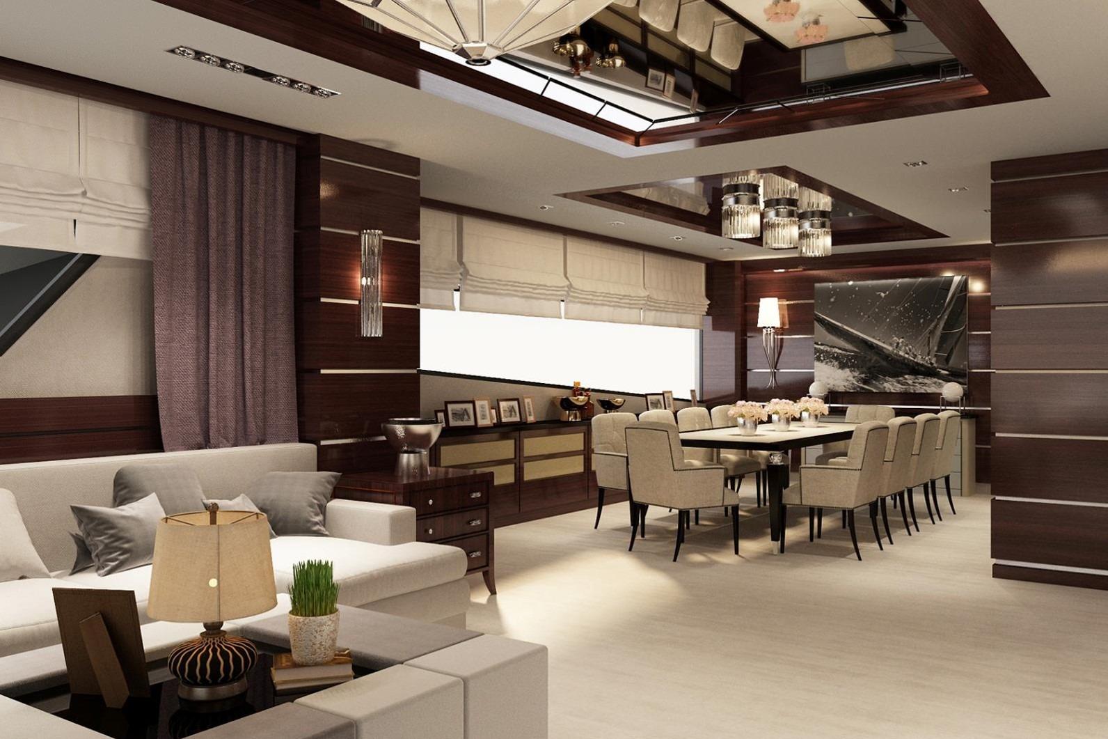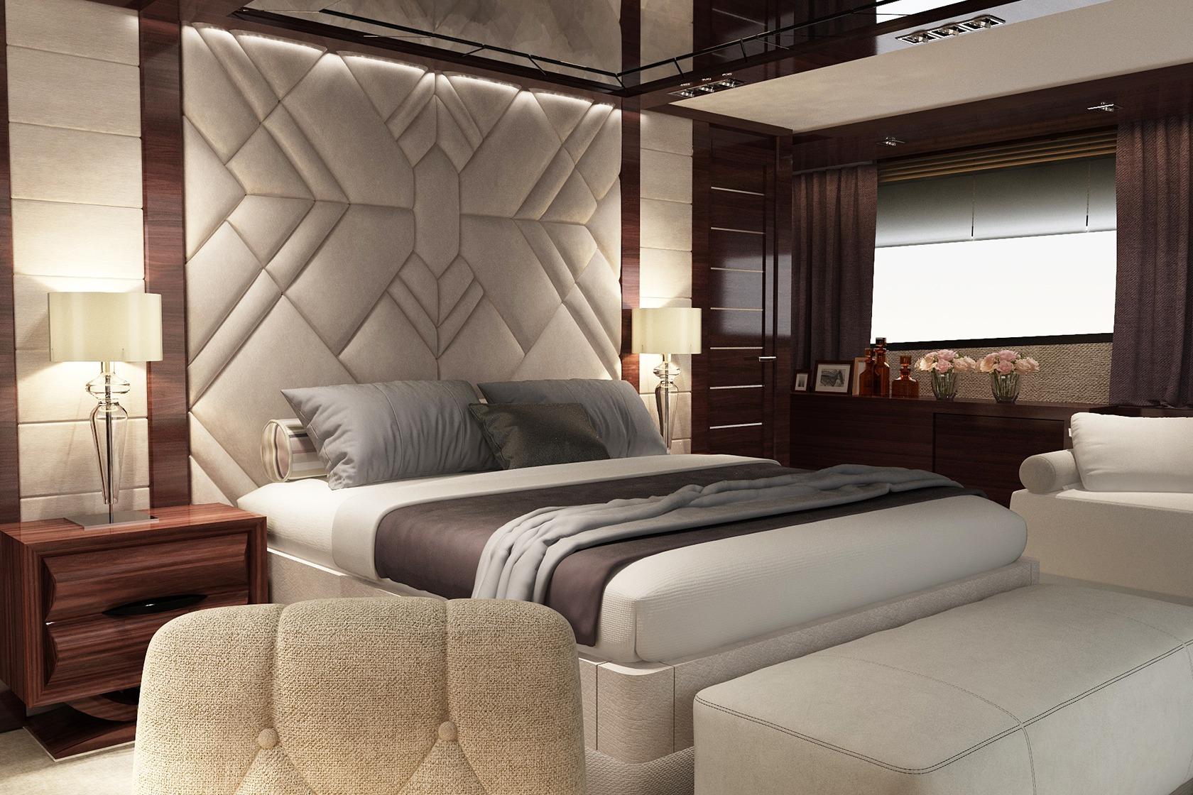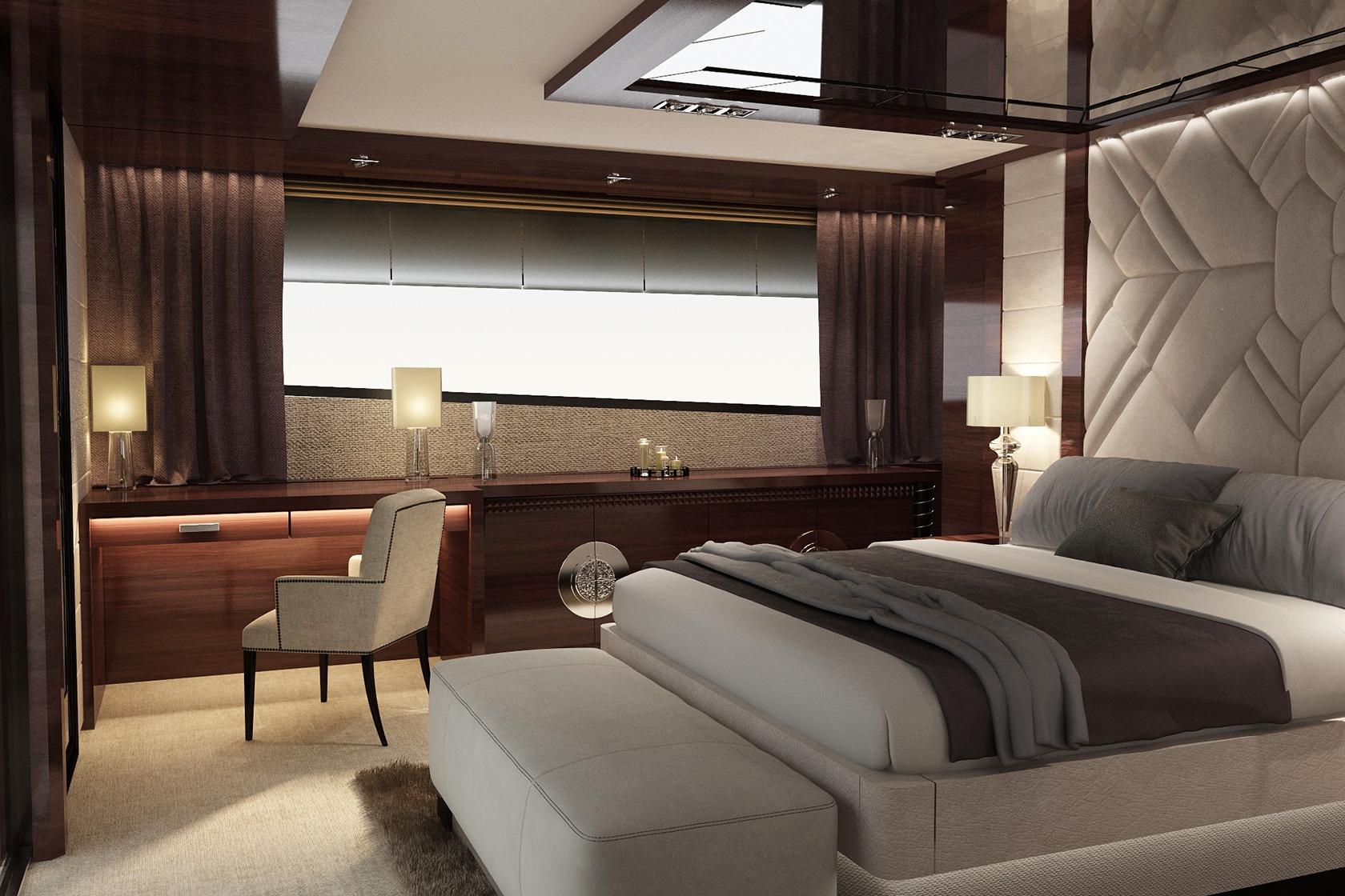 The yacht’s expansive layout accommodates 10 guests in five ensuite cabins, including a panoramic owner’s stateroom on the upper deck with its own private terrace, a secluded retreat with commanding views. Crew quarters for five are positioned to ensure privacy and operational efficiency.