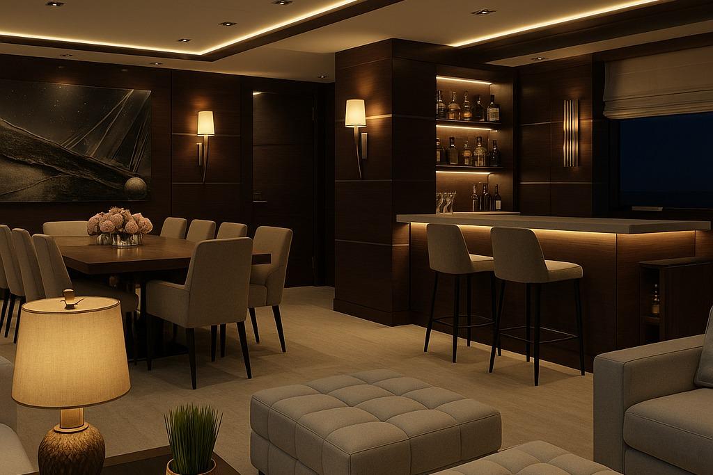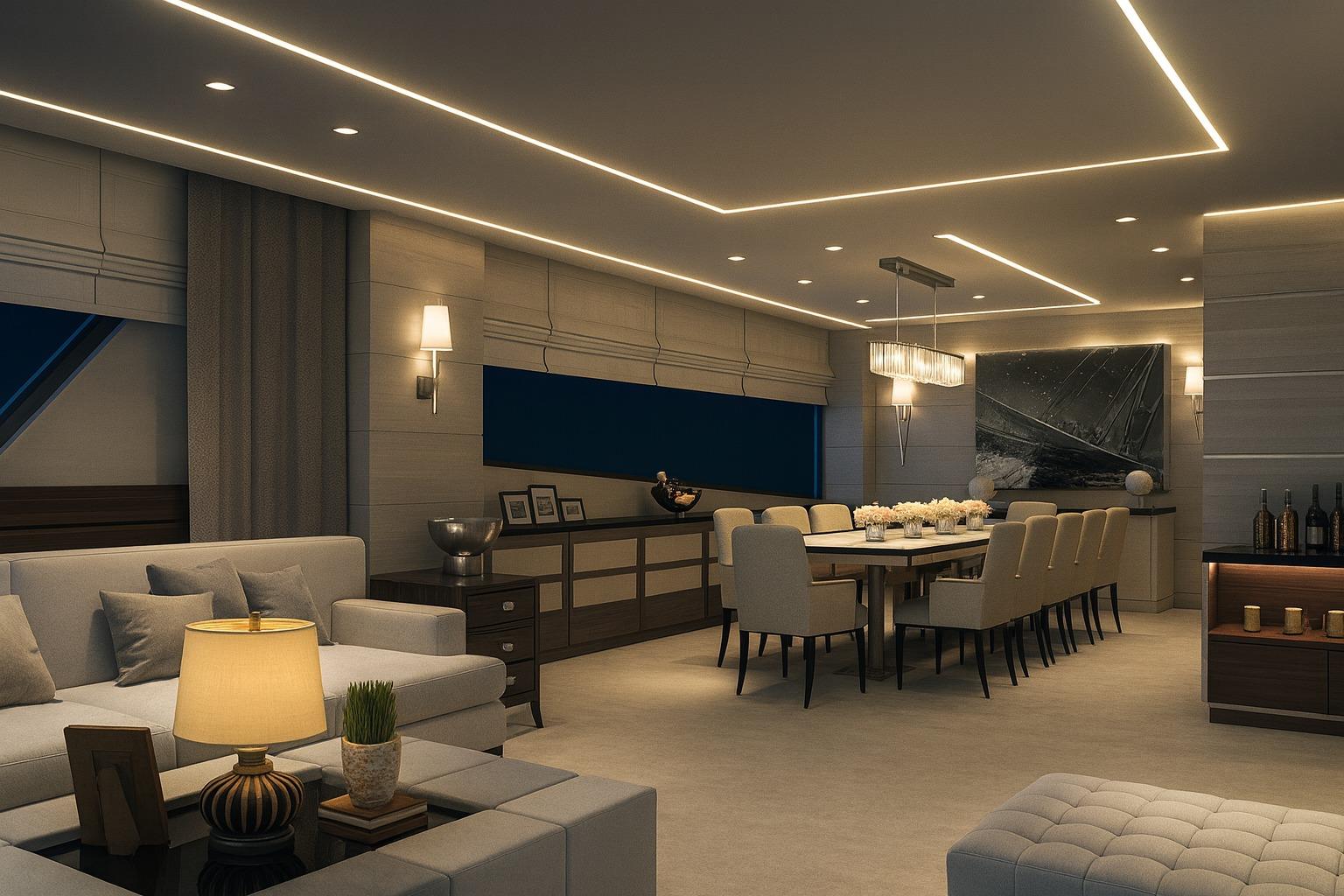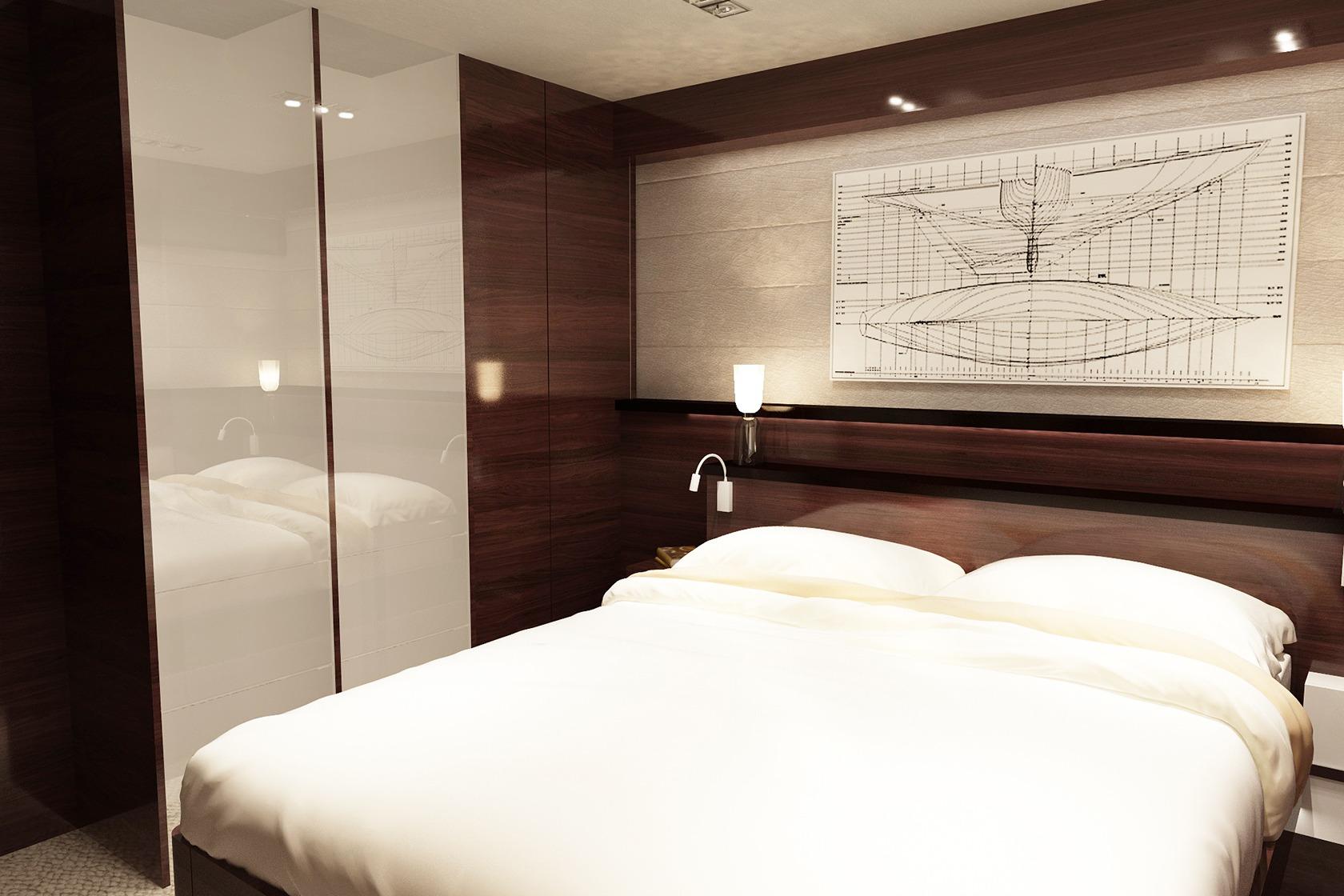 The yacht’s expansive layout accommodates 10 guests in five ensuite cabins, including a panoramic owner’s stateroom on the upper deck with its own private terrace, a secluded retreat with commanding views. Crew quarters for five are positioned to ensure privacy and operational efficiency.