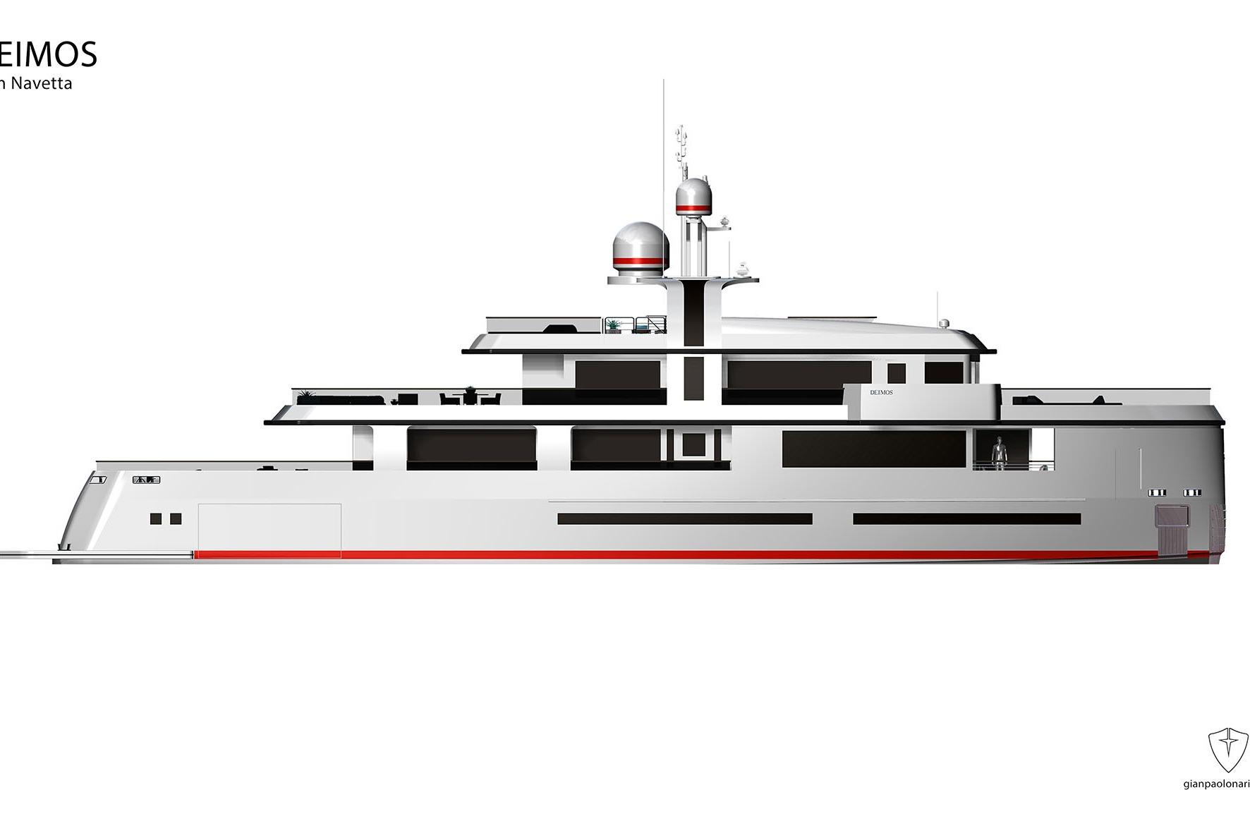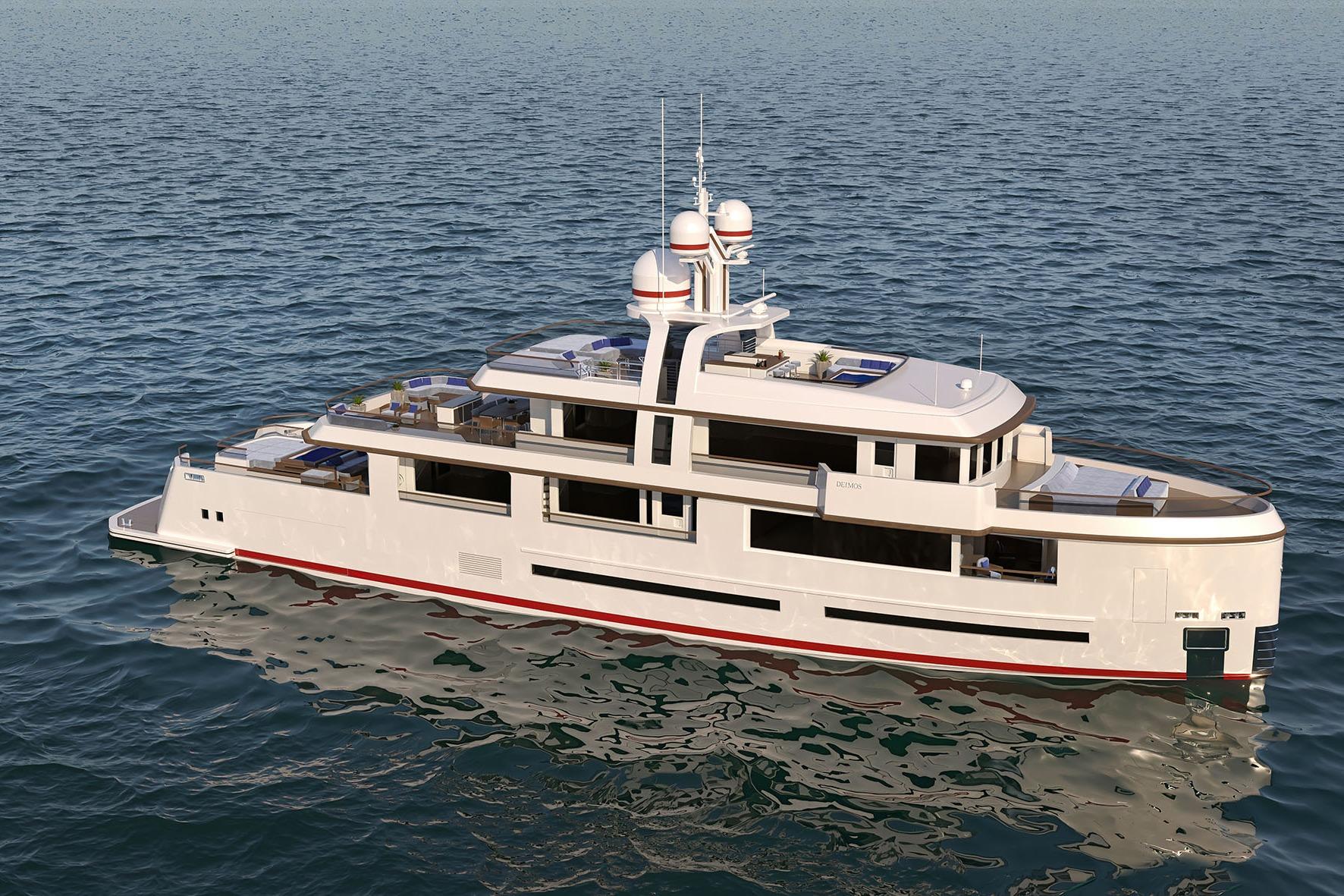 DEIMOS is a 43-meter motor yacht designed by Italian designer Gian Paolo Nari and in build by Aegean Yacht, one of Turkey’s most established shipyards. Conceived as the explorer version of two sister ships, DEIMOS combines robust engineering, long-range autonomy, and striking design within a sub-500 GT platform.
