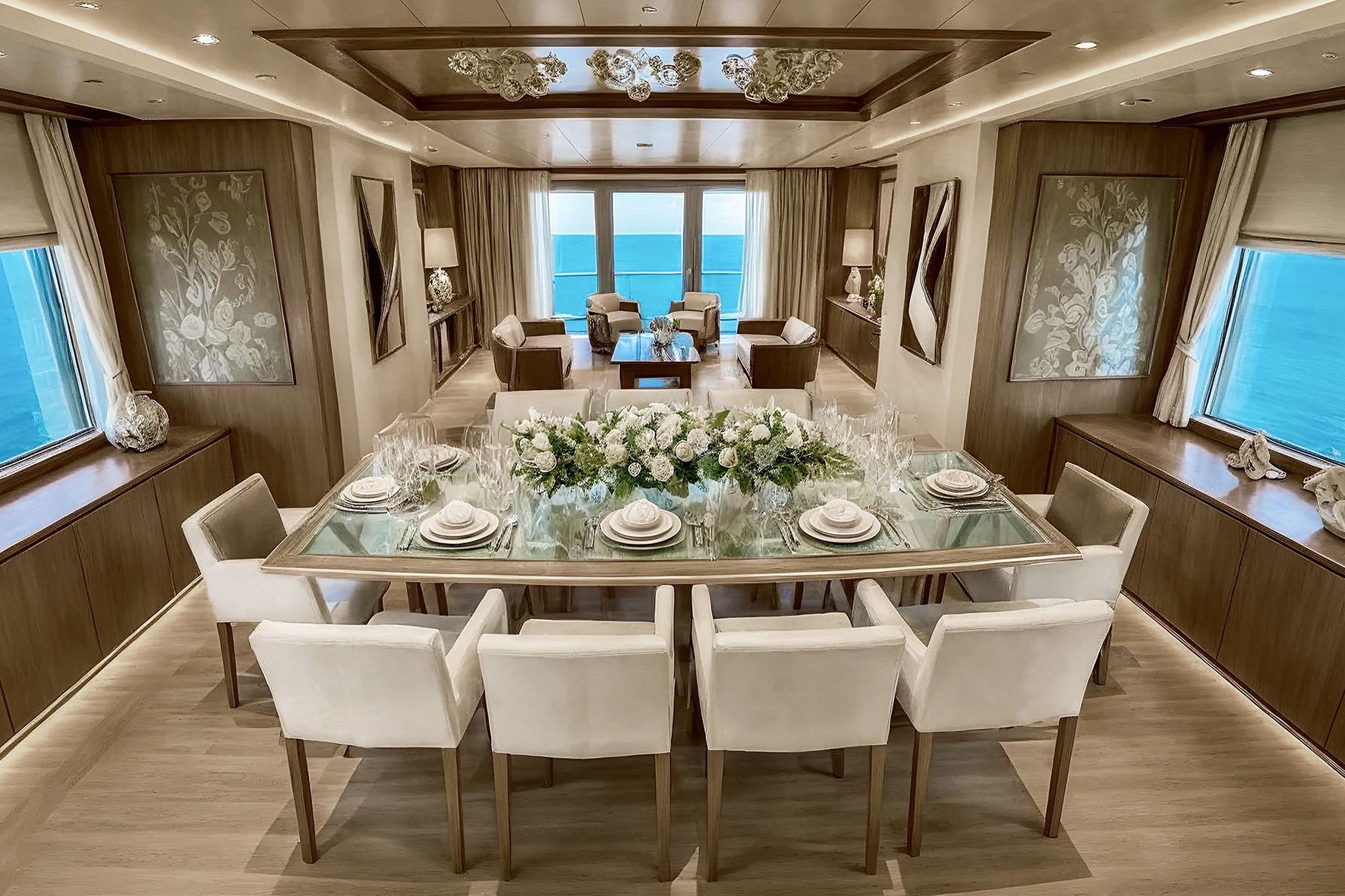 DEIMOS is a a glamorous navetta style, featuring an additional aft pool on the main deck. Inside, the yacht accommodates up to twelve guests across six spacious cabins. The Owner’s suite, measuring over thirty seven square meters, includes a twelve-square-meter private terrace with panoramic views to both port and starboard—an exceptionally rare feature on a yacht of this size.