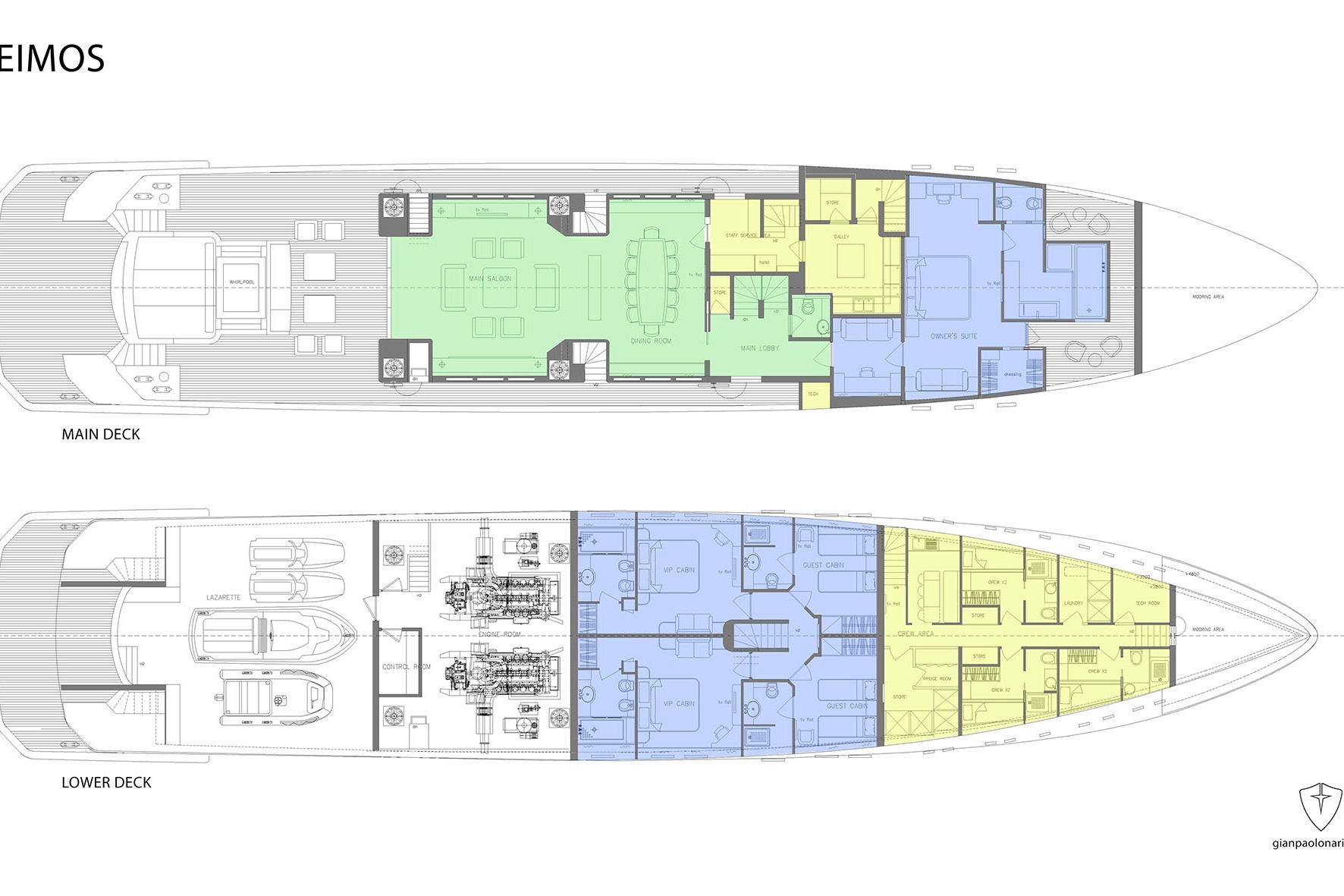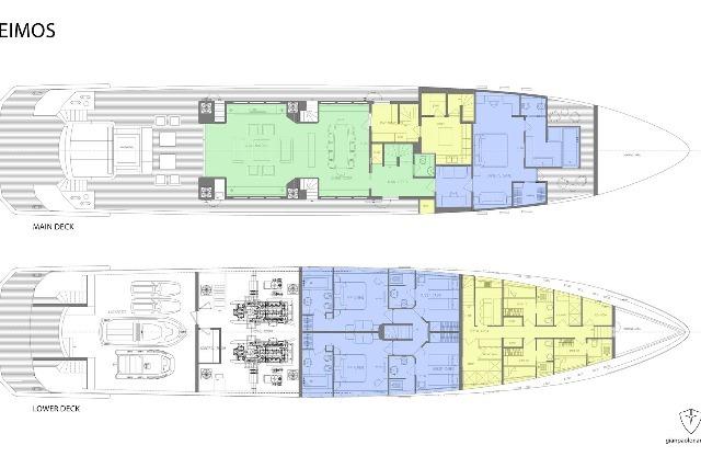 Crew spaces are designed with guest privacy and service efficiency in mind, including three double cabins forward and a dedicated captain’s cabin adjacent to the wheelhouse. Generous storage and technical areas ensure that DEIMOS is prepared for extended cruising and exploration.