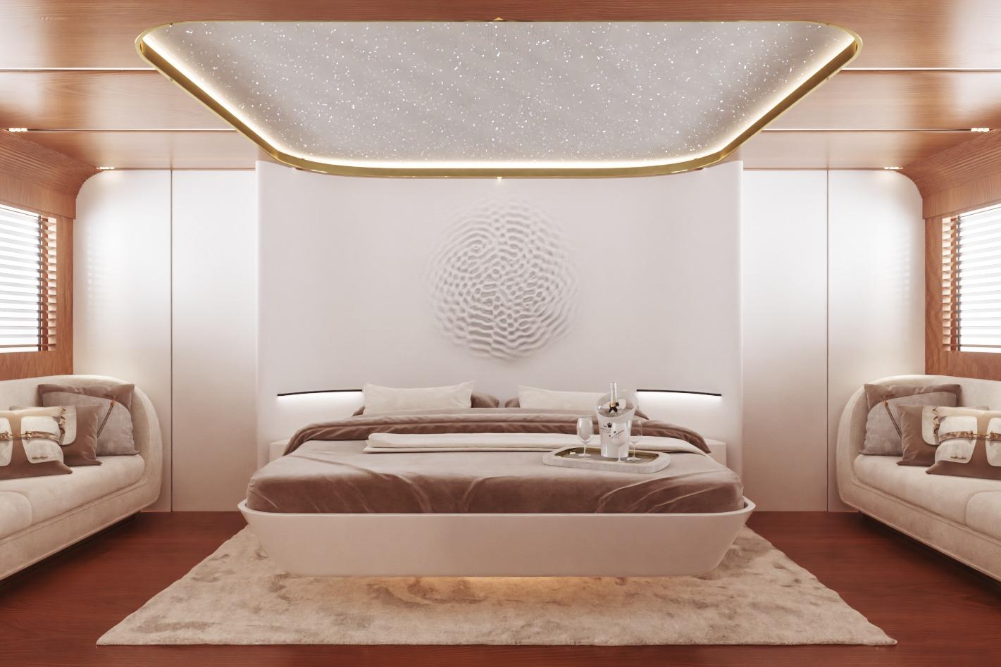 Interior design by Redaelli Associati features a refined, light-filled ambiance, with layout, woodwork, and fabrics still customizable. Accommodation options range from 2 to 4 en-suite cabins for up to 8 guests, plus crew quarters forward.