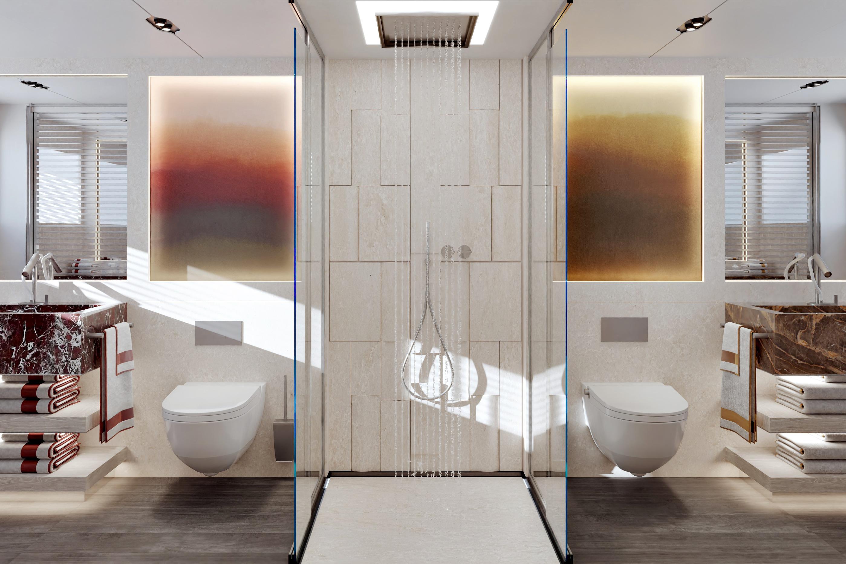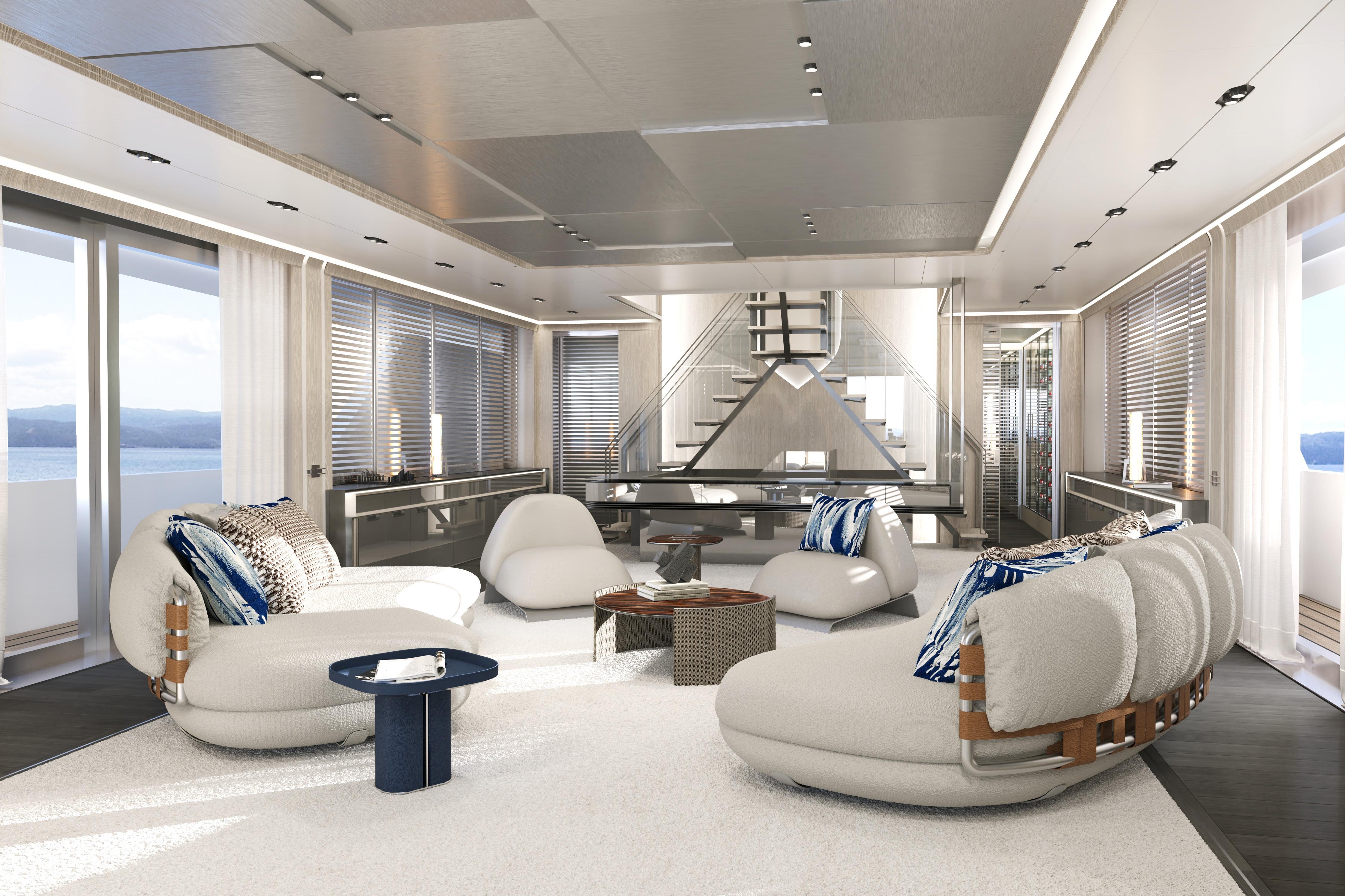 Floating glass-and-metal staircase serves as a sculptural centerpiece, enhancing the yacht’s architectural elegance.