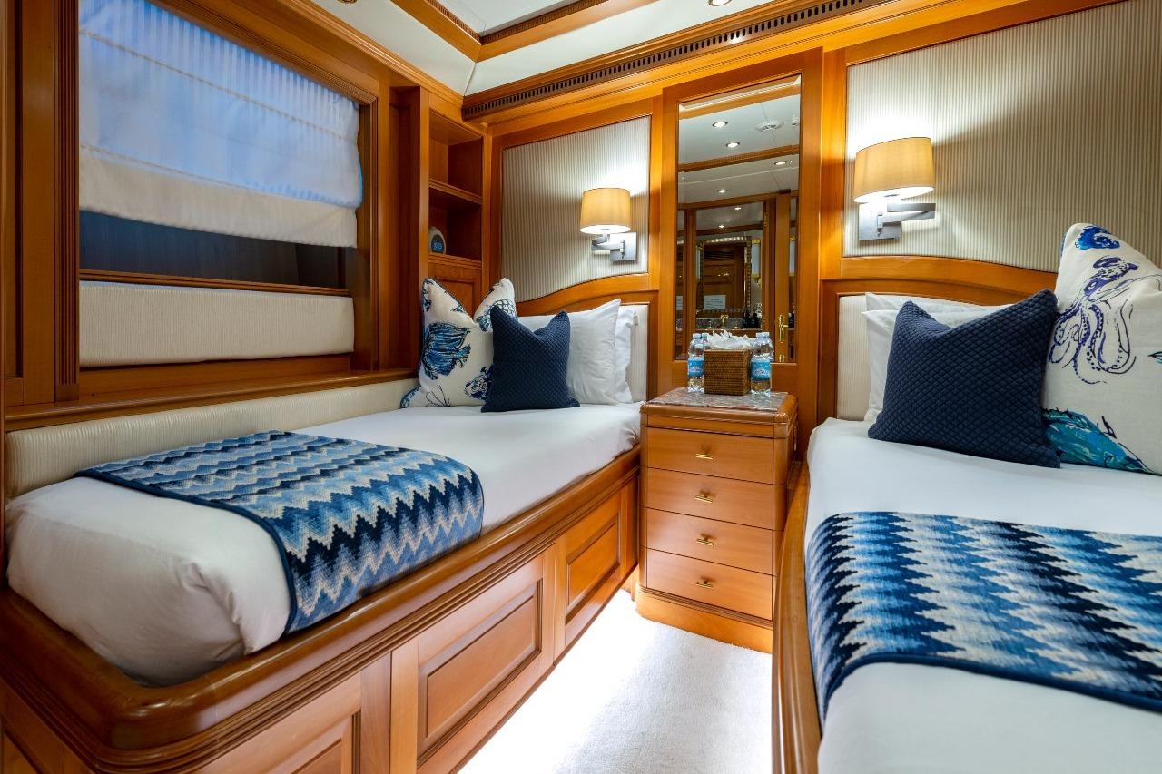 NEW STAR accommodates eight guests in three double suites and a twin stateroom – ideal both for couples and families thanks to the layout separating the master bedroom and the other cabins, ensuring extra level of privacy. The master cabin is situated on the main deck. It is composed of a spacious bathroom with steam shower and Jacuzzi, and an impressive view from the cabin. In addition, master cabin disposes of a large walk-through wardrobe. The VIP cabin is located aft, it is very spacious with plenty of storage and has a beautiful bathroom. Mid ship, you will find a double cabin and twin cabin, both with ensuite bathroom.