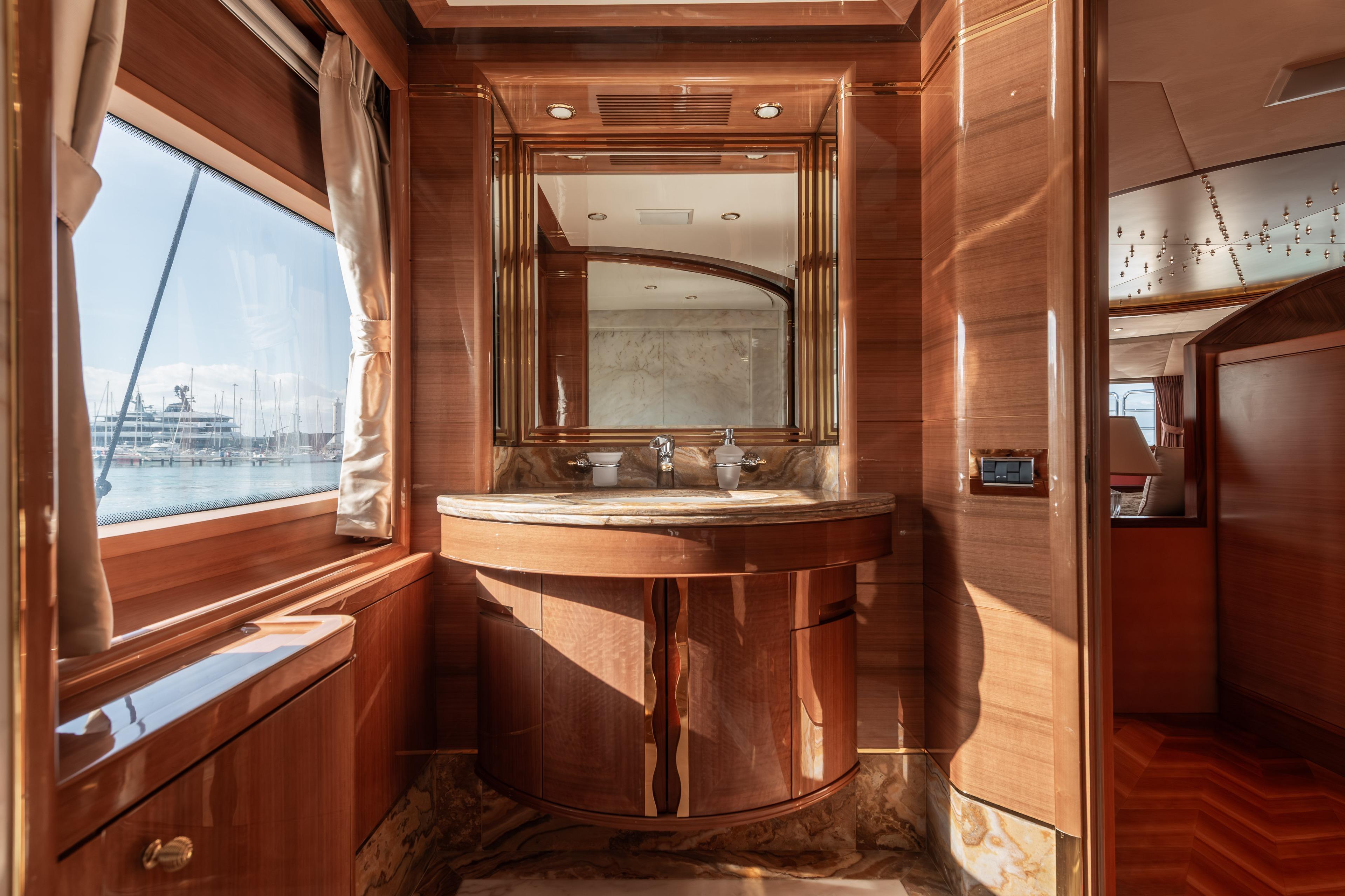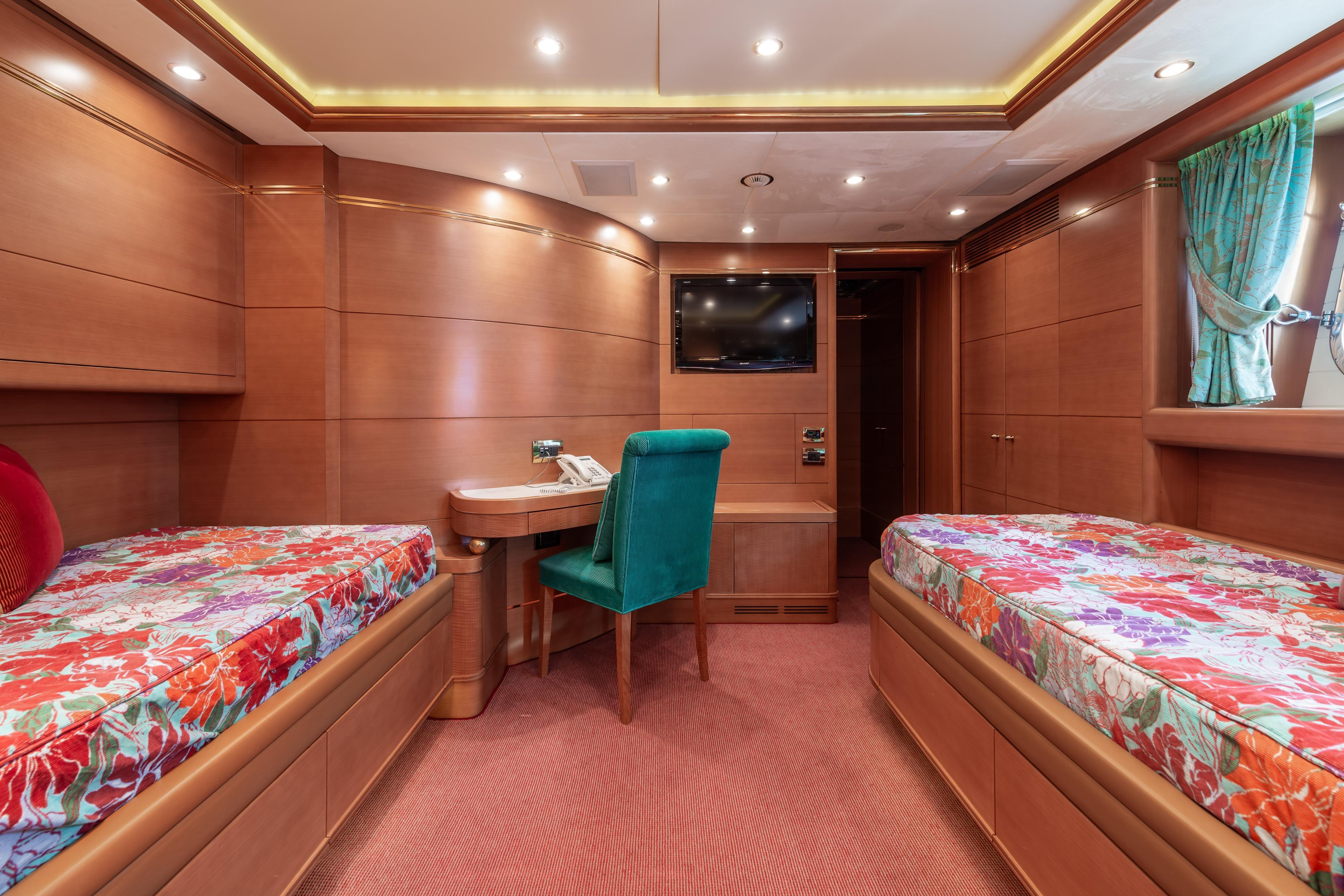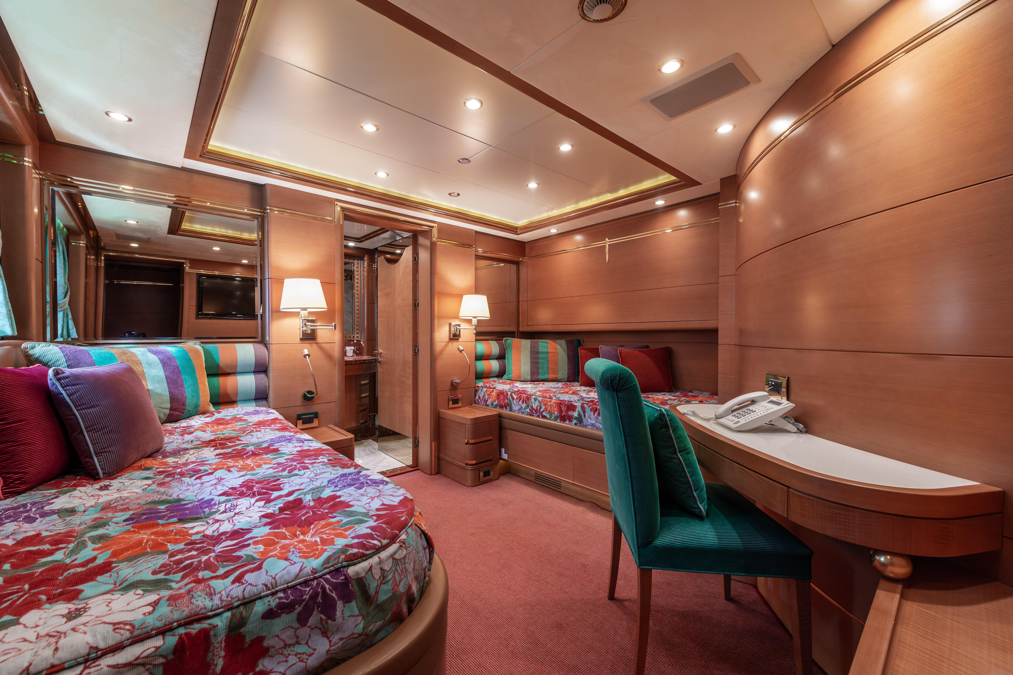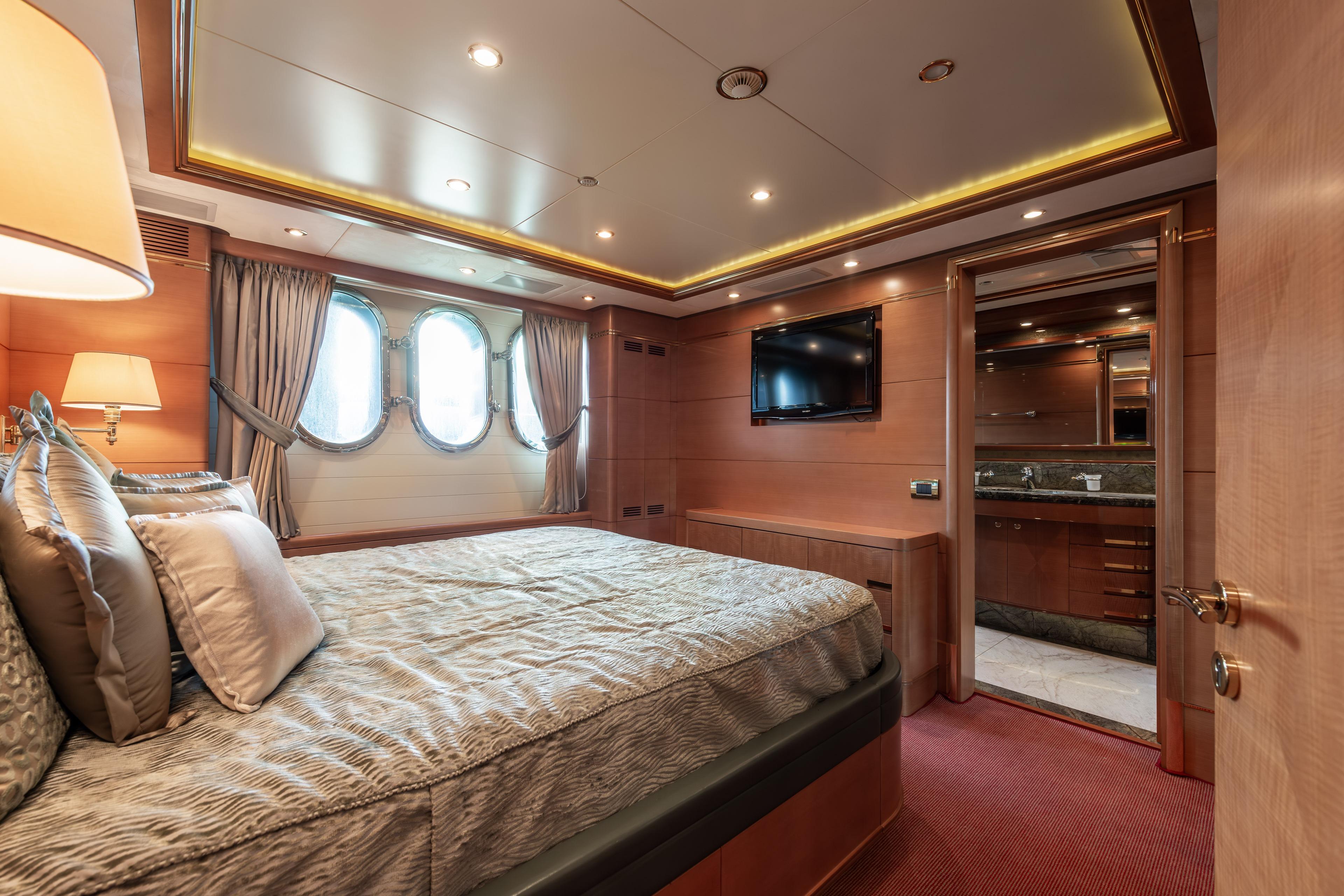 Her interior layout is particularly versatile, boasting an elevator serving all decks and accommodation for up to 15 guests across 7 cabins. The master suite sits forward on the main deck, complemented by two doubles and two twins with Pullman berths on the lower deck, an additional double cabin on the bridge deck, and a single cabin adjacent to the master, which can easily be converted into an owner’s office or other space.