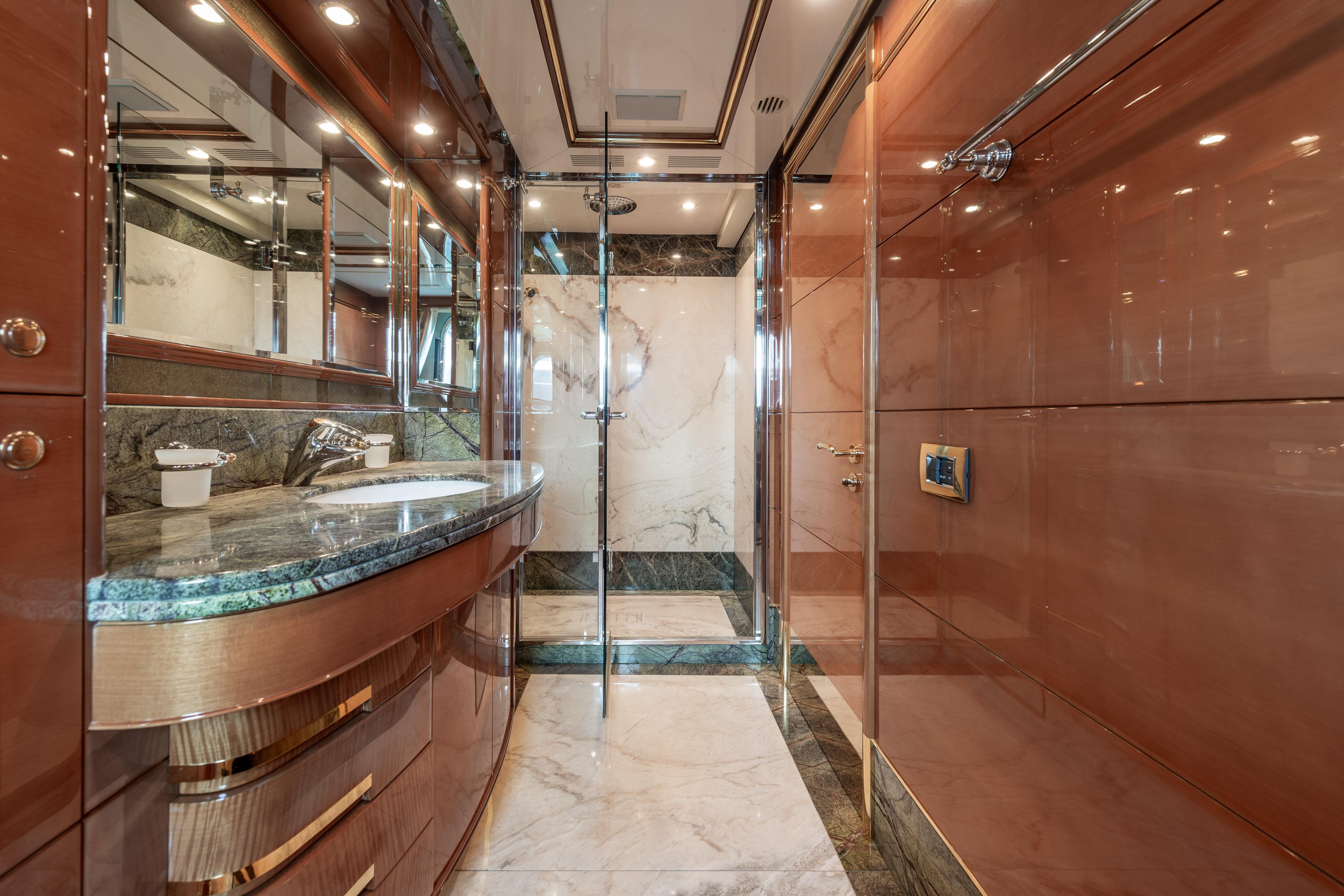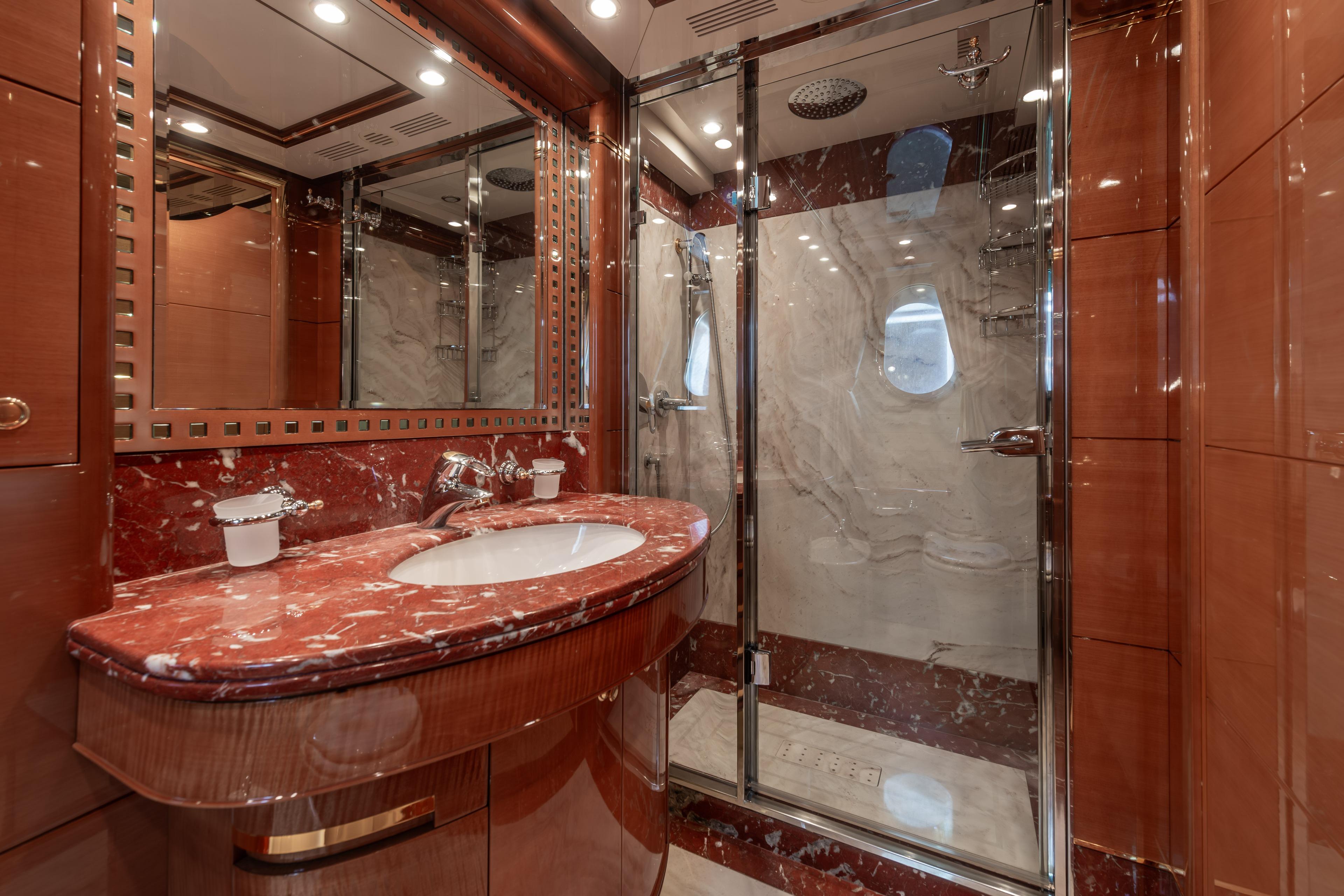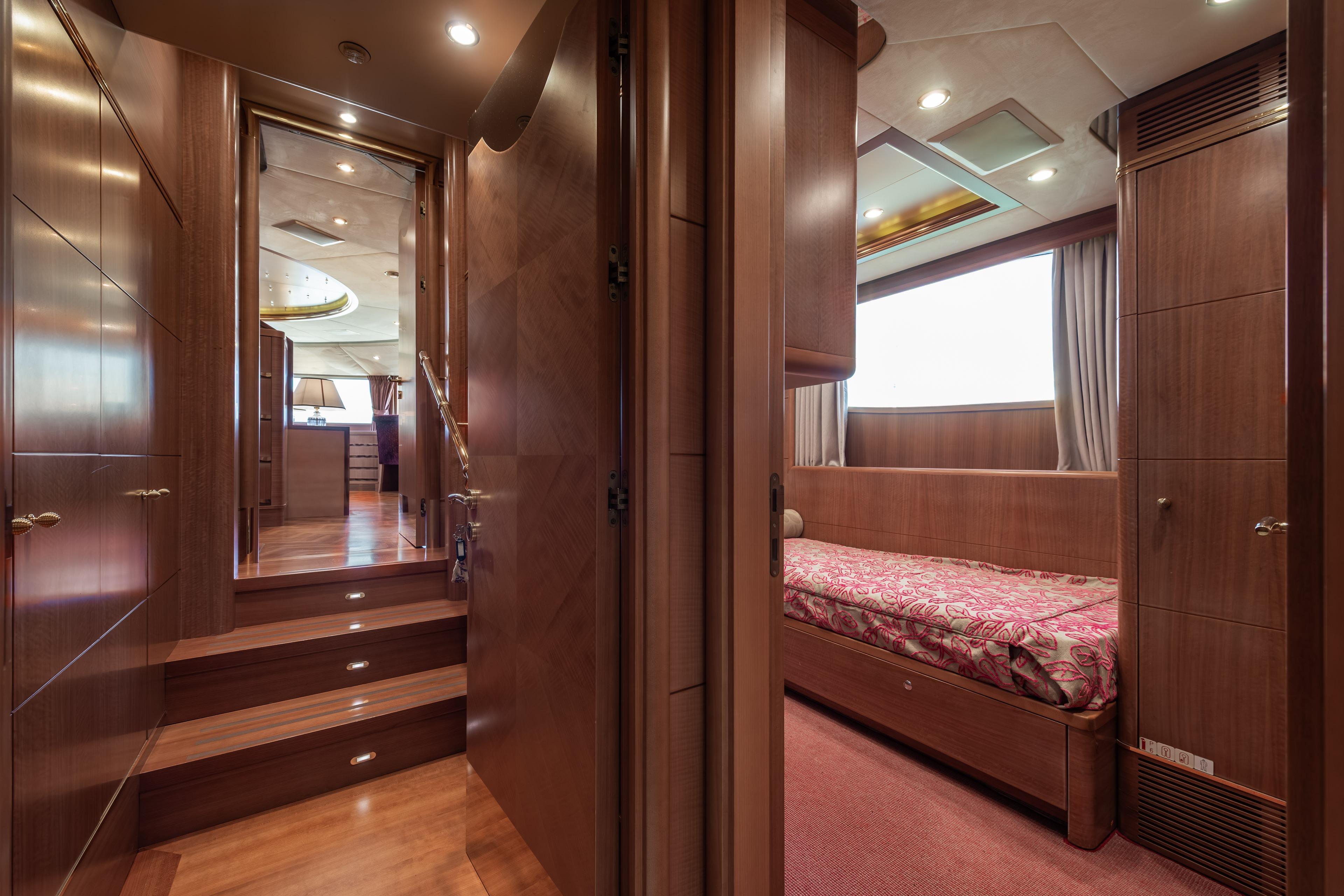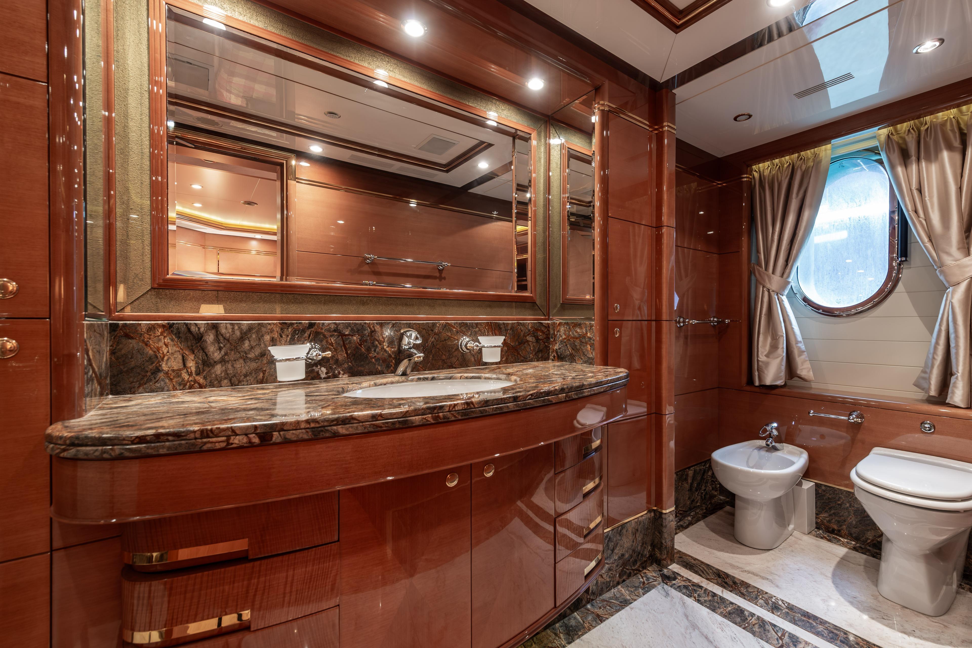 Her interior layout is particularly versatile, boasting an elevator serving all decks and accommodation for up to 15 guests across 7 cabins. The master suite sits forward on the main deck, complemented by two doubles and two twins with Pullman berths on the lower deck, an additional double cabin on the bridge deck, and a single cabin adjacent to the master, which can easily be converted into an owner’s office or other space.