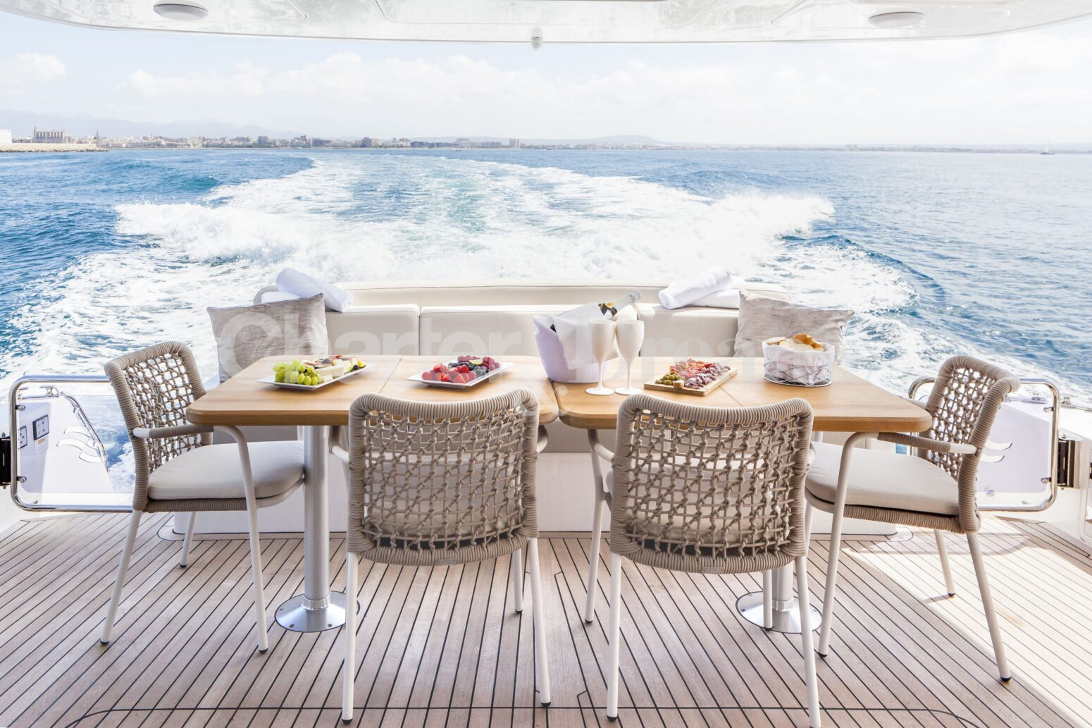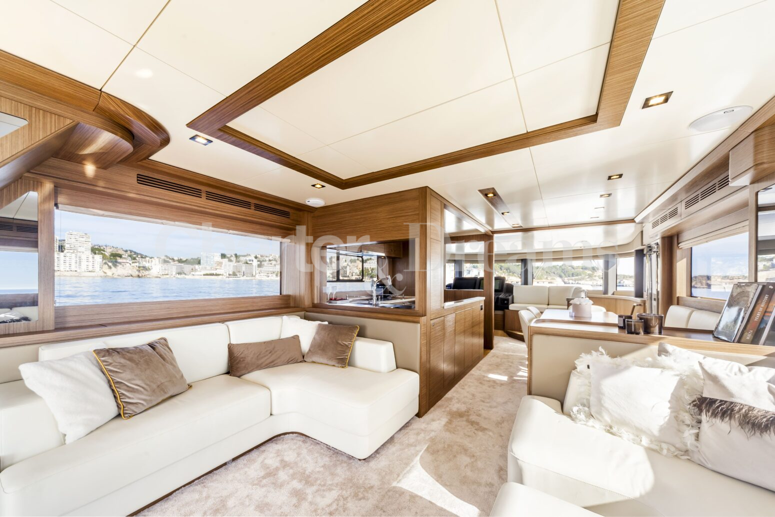 Disfruta de comidas al aire libre en la cubierta de popa, relájate en la amplia zona de proa o sube al flybridge para descansar al aire libre, tomar cócteles al atardecer y navegar contemplando la costa. En el interior, el salón principal es luminoso y contemporáneo, con una cómoda zona de estar y comedor interior. Los estabilizadores Seakeeper garantizan una navegación suave y confortable.