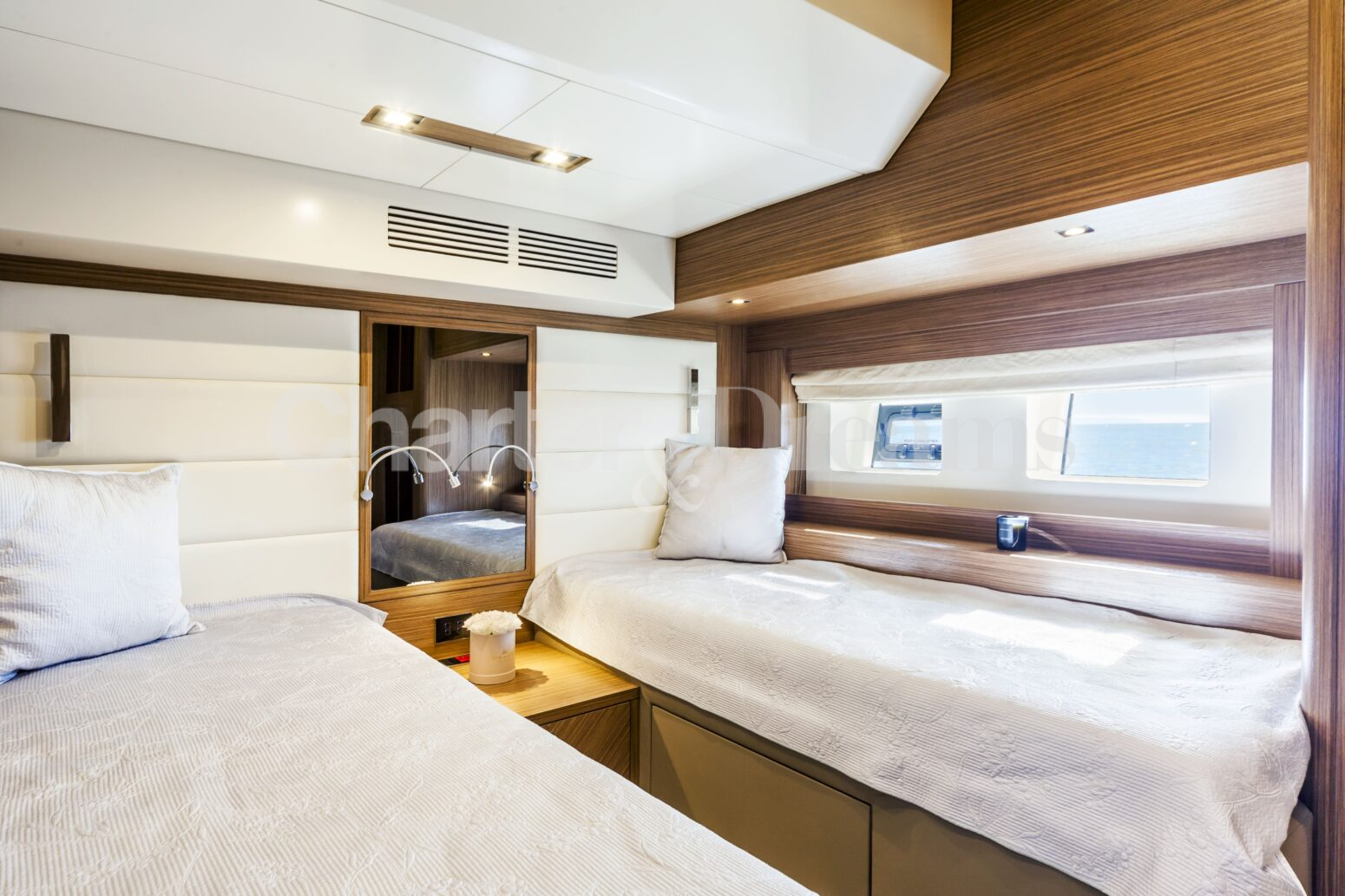 Durante la noche, SALACIA ofrece alojamiento para hasta 6 invitados en tres camarotes: una suite principal de manga completa, un camarote VIP doble y un camarote doble. Durante el día, puede acoger hasta 12 invitados, siendo ideal tanto para charters privados como para encuentros sociales en el mar.