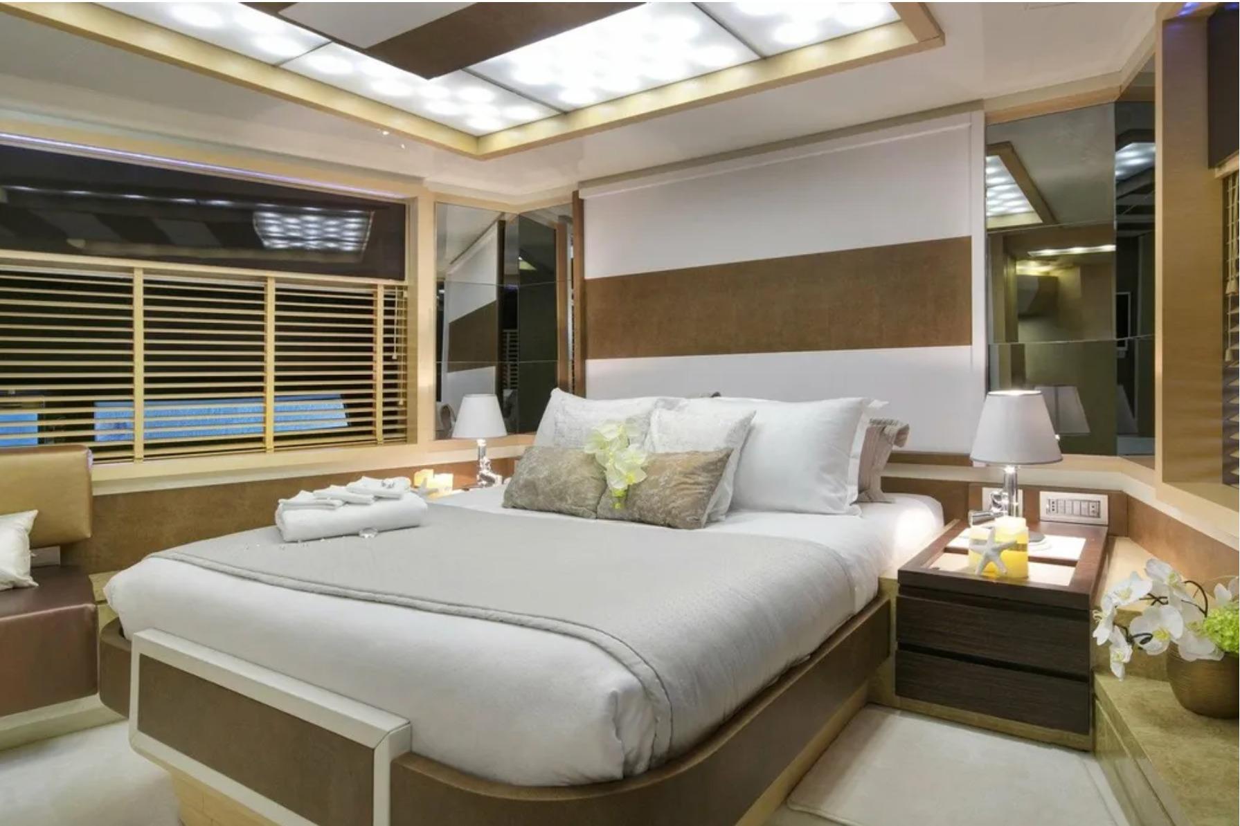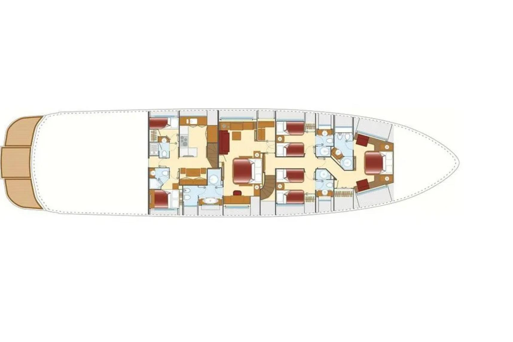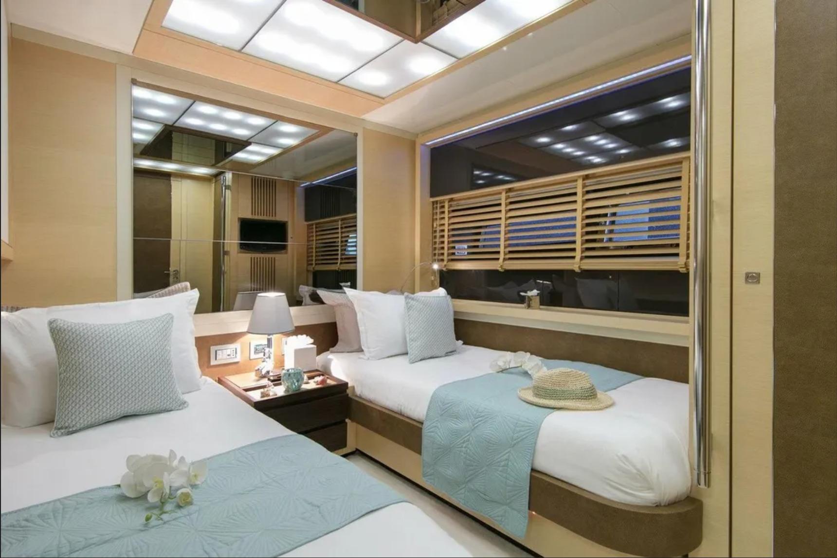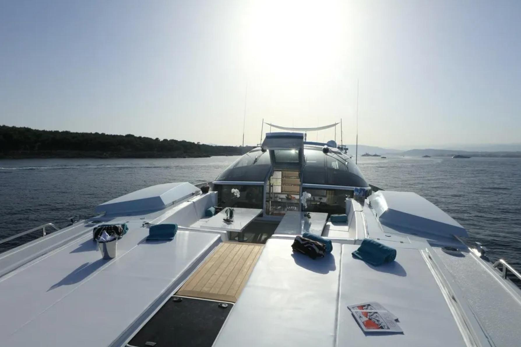 The yacht accommodates up to 10 guests across four well-appointed cabins, supported by four crew, achieving an excellent balance of performance, comfort, and onboard lifestyle. Equipped with Seakeeper gyroscopic stabilizers, it ensures outstanding stability both underway and at anchor.