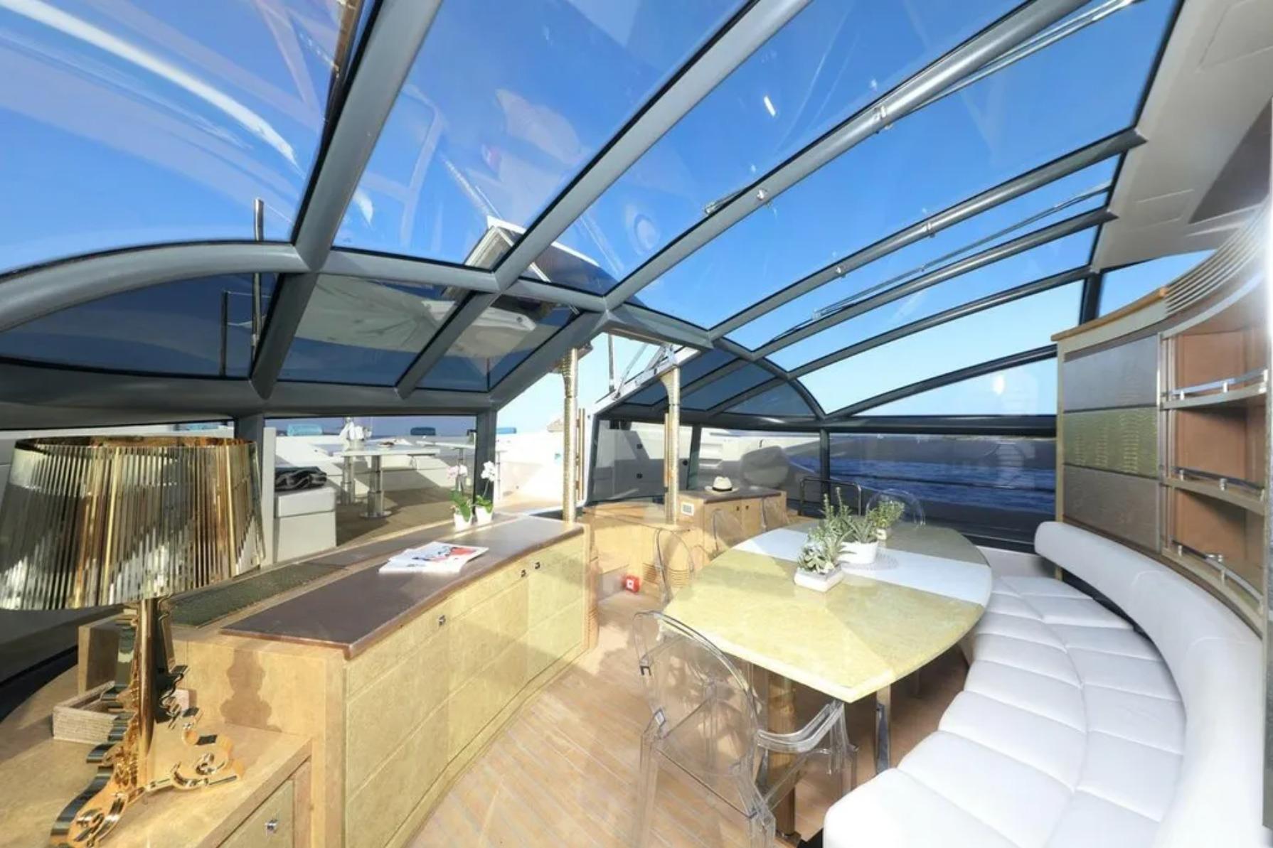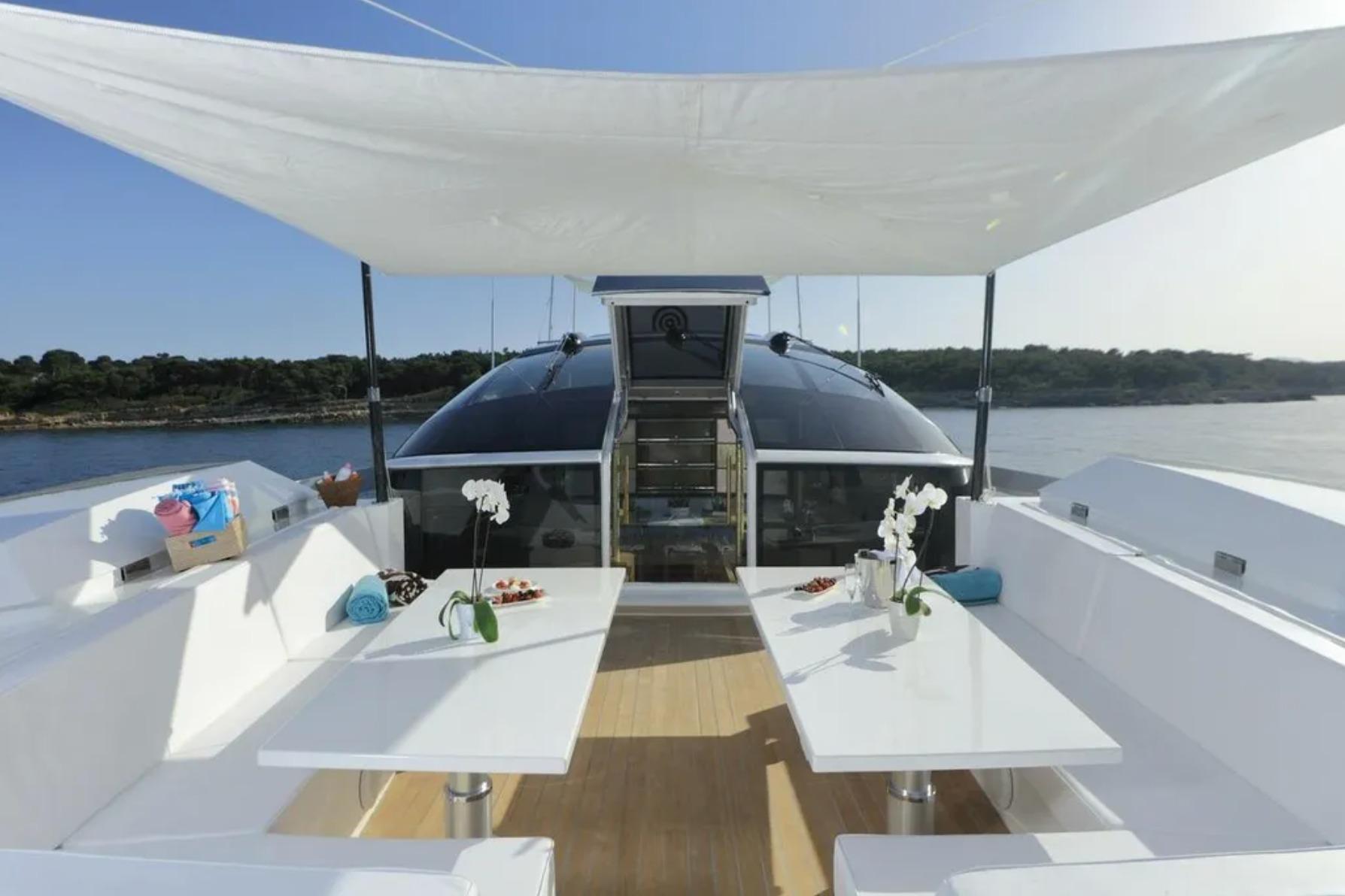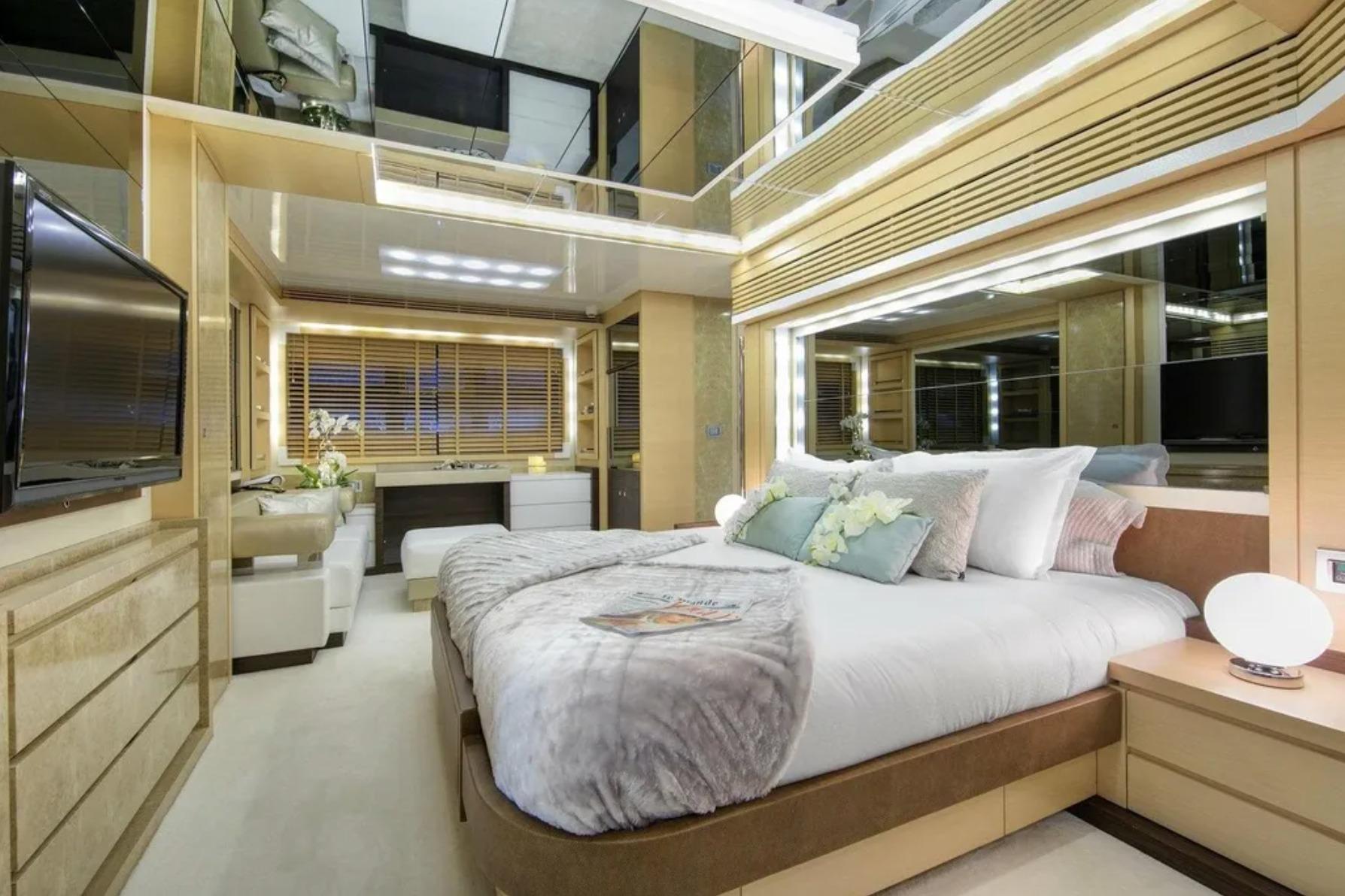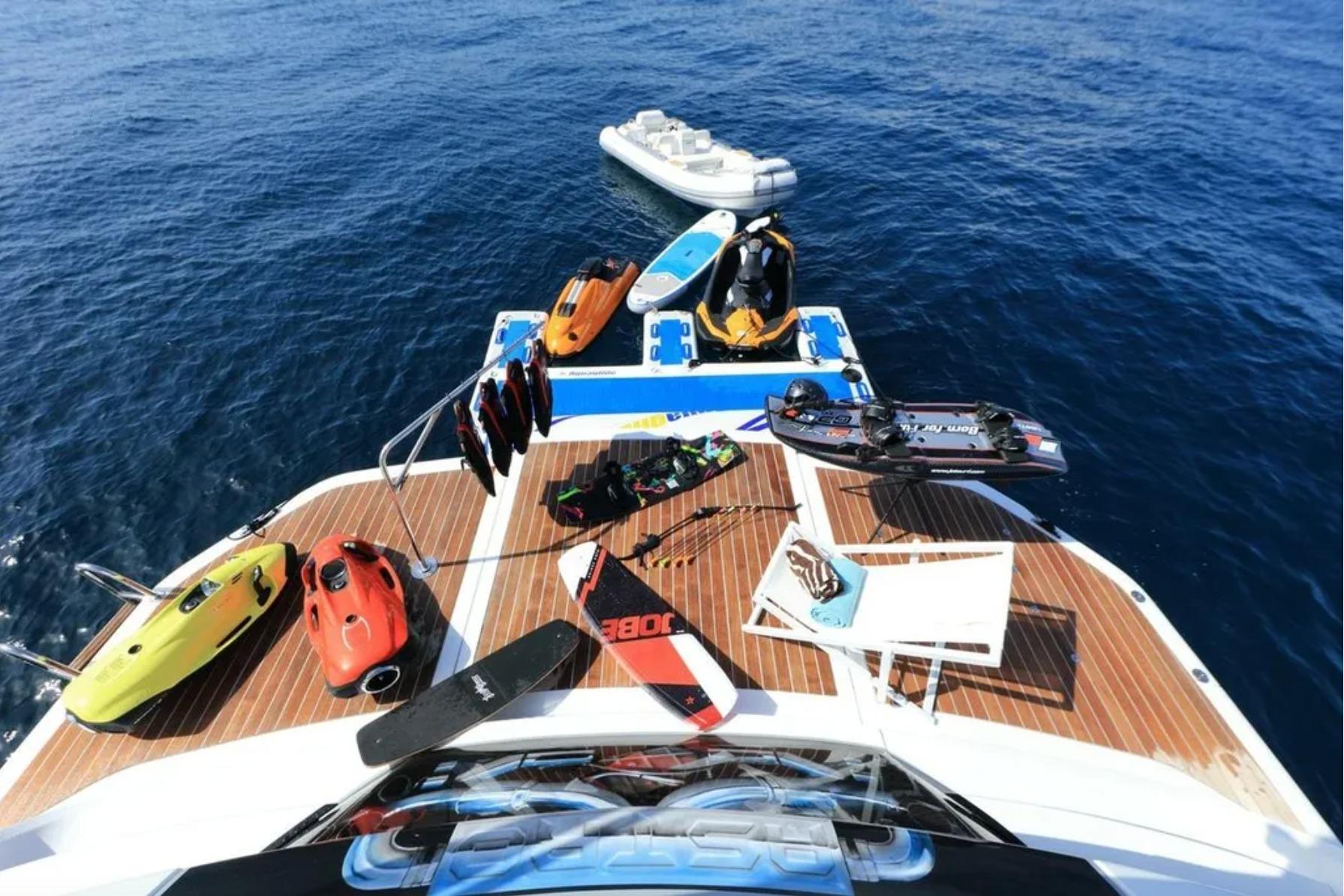 The yacht accommodates up to 10 guests across four well-appointed cabins, supported by four crew, achieving an excellent balance of performance, comfort, and onboard lifestyle. Equipped with Seakeeper gyroscopic stabilizers, it ensures outstanding stability both underway and at anchor.