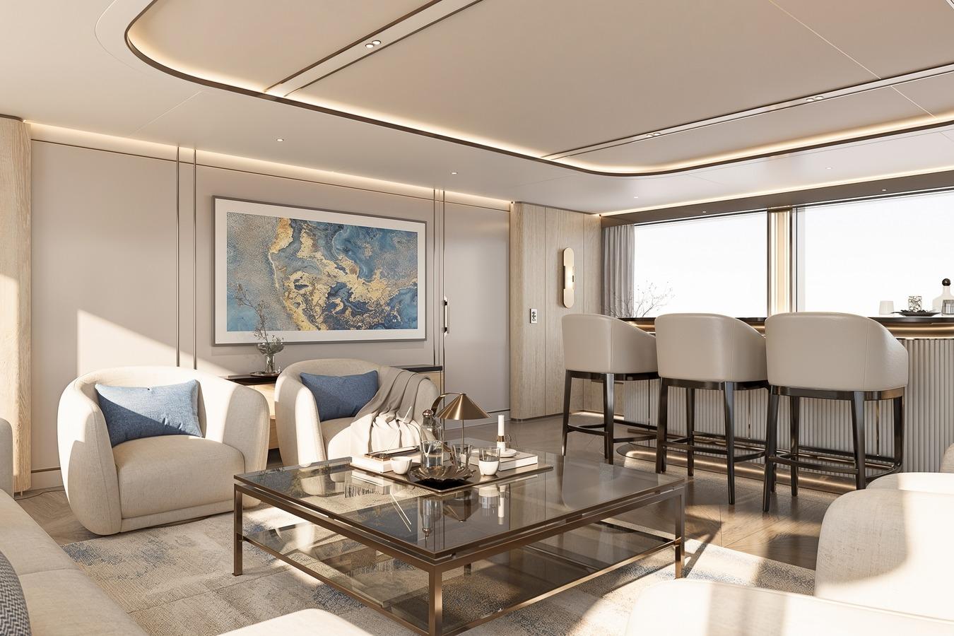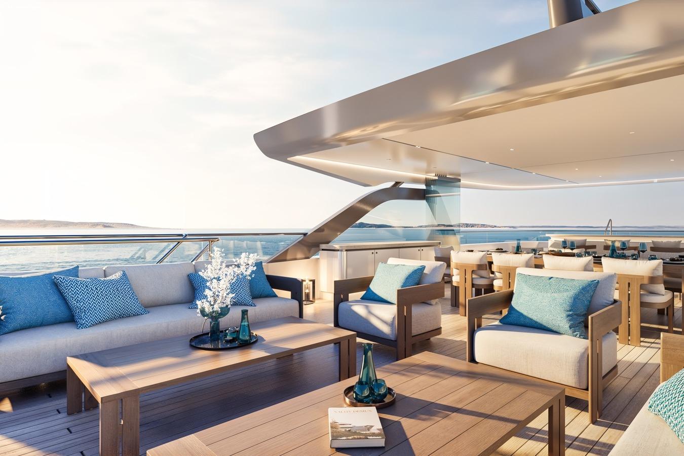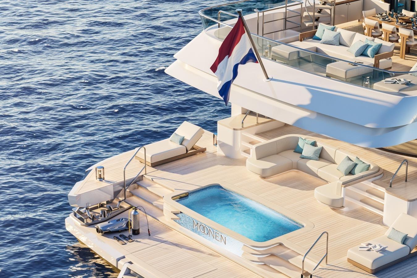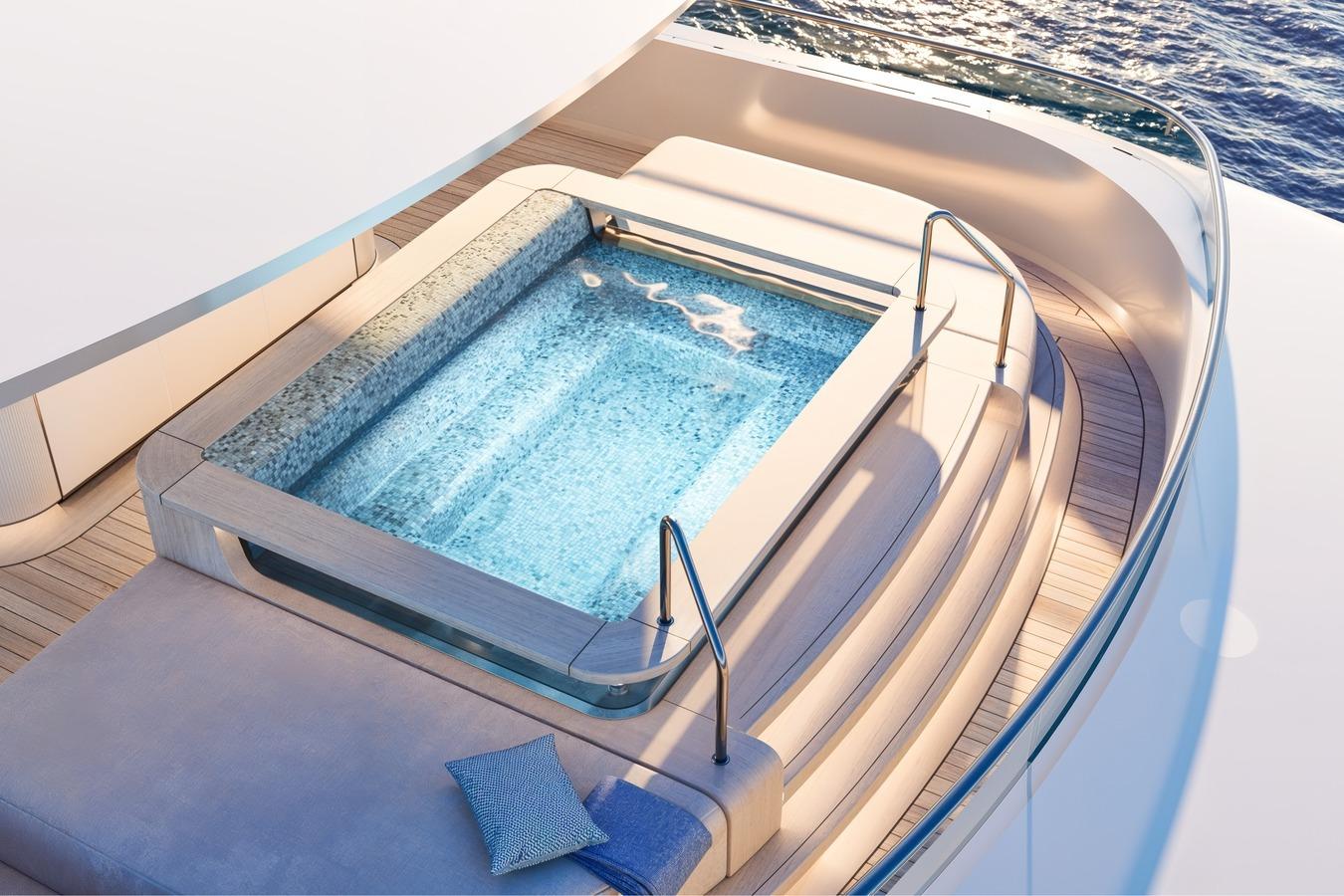 Her exterior, drawn by René van der Velden, balances elegant lines with generous lifestyle spaces. A stepped aft-deck pool area with openable bulwarks transforms into a private terrace on the sea, while a hydraulic Z-lift swim platform with integrated stairs ensures effortless access to the water.