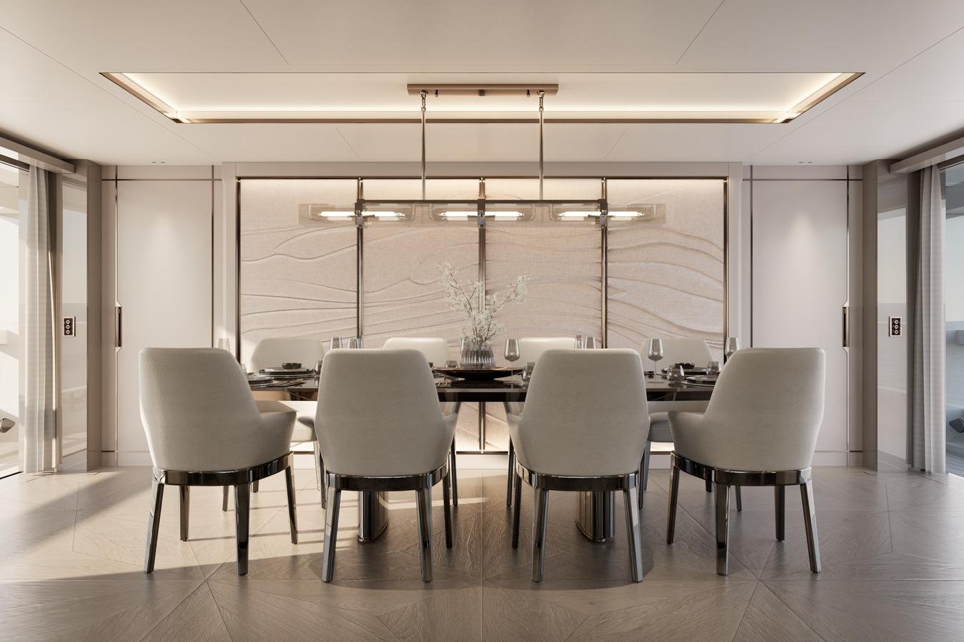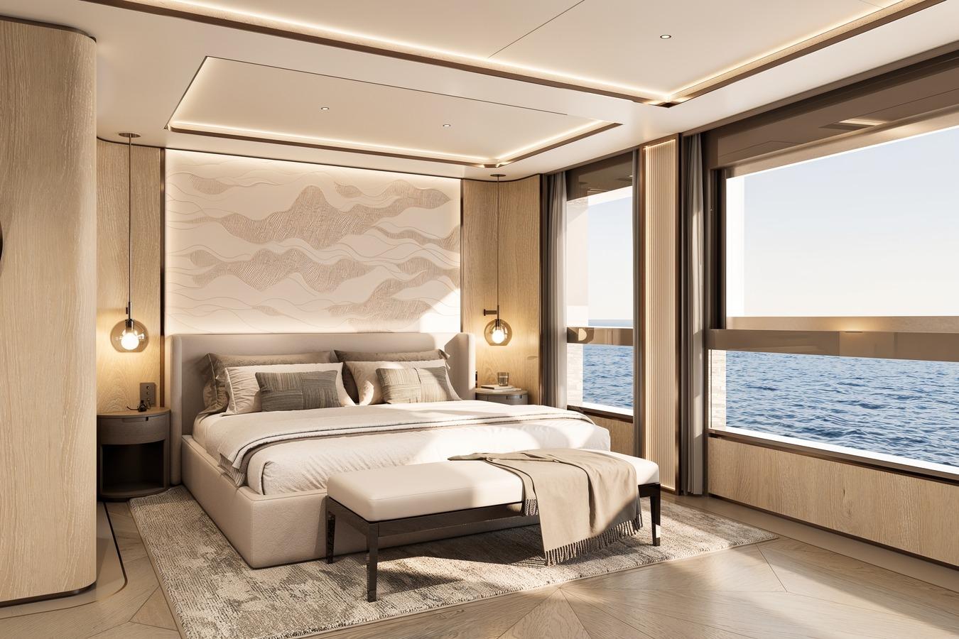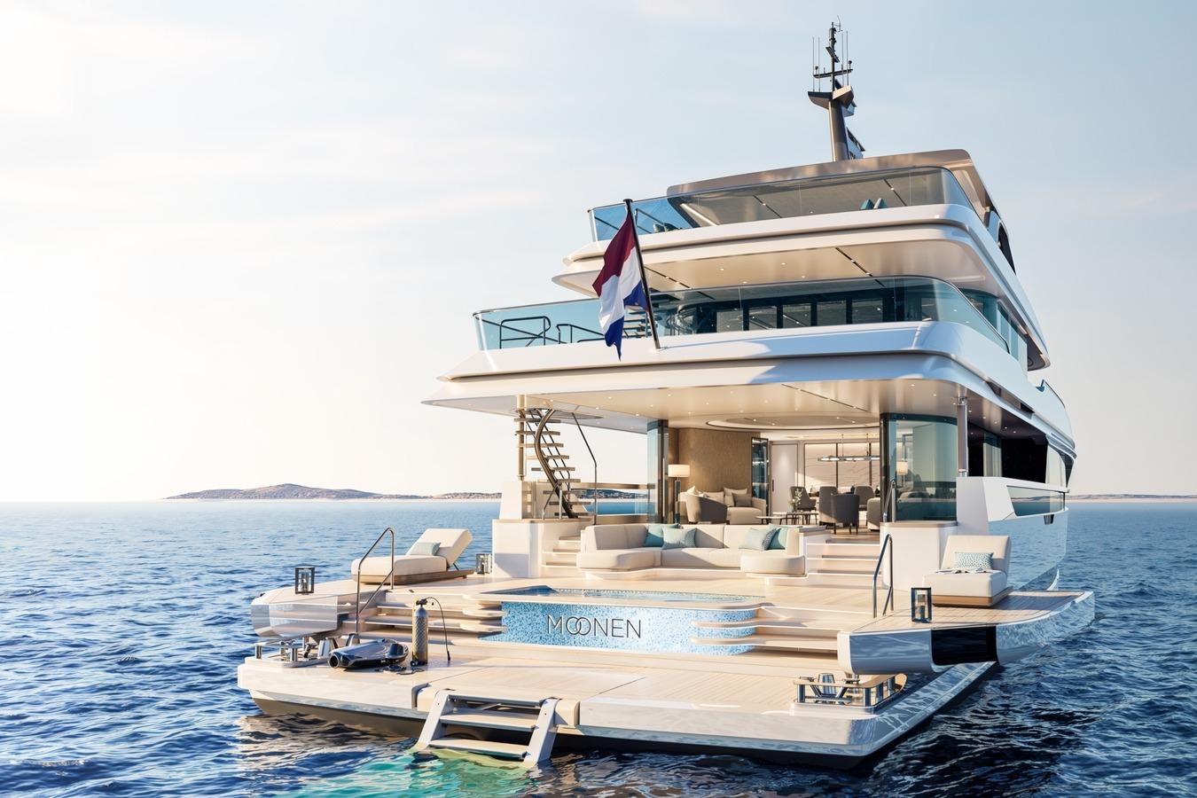 Her exterior, drawn by René van der Velden, balances elegant lines with generous lifestyle spaces. A stepped aft-deck pool area with openable bulwarks transforms into a private terrace on the sea, while a hydraulic Z-lift swim platform with integrated stairs ensures effortless access to the water.