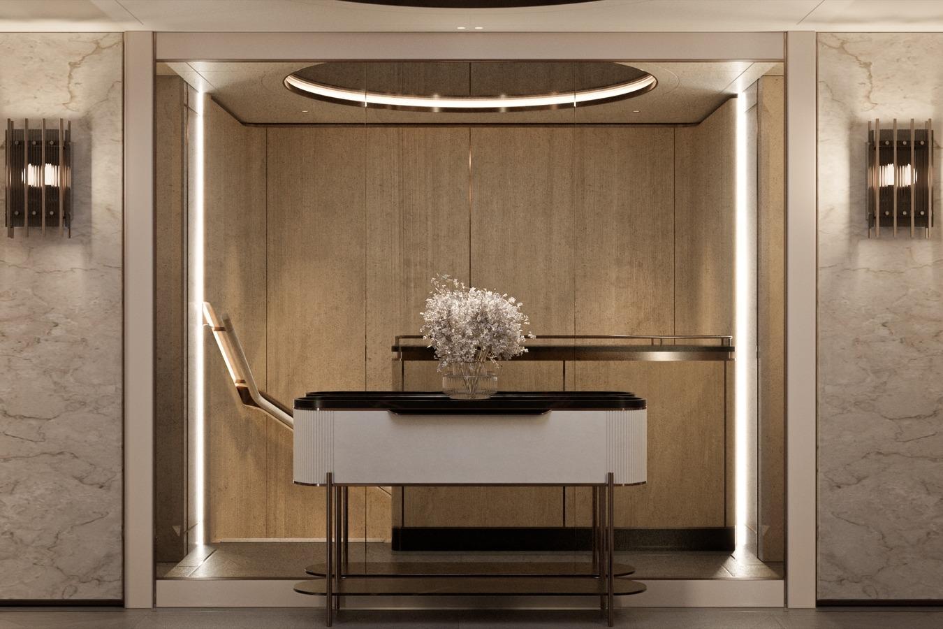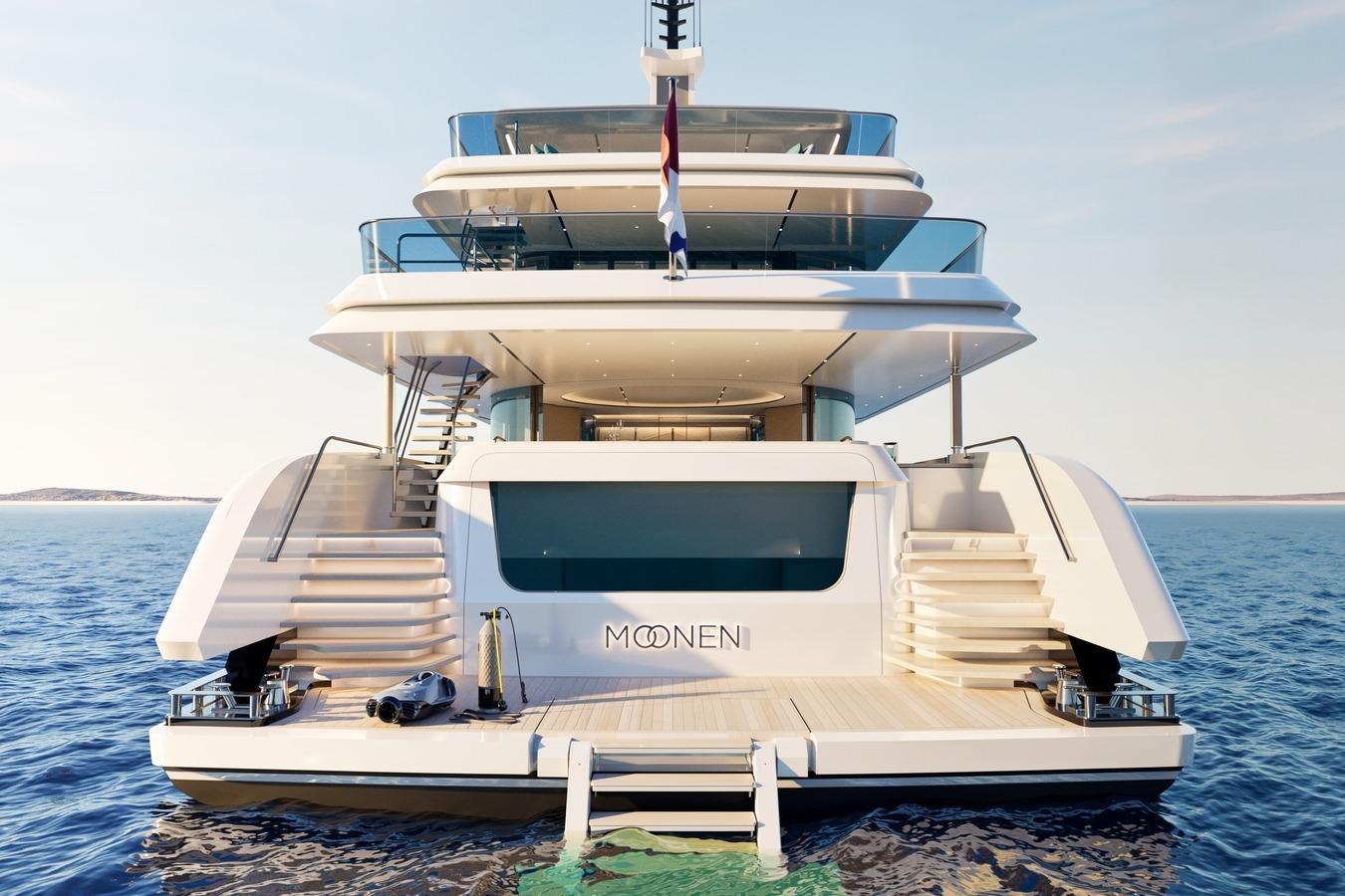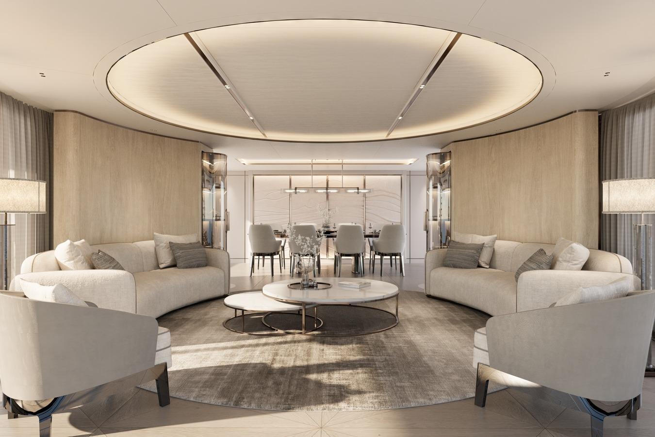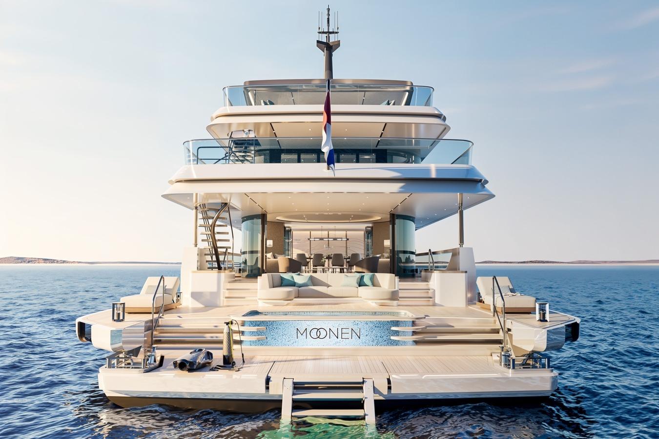 Her exterior, drawn by René van der Velden, balances elegant lines with generous lifestyle spaces. A stepped aft-deck pool area with openable bulwarks transforms into a private terrace on the sea, while a hydraulic Z-lift swim platform with integrated stairs ensures effortless access to the water.