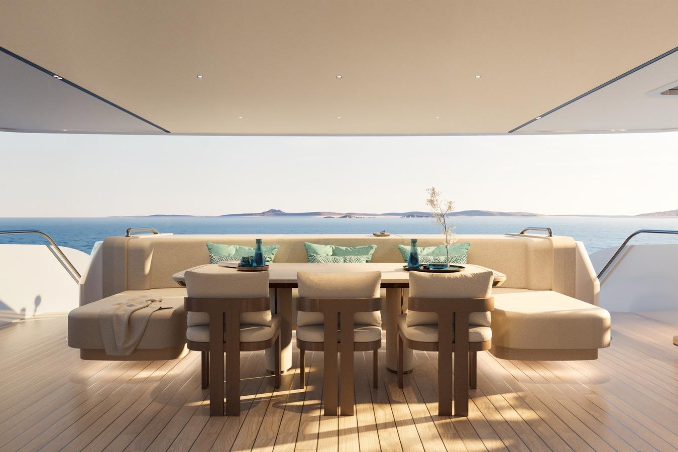 The salon opens to the aft deck with round sliding glass doors, creating seamless indoor-outdoor living. Guests can enjoy sheltered dining and a bar beneath the hardtop, while the sundeck layout and furniture can be tailored to an owner’s personal vision. For those seeking ultimate flexibility, the MALLORCA also offers the option of an indoor beach club, combining leisure with practical storage and tender access.
