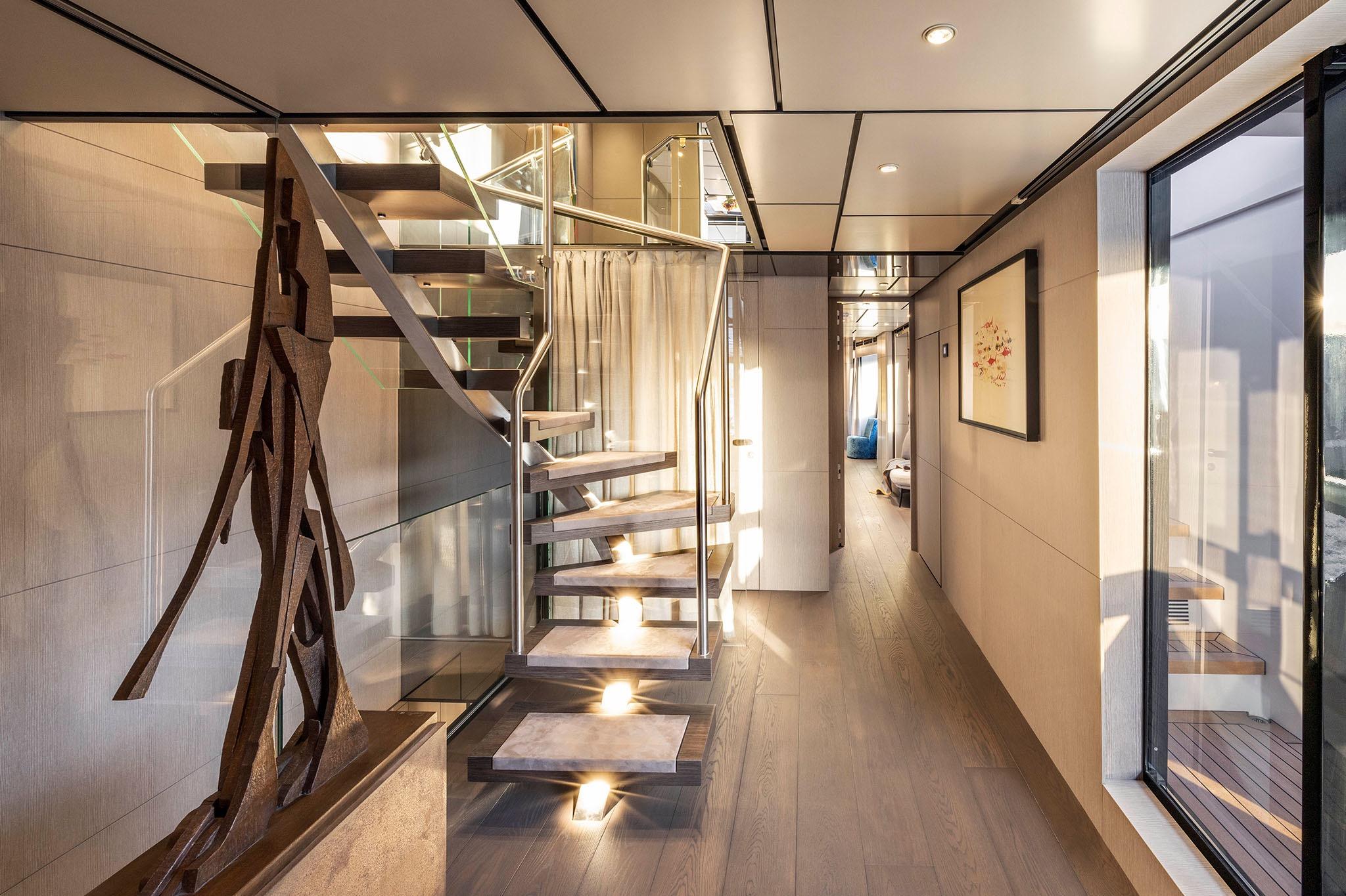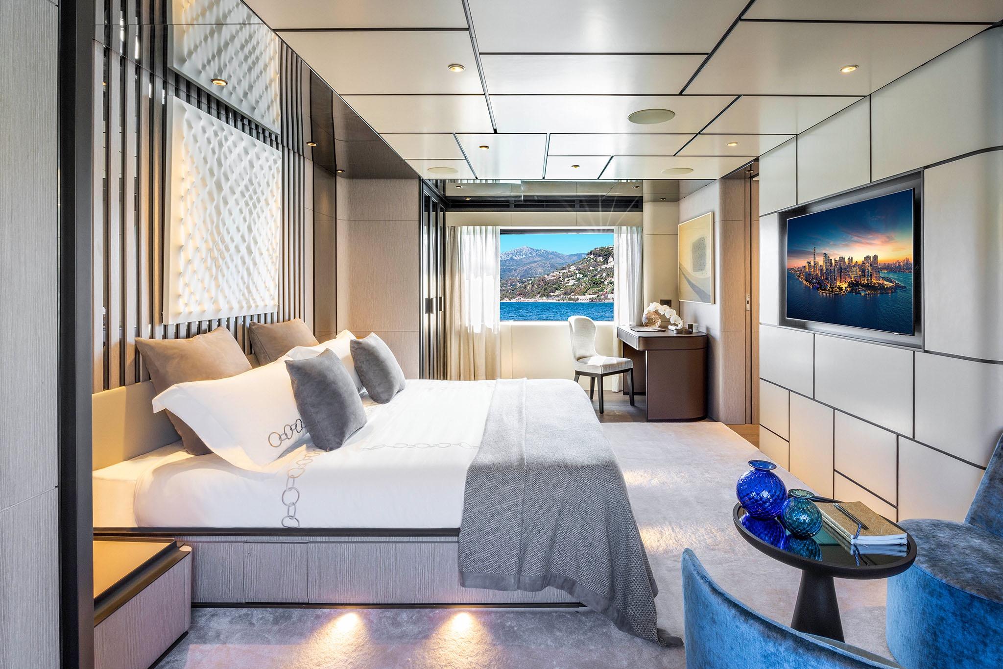 Gli interni riflettono un’eleganza pura e sofisticata, con ogni cabina concepita come spazio privato caratterizzato da finiture artigianali e arredi su misura. Le ampie vetrate panoramiche catturano la luce naturale e incorniciano il mare, fondendo armoniosamente interno ed esterno. Tra le soluzioni più esclusive, la suite armatoriale a tutta ampiezza vanta un balcone privato con vista mare, un dettaglio raro che trasforma l’ambiente in un autentico rifugio di intimità ed eleganza.
