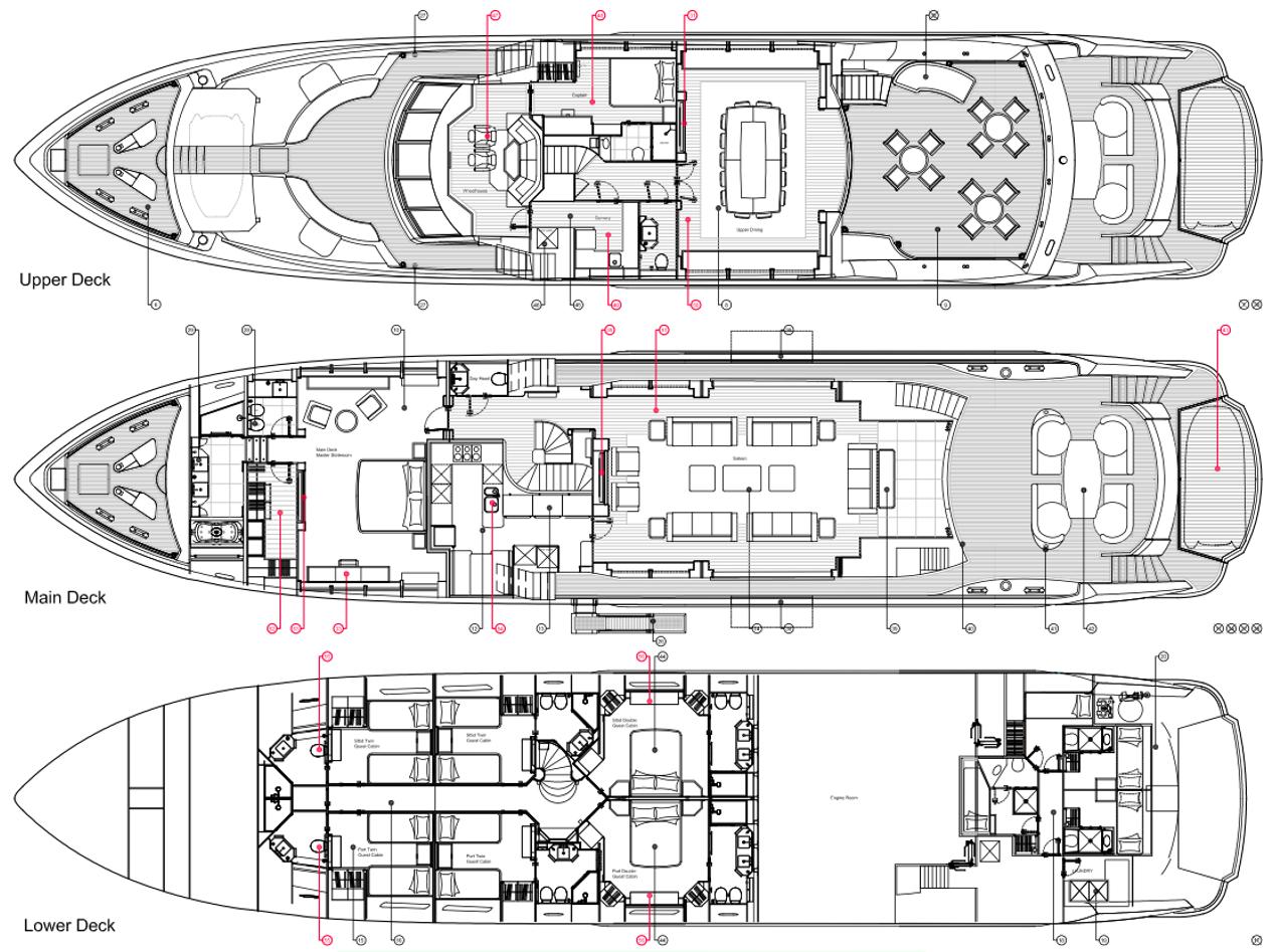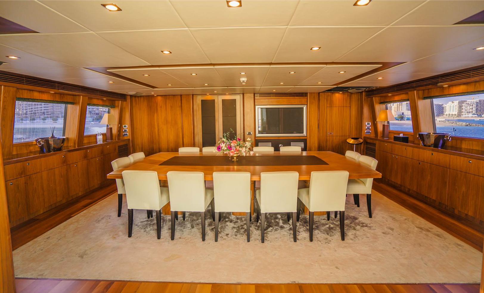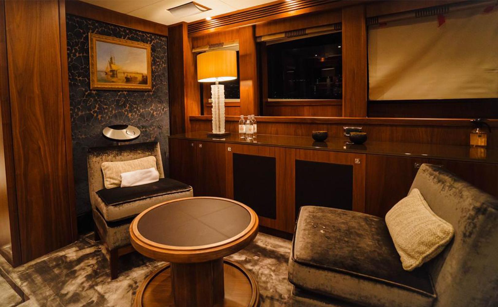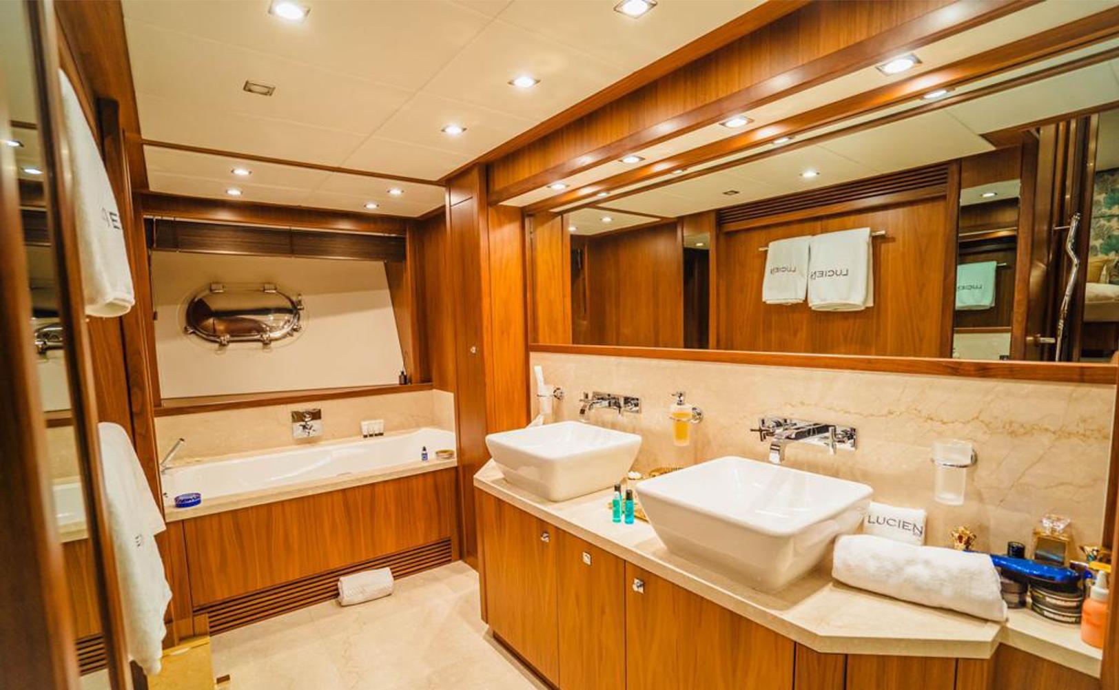 Sunseeker 40M’s stunning interior showcases modern elegance. The inner dining area was relocated to a private dining room on the top deck, creating a significantly bigger than standard main saloon with additional space created by port and starboard balconies. The master suite sits on the main deck while two doubles and four twins are located below, all completed with ensuite bathroom facilities.