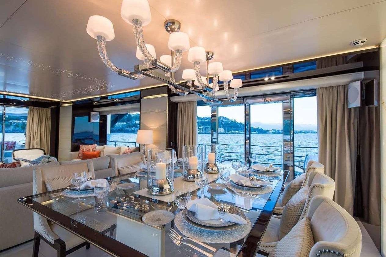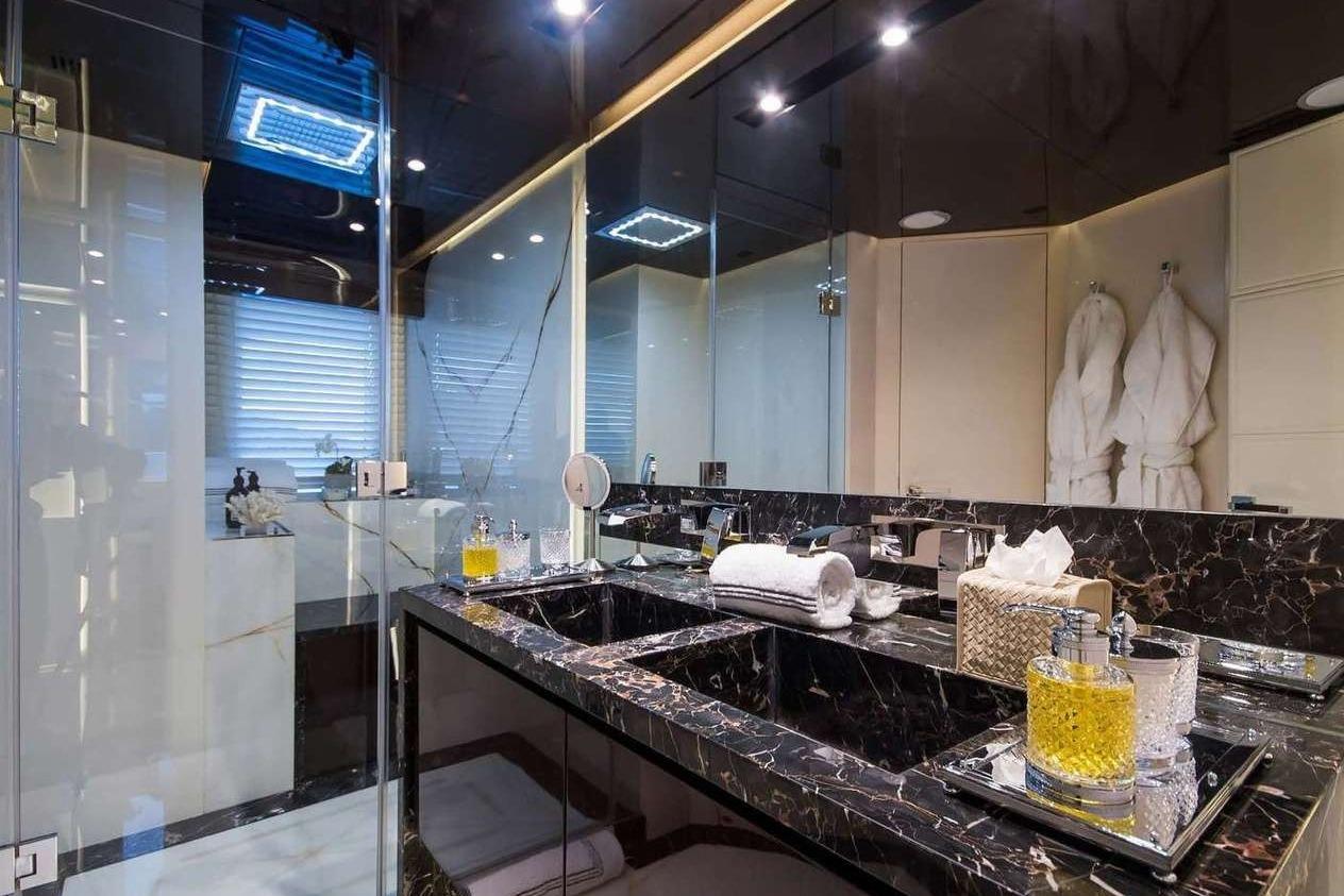 Filled with features, including a fold-down balcony on the main salon dining, panoramic views from the master cabin, a private forward lounging area forward of the master, jacuzzi on the sundeck, a back-lit onyx wall and handcrafted mosaics.