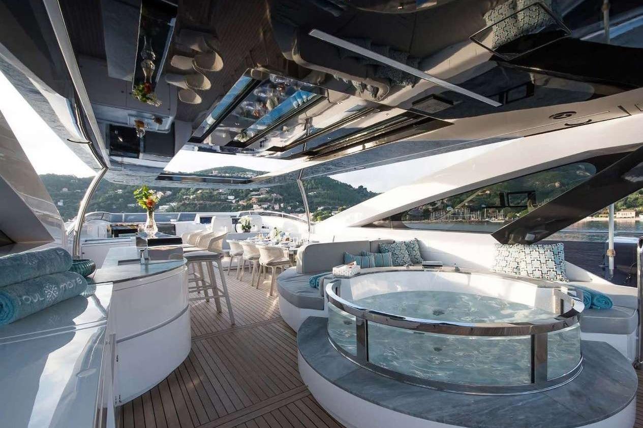 The upper deck is a superb sundeck, with full dining table, bar, jacuzzi, sunbathing area, flybridge and bridge access.