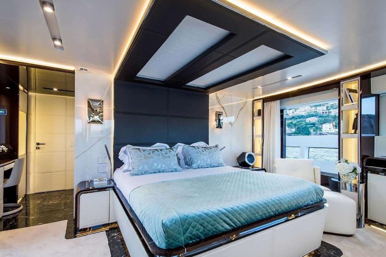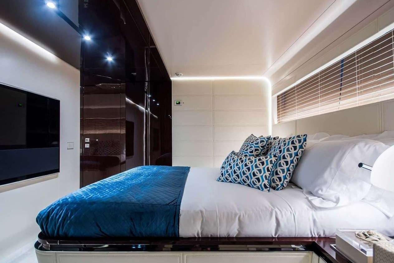 From the main deck aft exterior dining room, you arrive directly into the main salon, open to the interior dining and then forward to the galley, lobby, day head and then forward to the Master suite. The Master comprises a walk in dressing, ensuite with large shower and double sink, a full beam master bedroom with panoramic views forward to a secluded sunbathing area with access directly from the master.