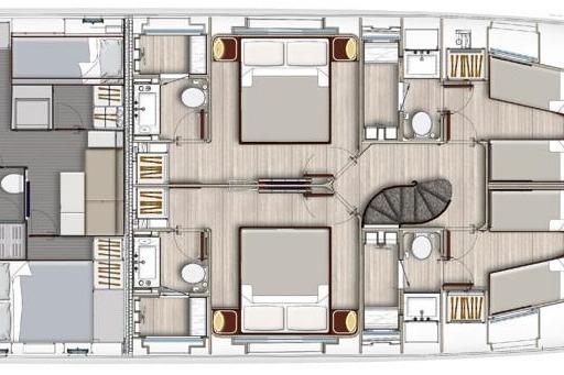 Salvagni’s interior offers a harmonious blend of textures and natural light. Five guest cabins accommodate ten guests; master suite midships with safe and expanded bed; VIP aft and forward cabins with refined detailing; crew area for three with two bathrooms.