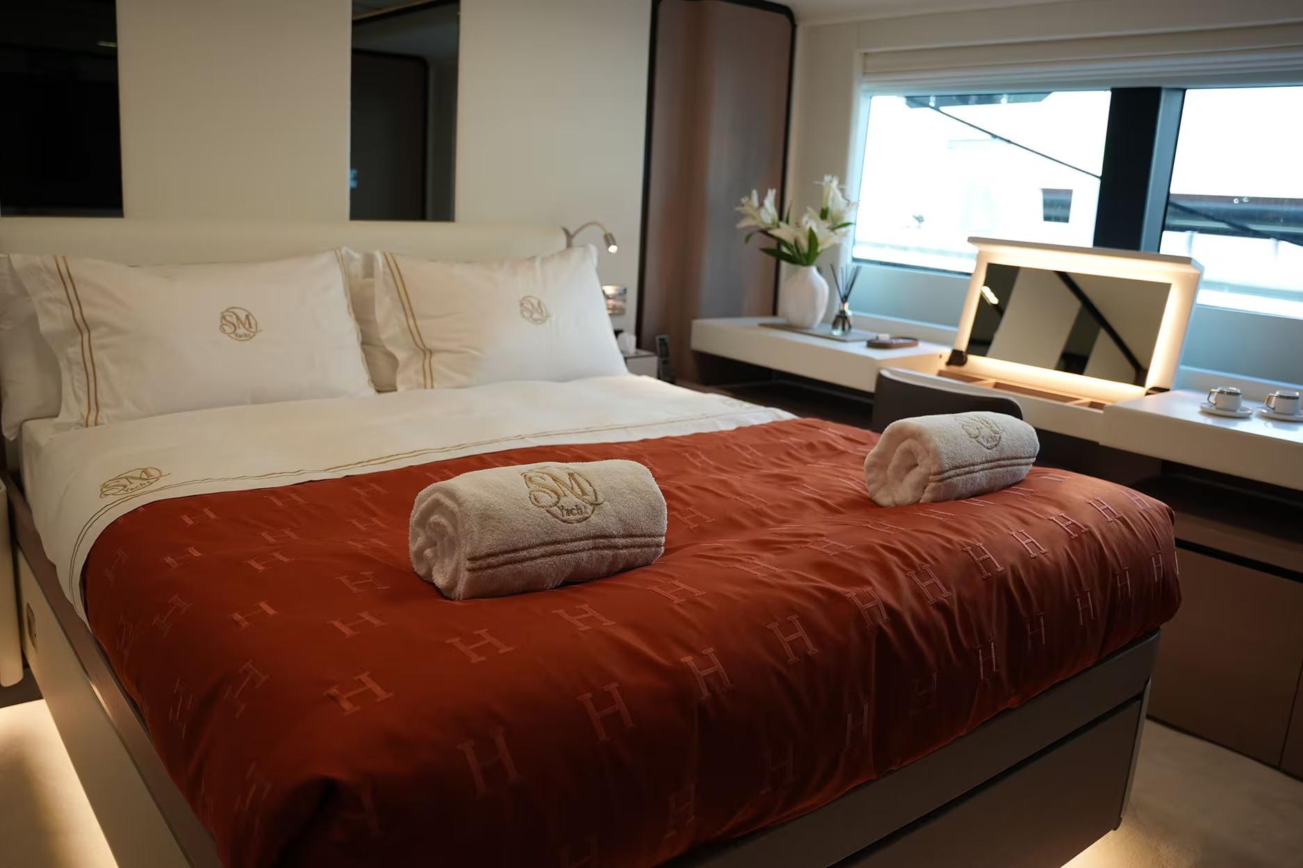 Aggressive lines and a demanding profile define the Majesty 120, with the signature Majesty Yachts windows lining the hull. Extensive use of glass offers an unparalleled connection to the outdoors with low bulwarks allowing for an ornamental glass railing design. Amongst the standout features onboard the new Majesty 120 is a Jacuzzi situated on the sun deck. For optimal guest comfort, there are six cabins, including a full-beam master cabin on the main deck, a rare feature for super yachts of this length. This superyacht boasts 30% larger outdoor entertainment areas compared to any other yacht in its class.