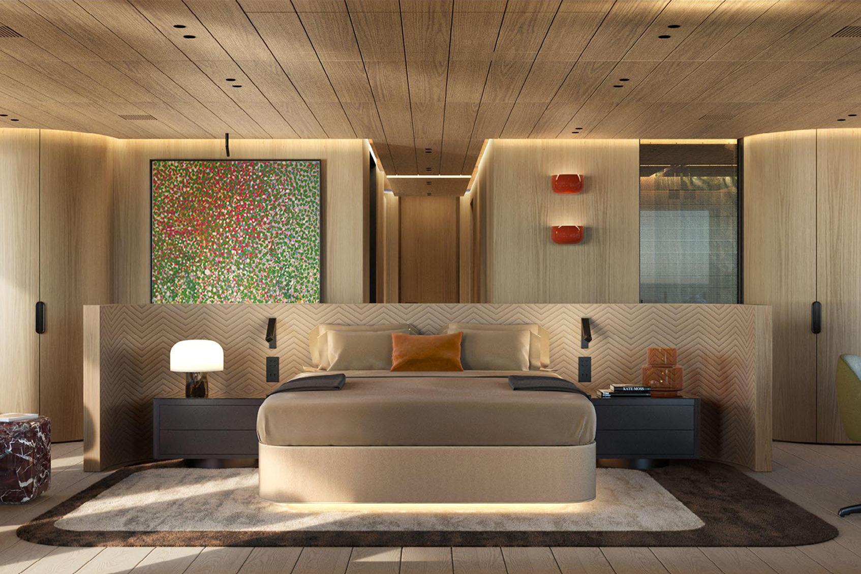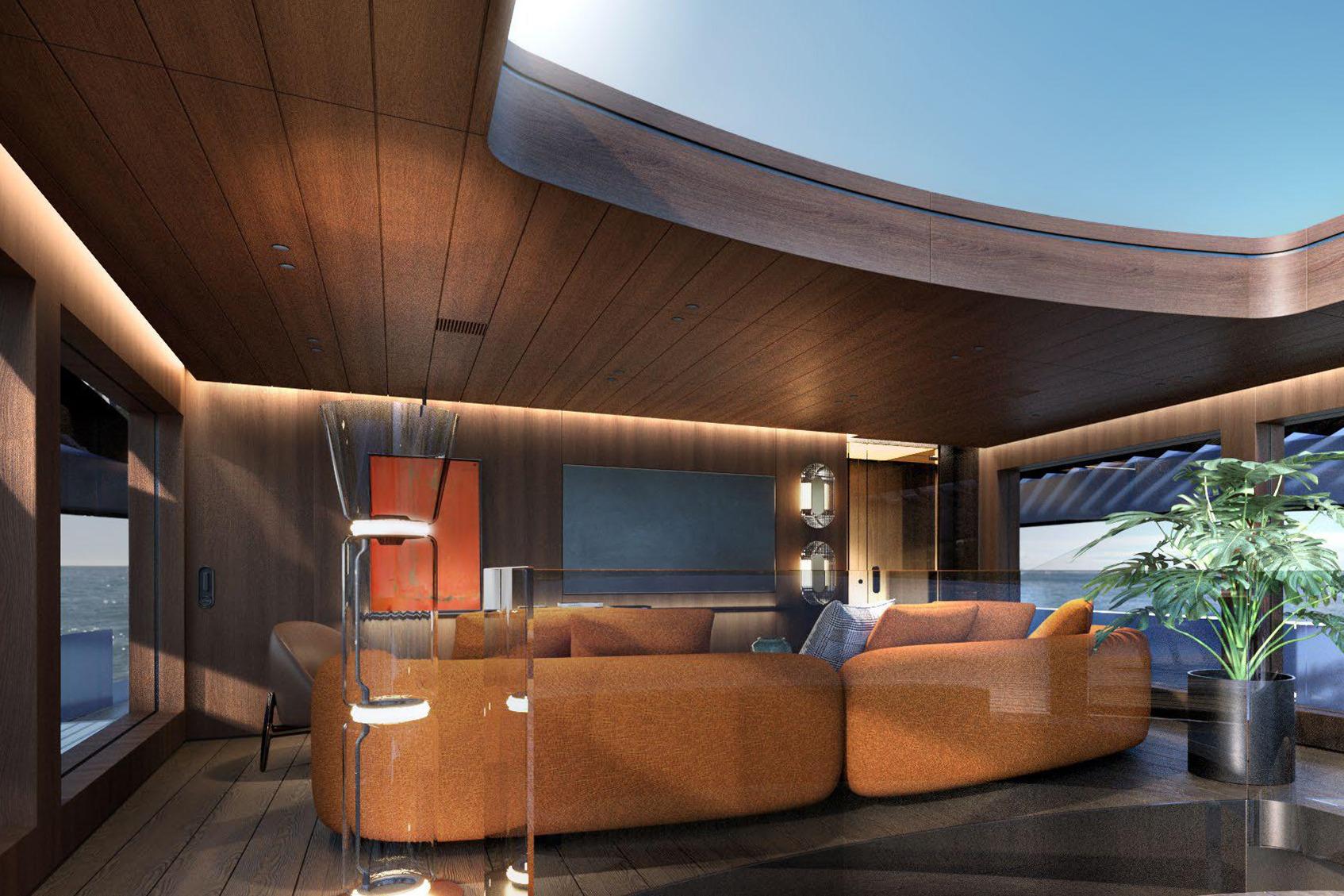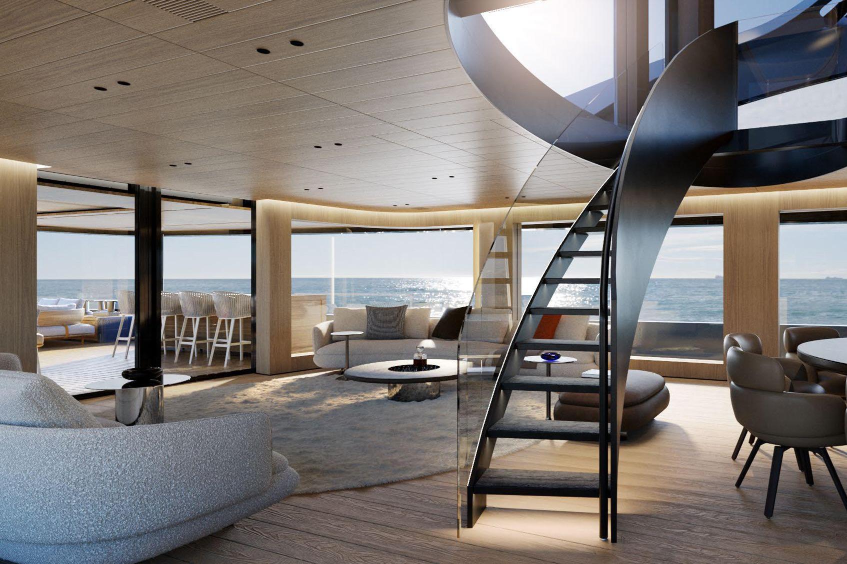 Inside, she blends glass, natural woods, and sculptural contours to create a warm yet precise atmosphere. A central staircase guides the flow between the lounges, the owner’s suite, and the skylounge above. Every detail is attuned to contemporary living and shaped for the visionary owners who will lead the next chapter of the P-Fleet.