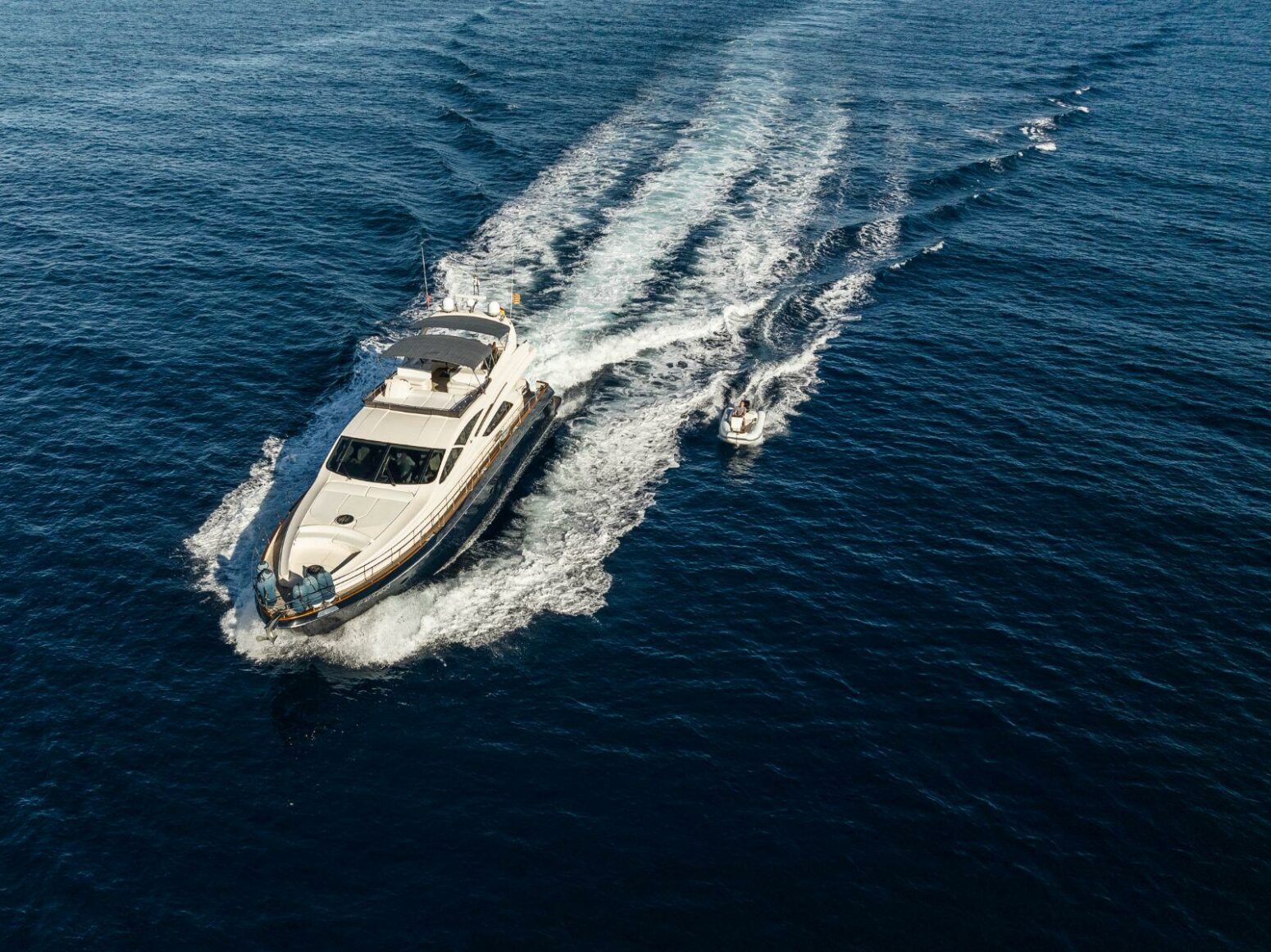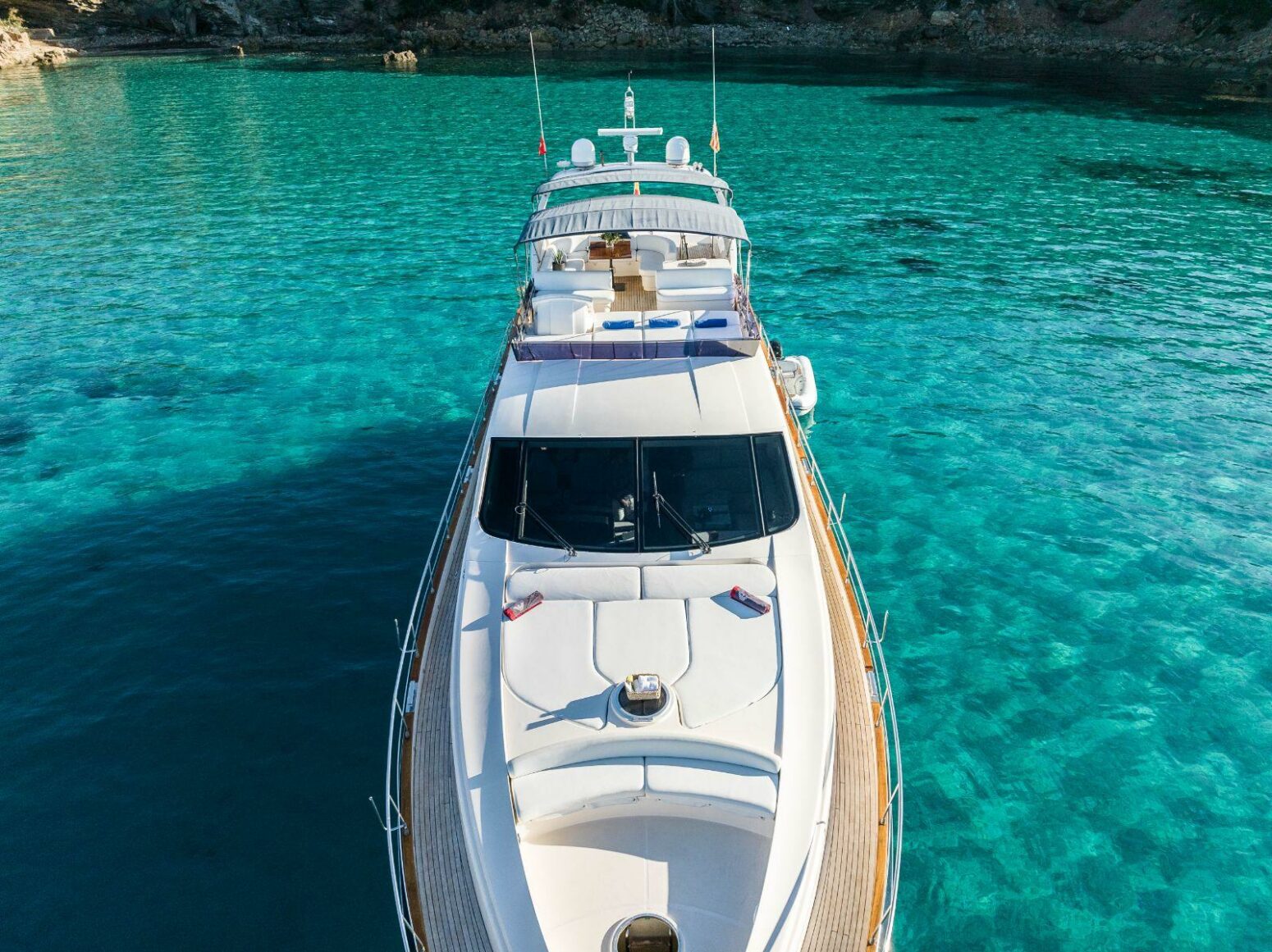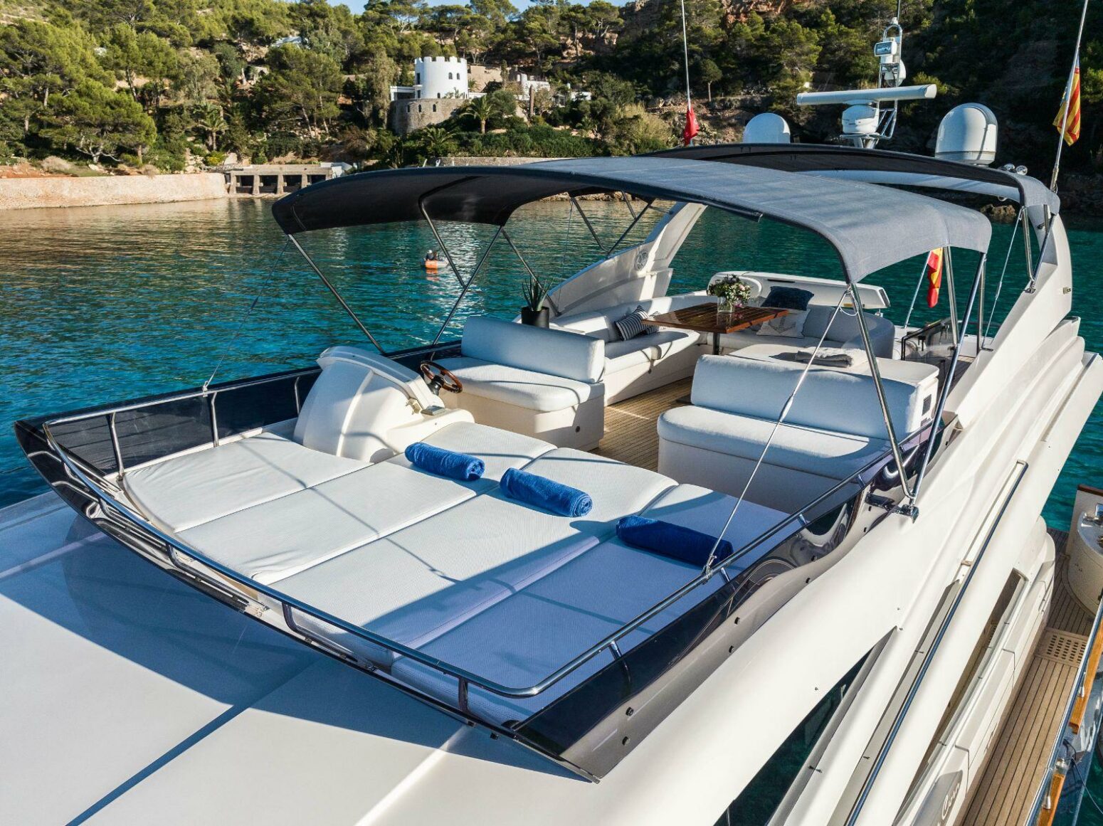 Impulsado por dos motores MAN V12-1550, alcanza una velocidad de crucero de 15 nudos con excelente estabilidad y eficiencia. El espacioso flybridge, la zona de comedor en popa y los soláriums de proa invitan a relajarse bajo el sol mediterráneo, con una tripulación de tres profesionales que garantizan un servicio de primer nivel.